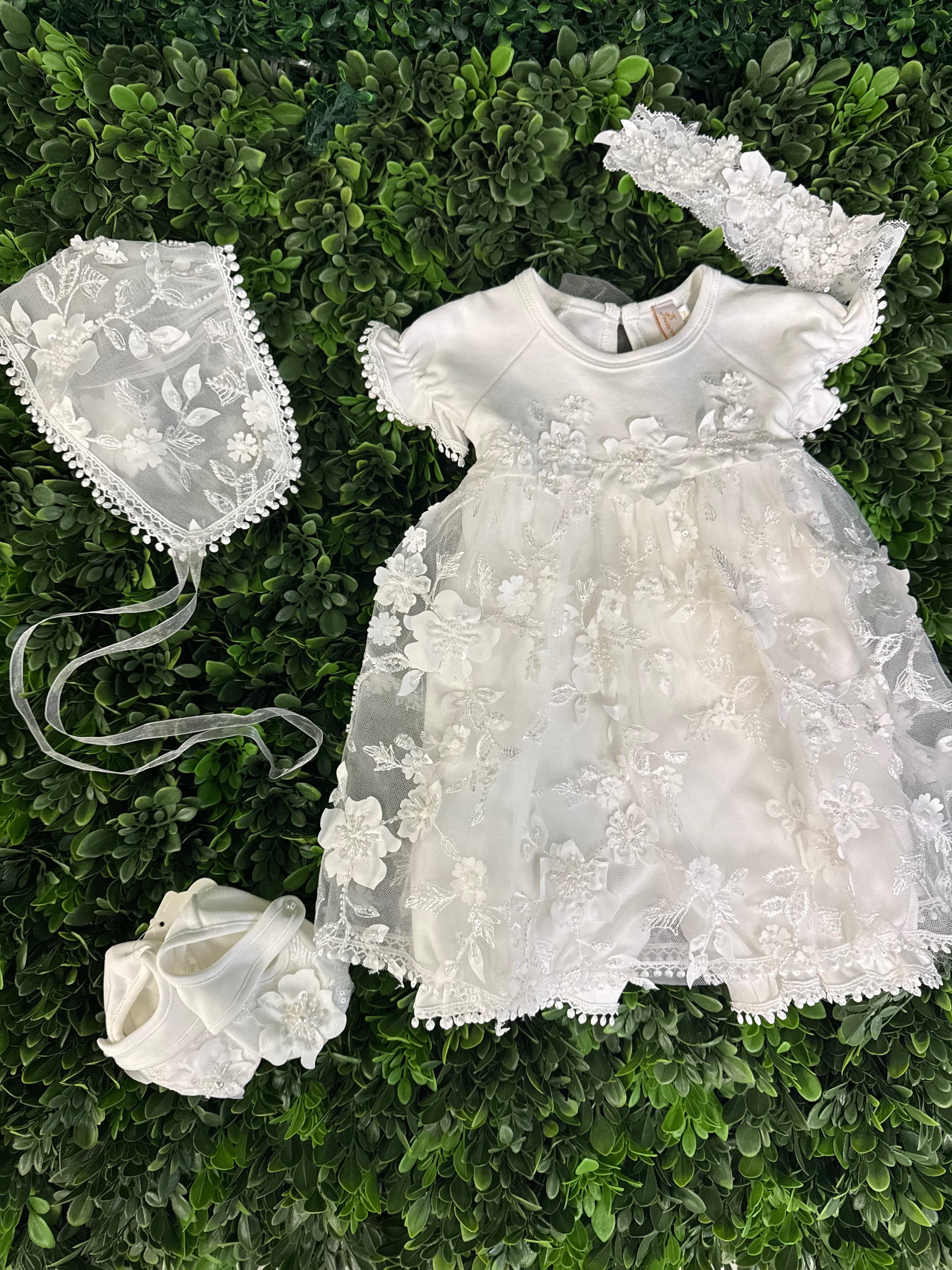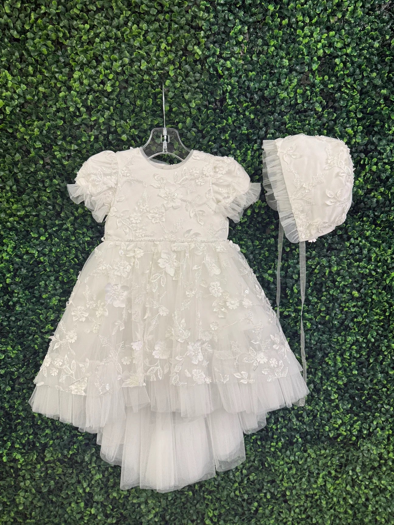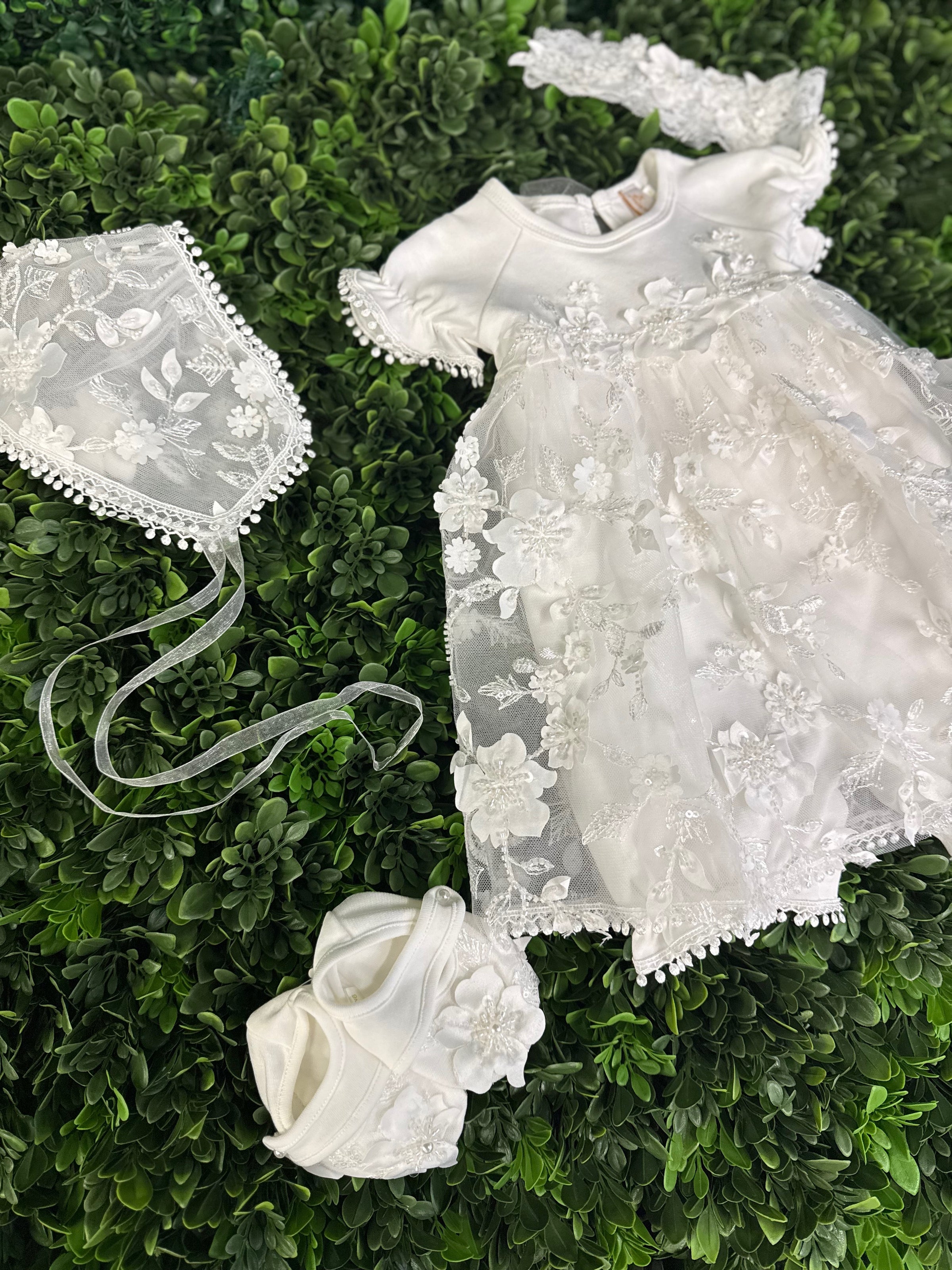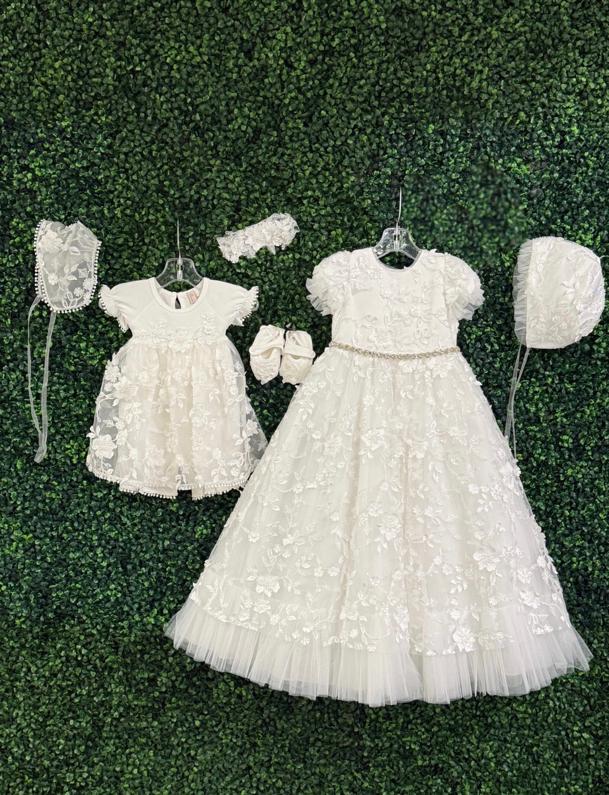A beautiful white 3D beaded floral lace bundle contains two looks! Your choice between a long gown or a sweet high-low. The dress features cap sleeves with ruffle tulle trim. Long gown features a rhinestone accented belt at waistline. Pleated tulle hemline. A soft and comfortable changing outfit to complete the set. The bundle includes gown, opaque bonnet, sheer bonnet, headband, and booties! .
