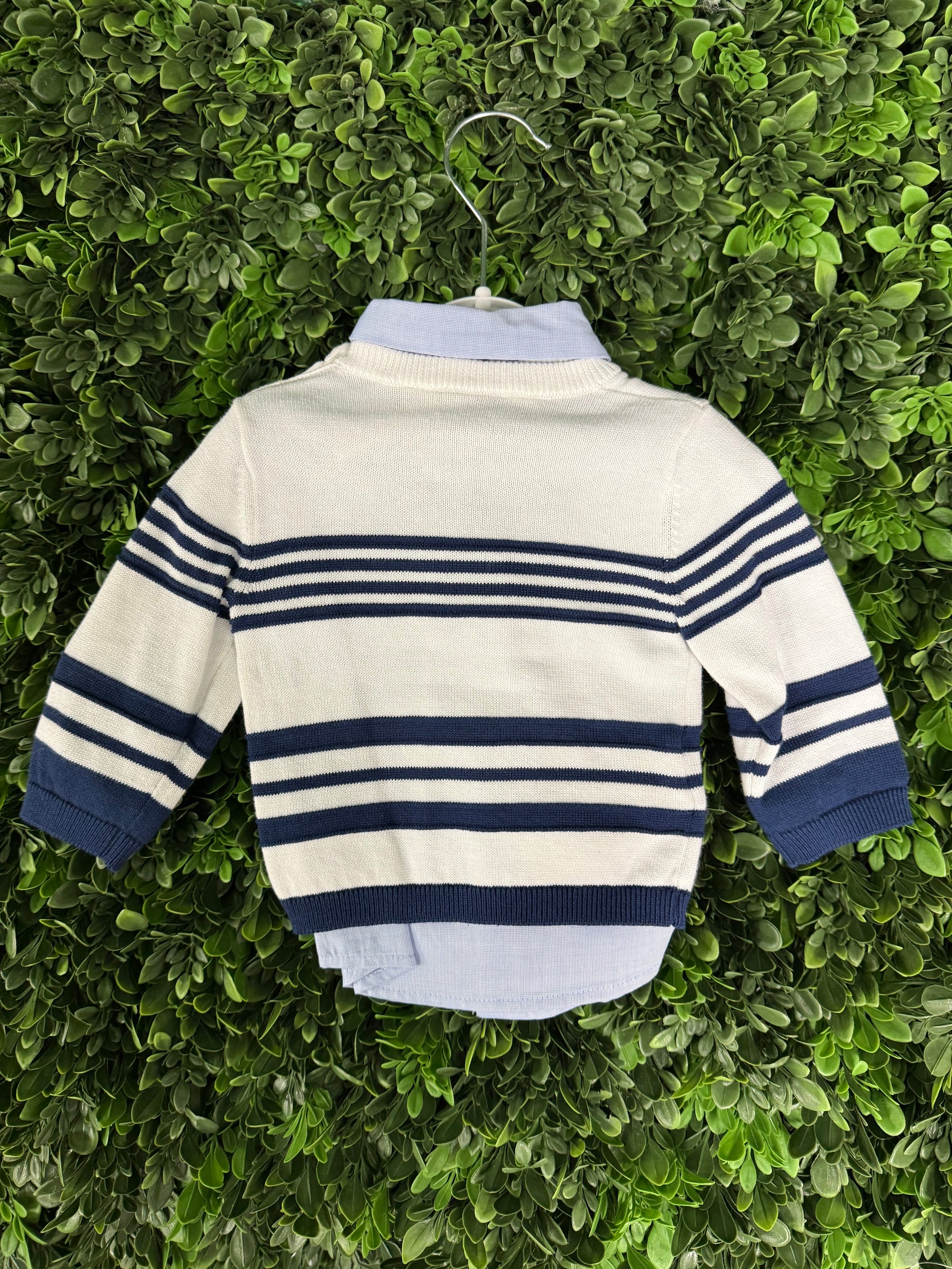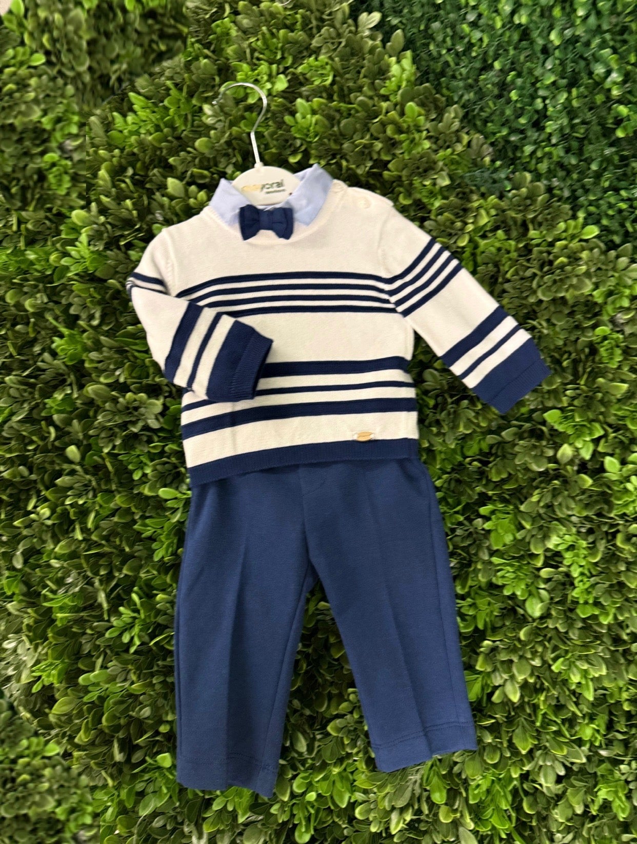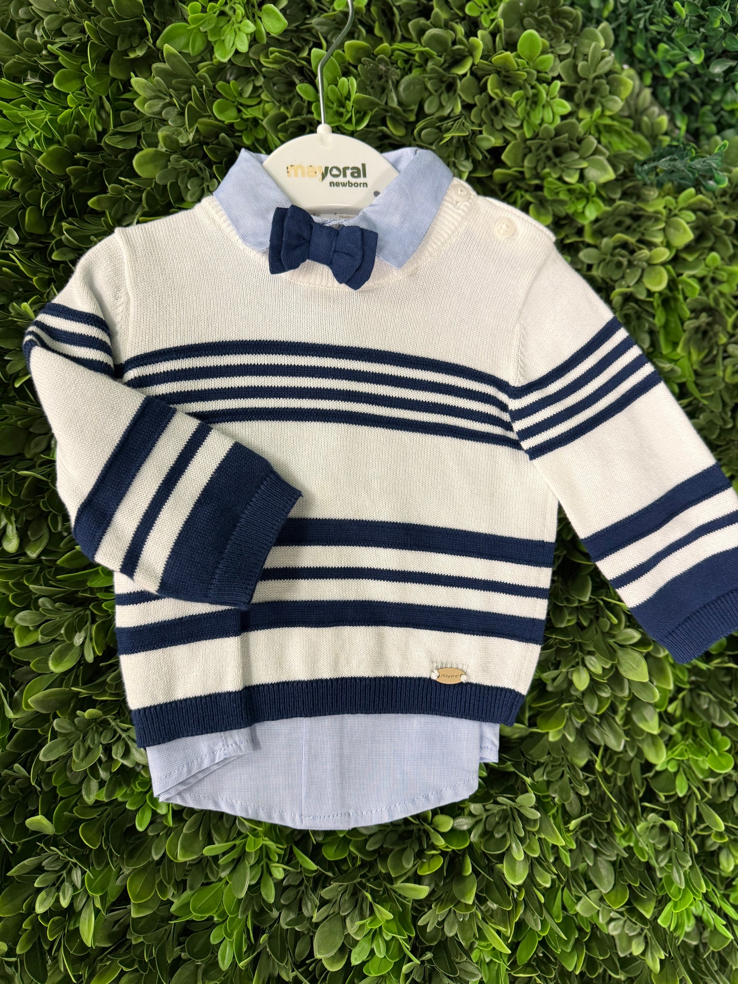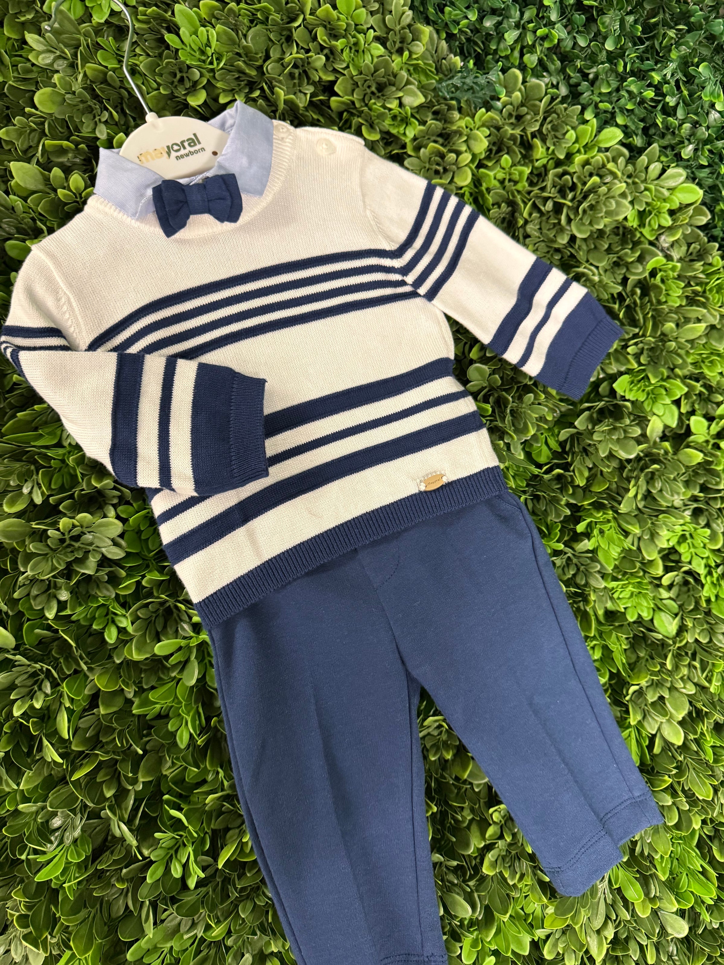 Complete handsome dressy 4pc outfit for infant boy from Mayoral. The navy and white striped knit sweater is 100% cotton. With navy detail along wrist and hem. Button closure on shoulder. Chino’s are made of a cotton blend for extra comfort against delicate skin. Powder Blue button down long sleeve shirt with a matching navy adjustable bowtie. Great for the holidays!