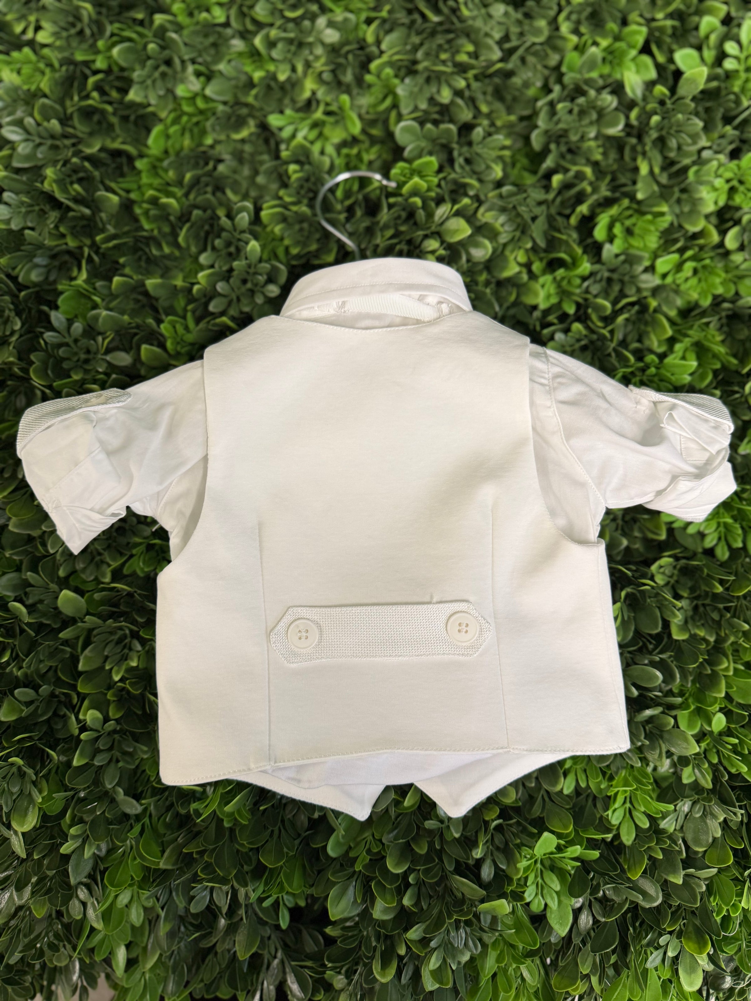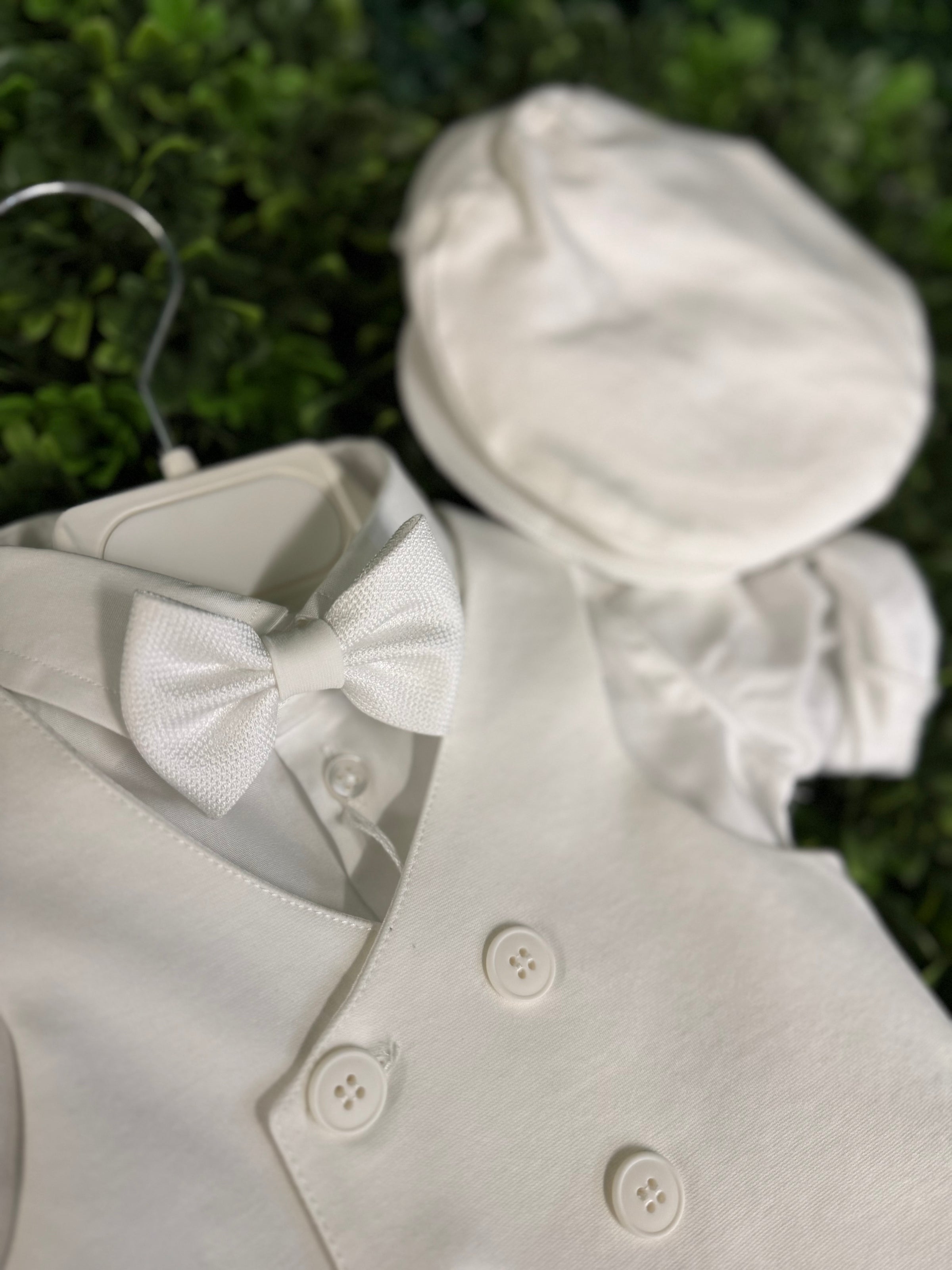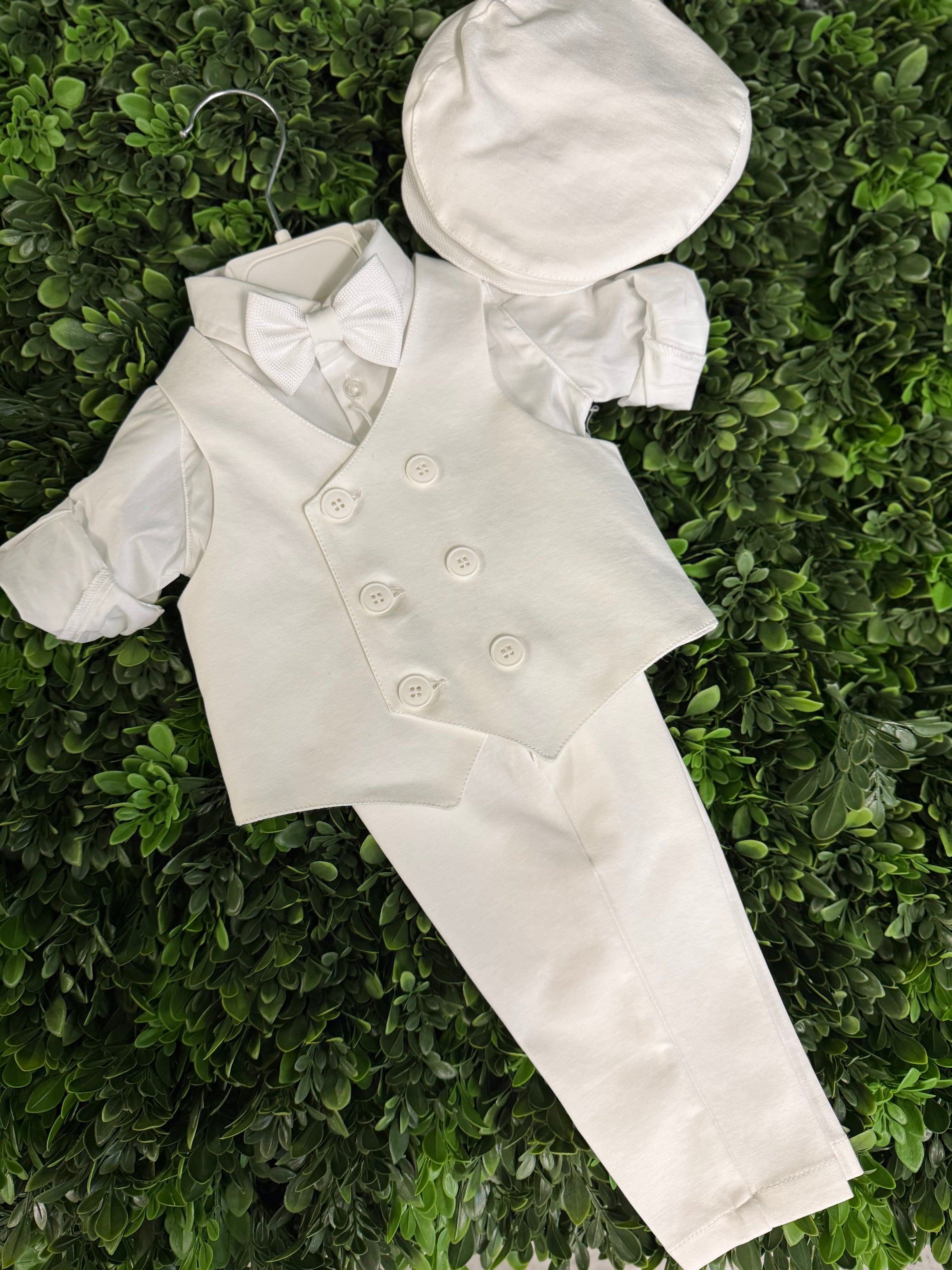 Made in Italy! Elegant and traditional, this Italian 5 piece set is made of soft viscose pants, a double breasted vest, bow tie, and cap. Soft cotton onesie style dress shirt for easy dressing. Pants are adjustable along the waistline. True European elegance.