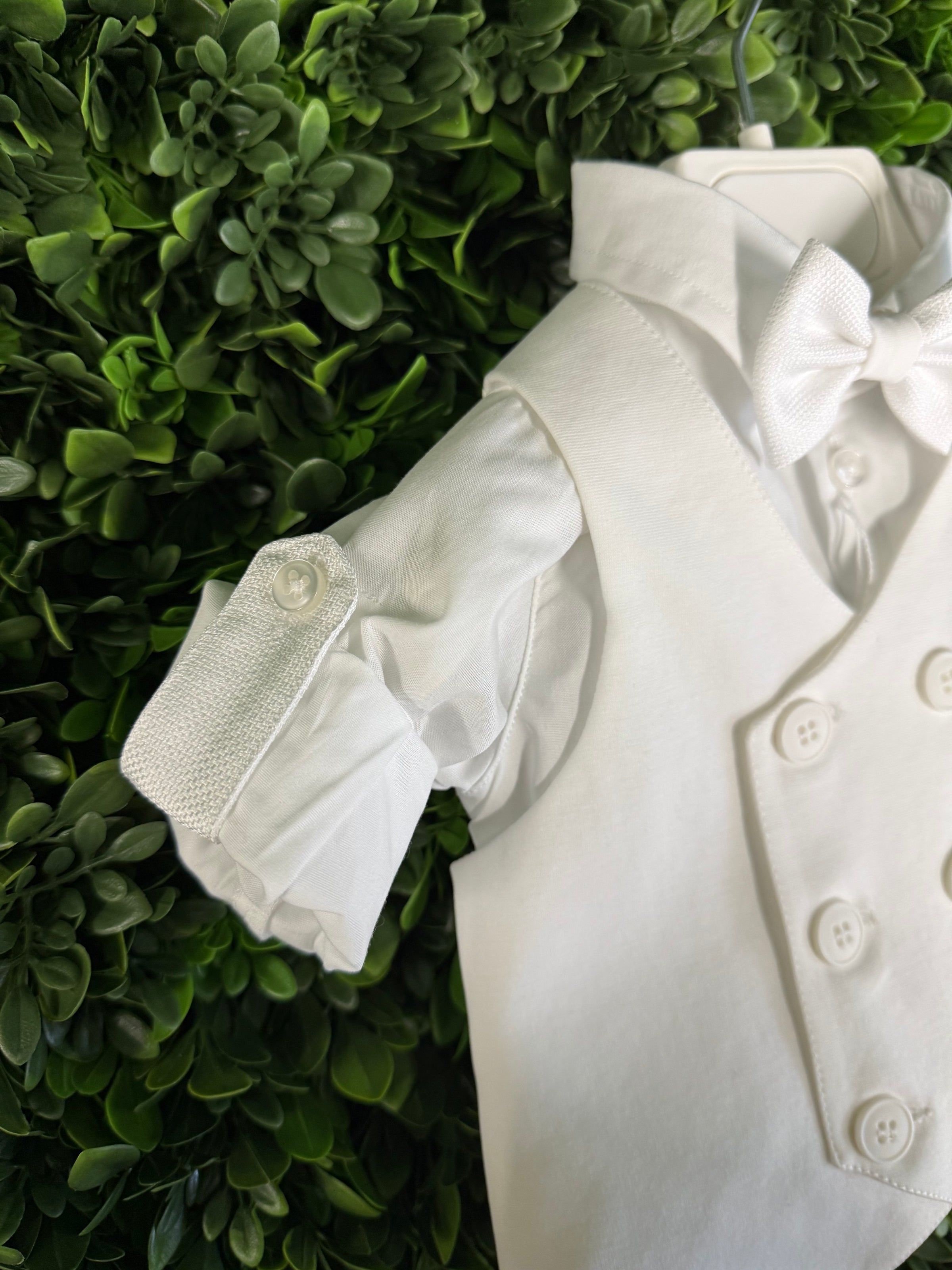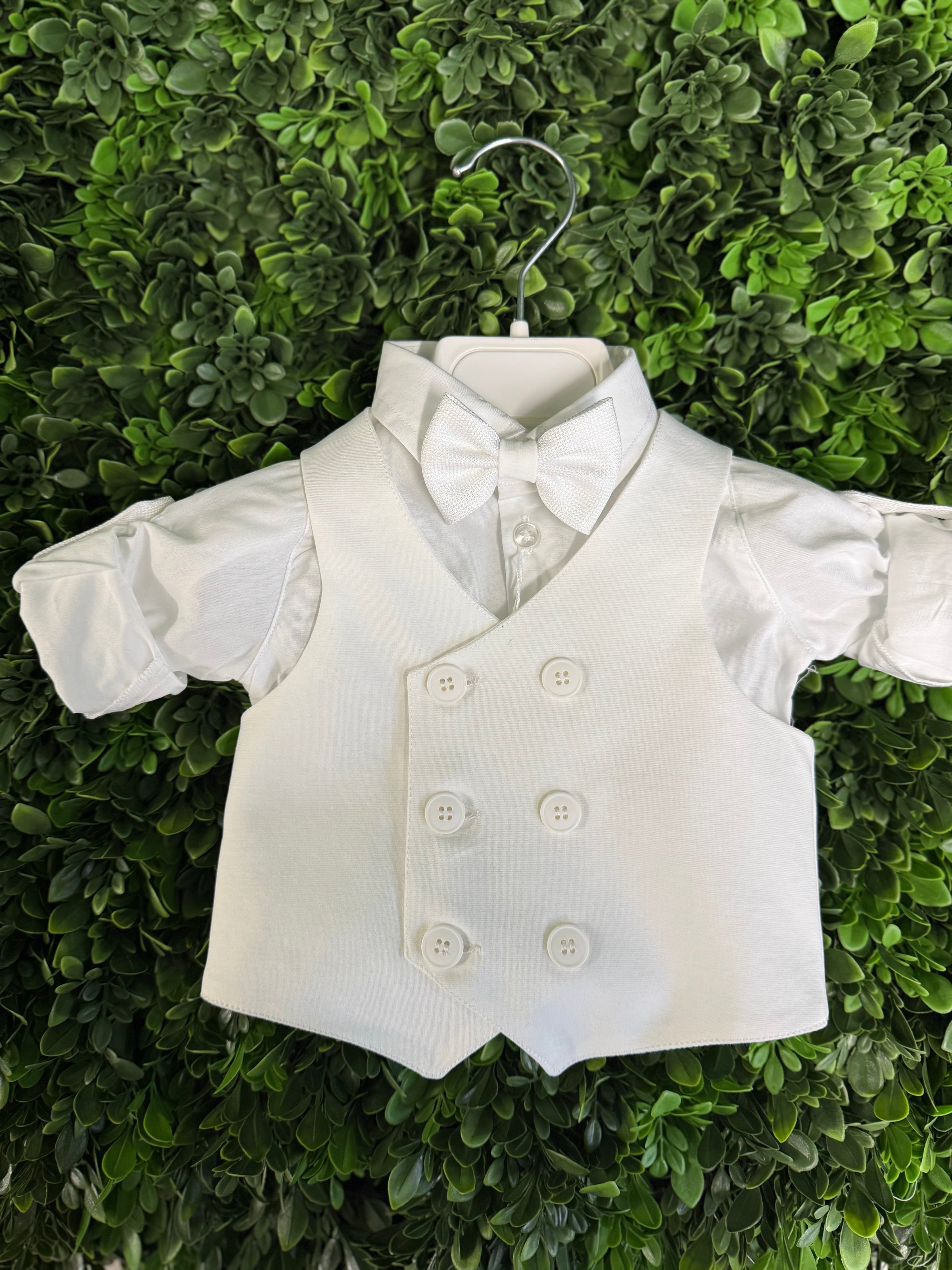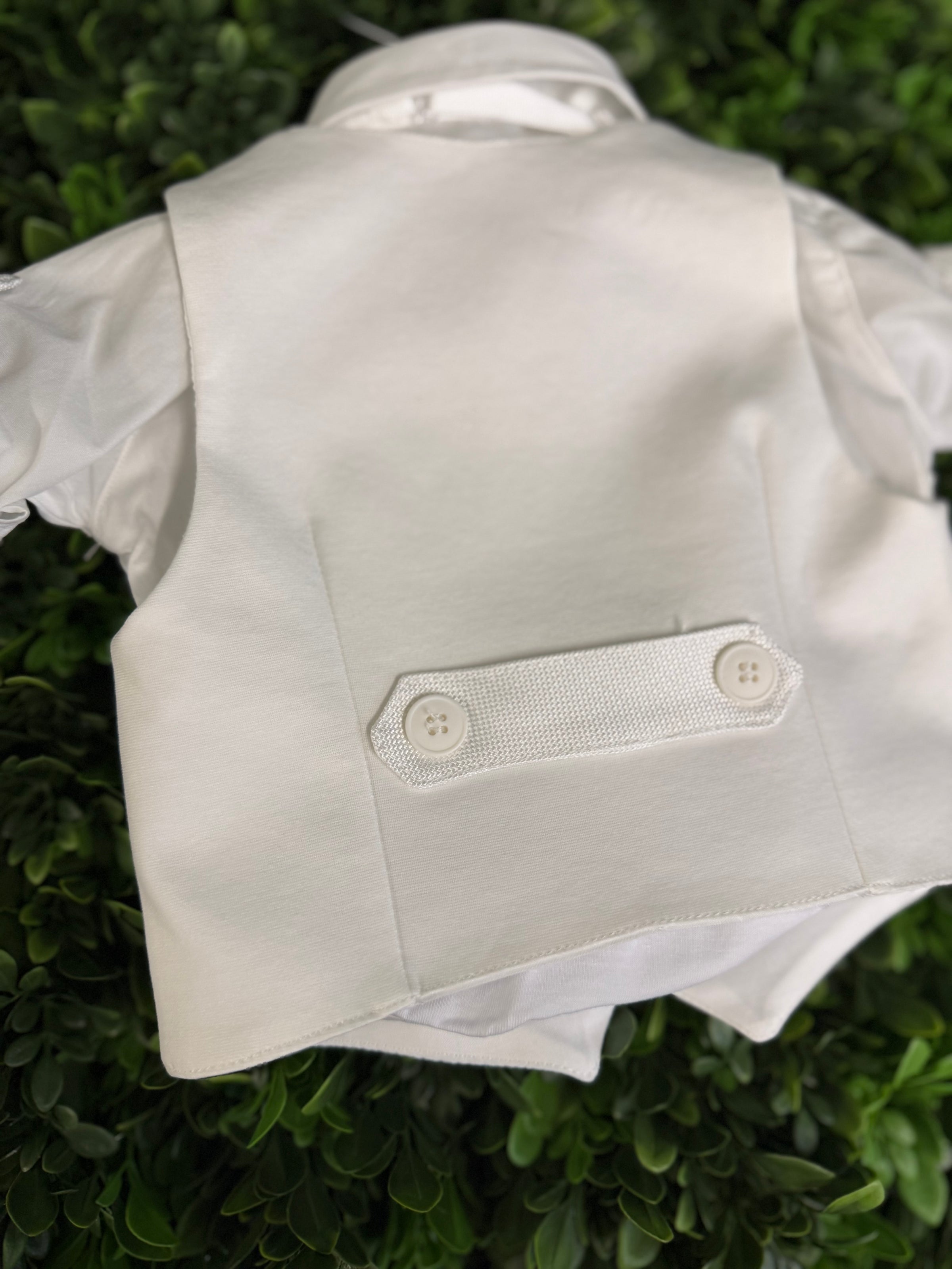 Made in Italy! Elegant and traditional, this Italian 5 piece set is made of soft viscose pants, a double breasted vest, bow tie, and cap. Soft cotton onesie style dress shirt for easy dressing. Pants are adjustable along the waistline. True European elegance.