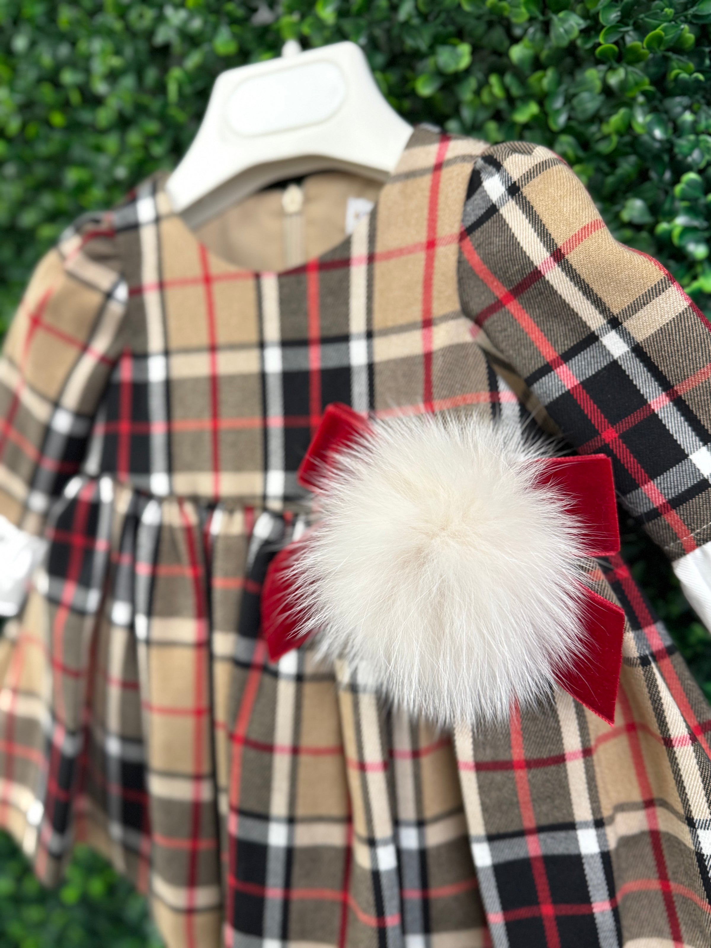 Made in Italy!  A stunning holiday dress perfect for any occasion.  Dress is made with a classic check tartan featuring a removable red bow.  White flounce sleeve for added vintage charm.  Zipper closure for ease.  Matching brother also available!