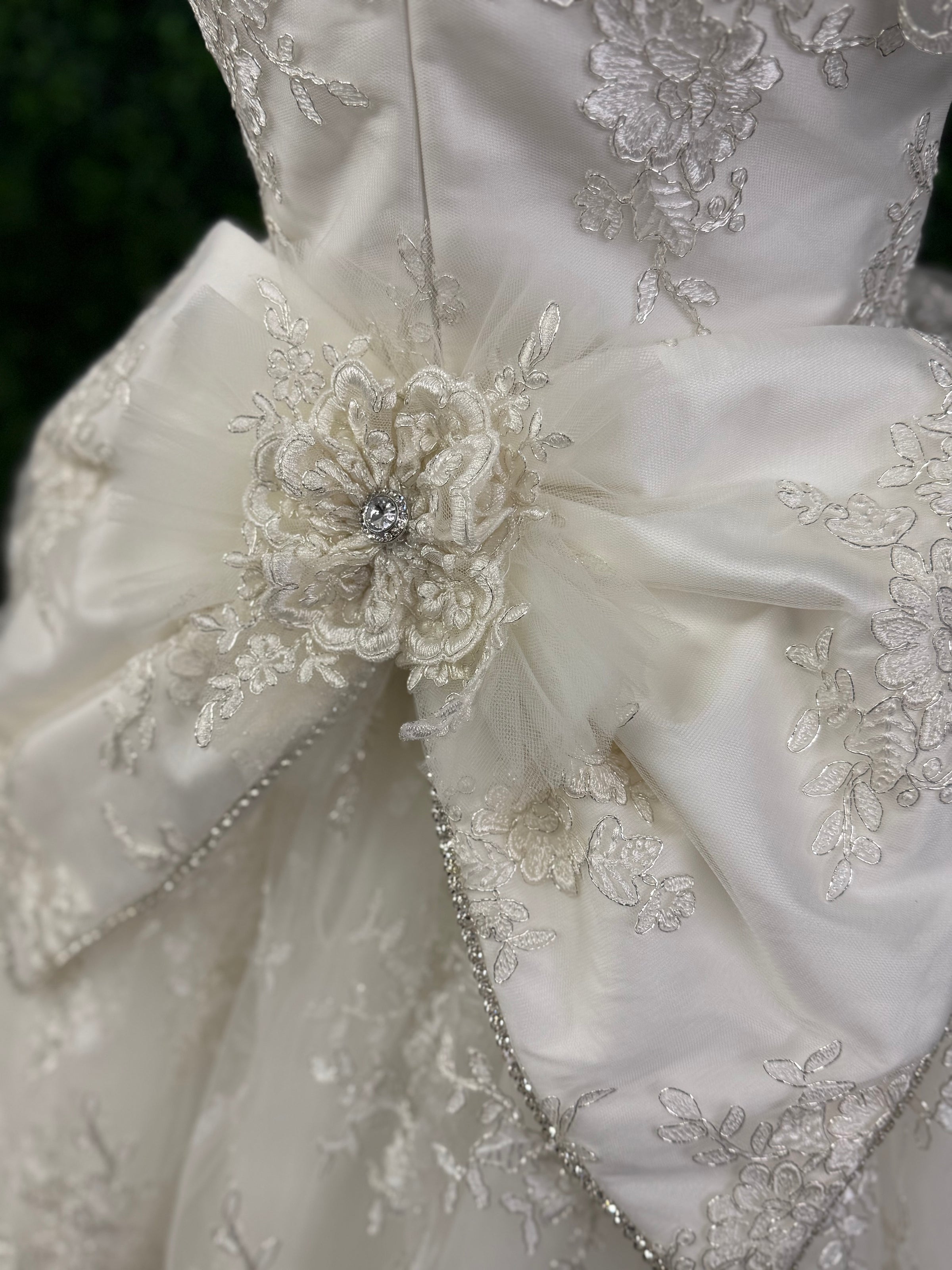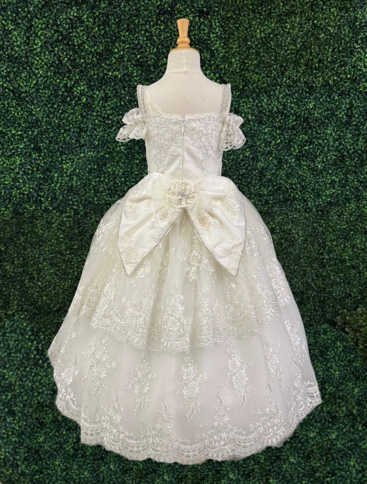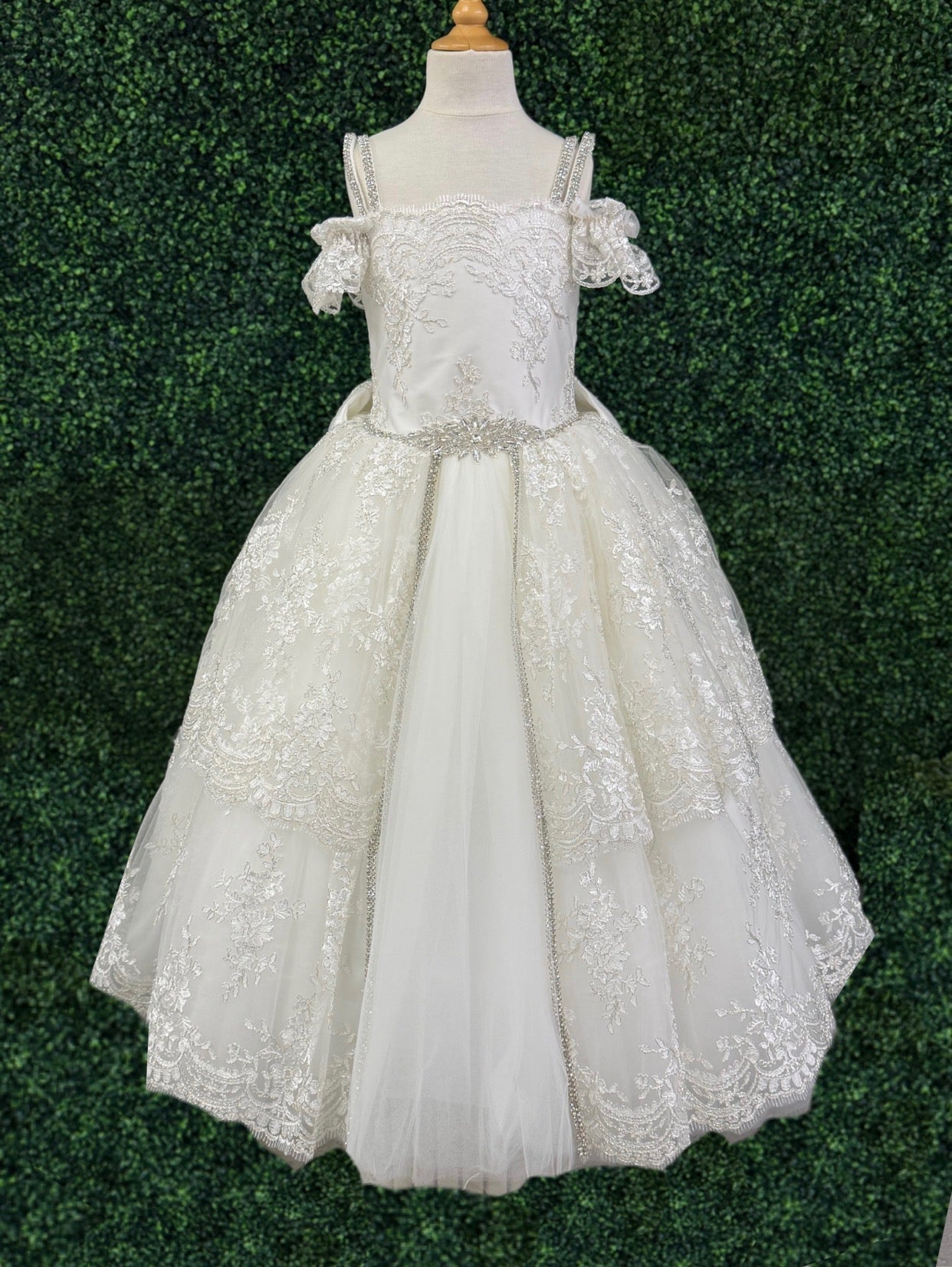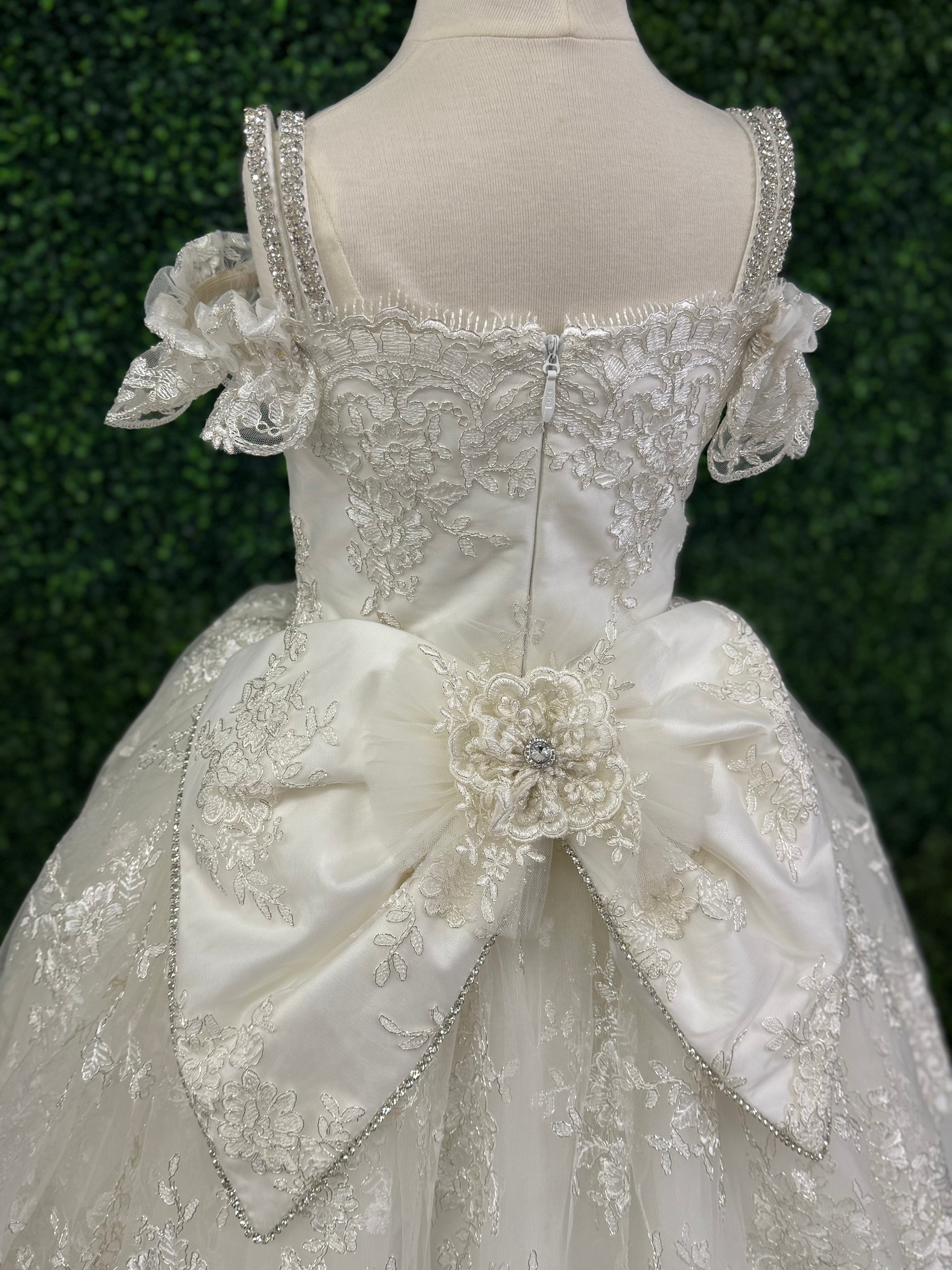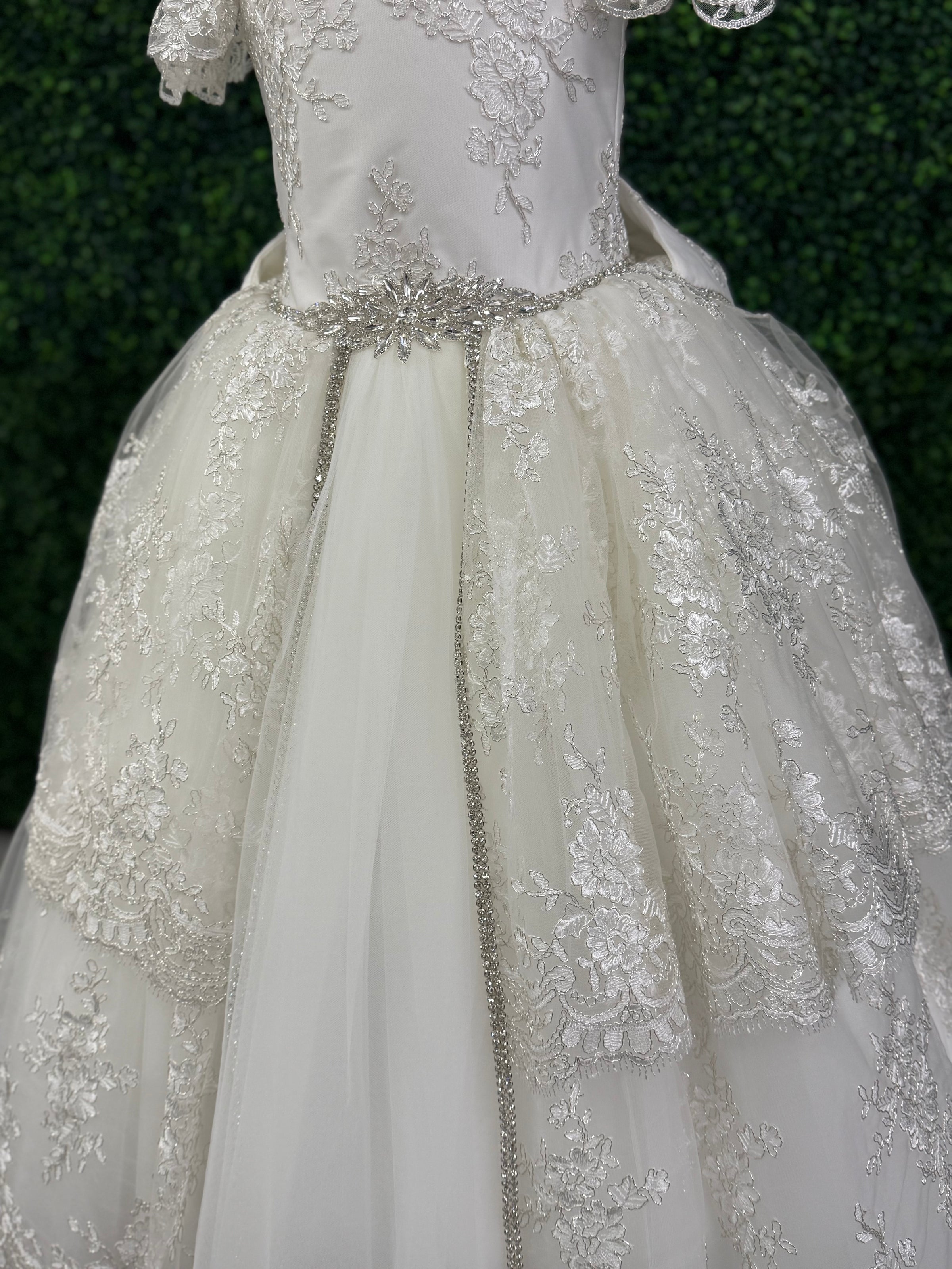Stunning Evana by Piccolo Bacio! Custom couture designed gown with stunning floral lace bodice with a square neckline lined with scalloped lace. Adorned with rhinestone belt at waistline. Lame puff sleeve with rhinestone straps. Split Front Lace and tulle skirt with butterfly bow for drama. Back of dress features tiered lace.. Contact us for customization and sizing inquiries.