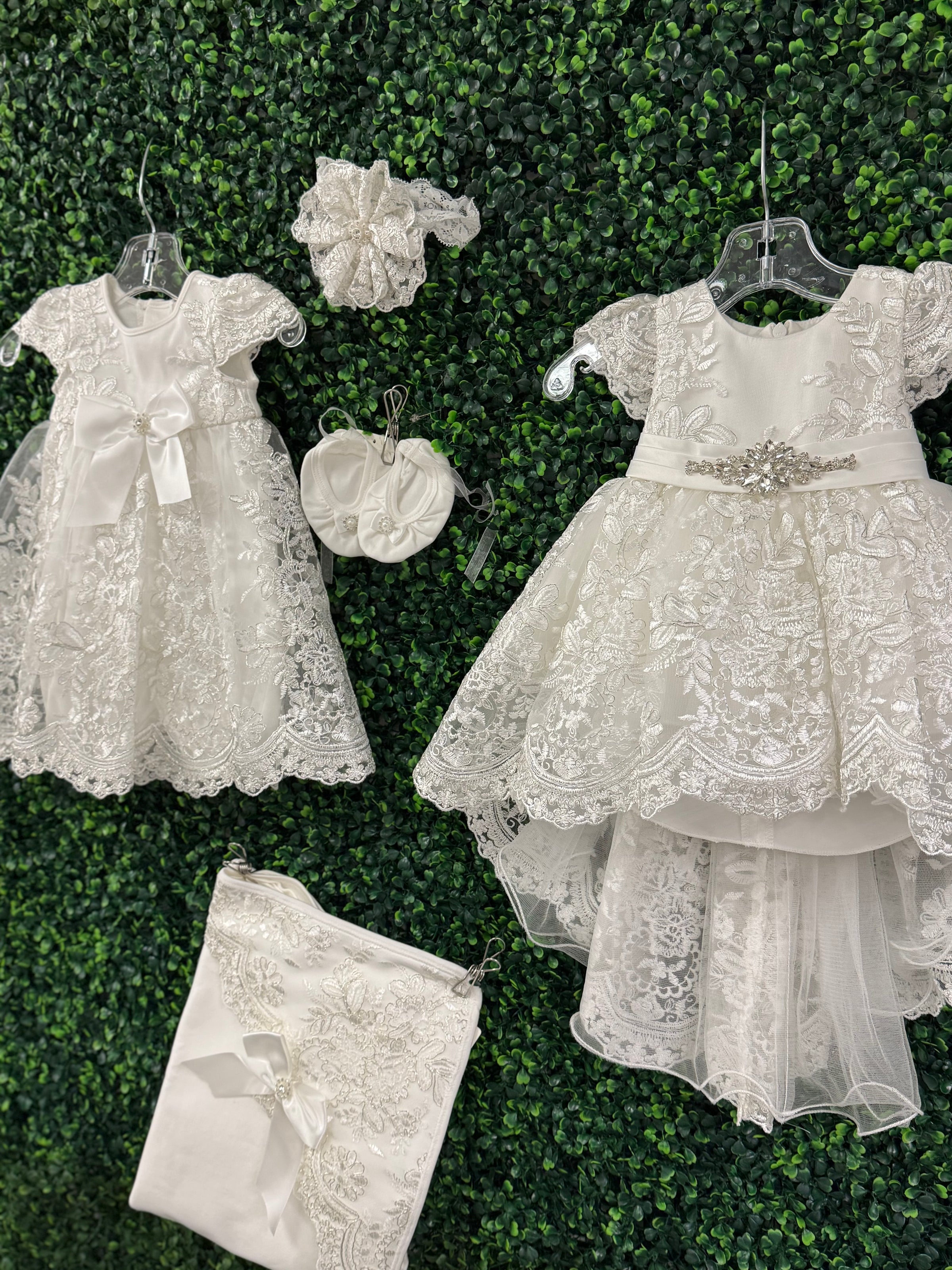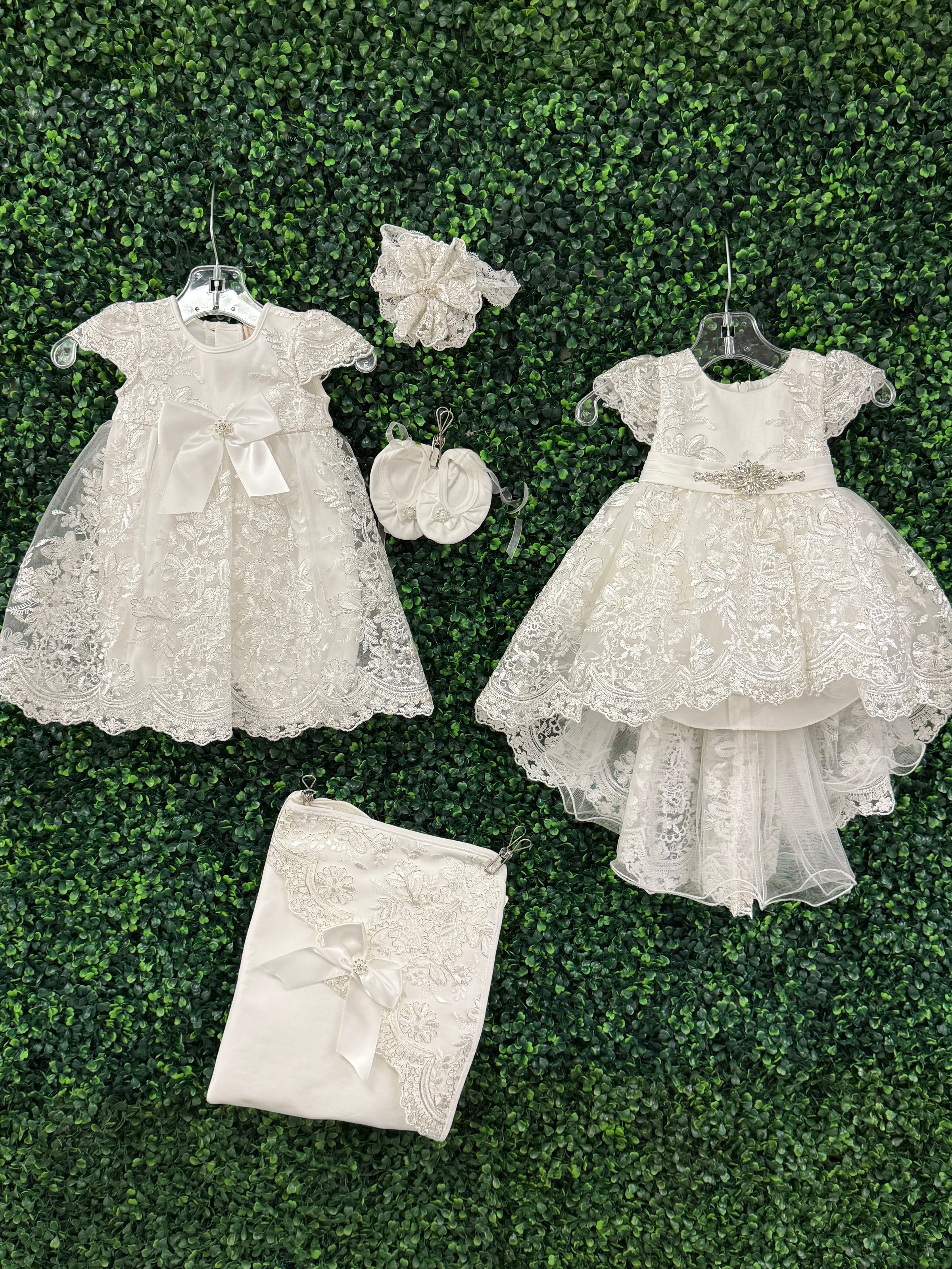 A perfectly curated set. This beautiful set includes your choice of either a high-low or long gown, changing romper, blanket, headband, and booties. Bonnet is included with the long gown. The stunning high-low dress with an amazing back train. Great for pictures when the train is extended or while your girl walks. Dress is perfect for Baptism, Flower girl, Birthday dress or for a special party. The romper dress is perfectly comfortable and provides an illusion of a dress. Metallic scallop lace, satin bow and snap button. All cotton!