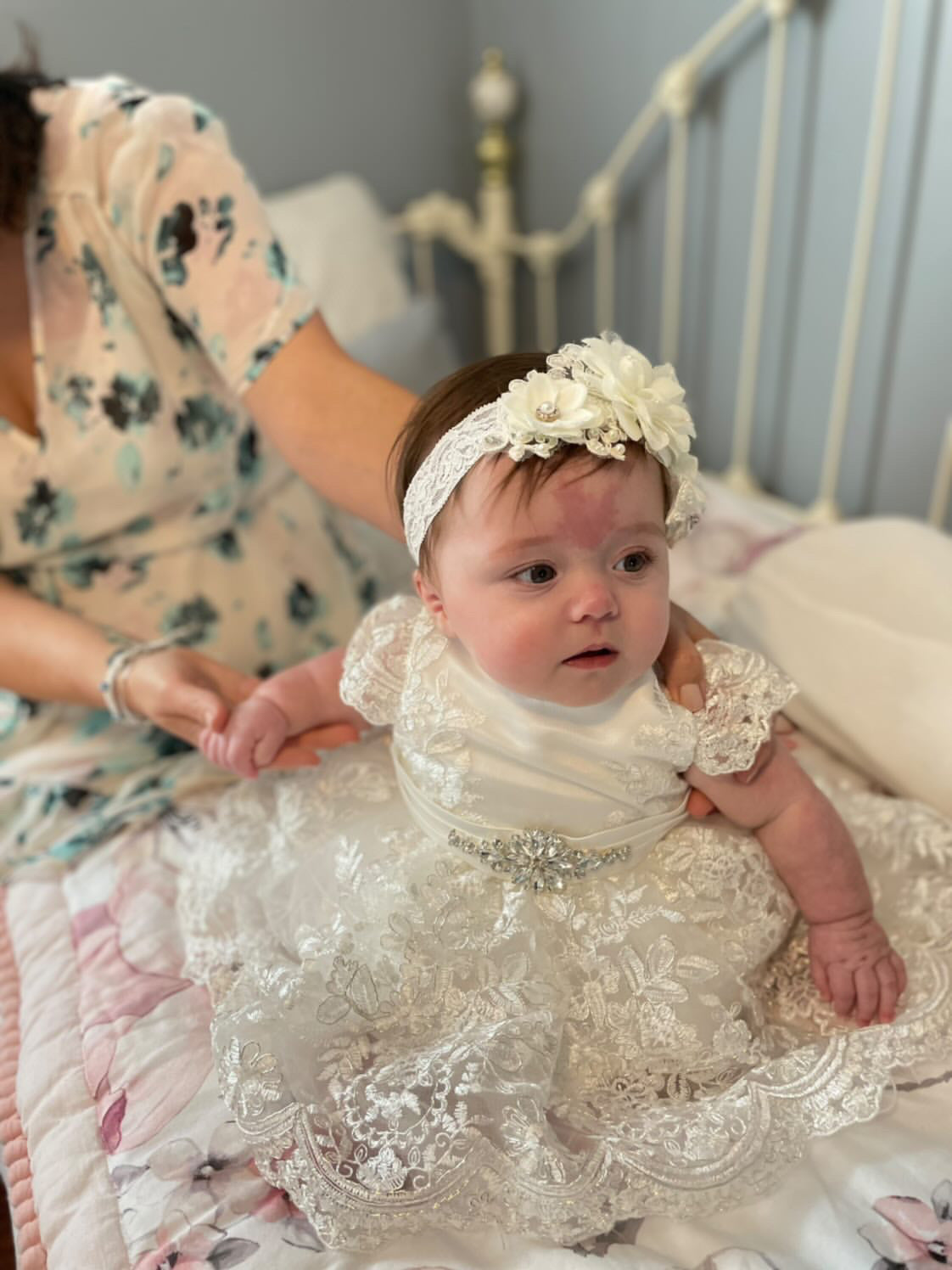After use, we do recommend having your outfit dry-cleaned by an experienced dry-cleaner that will know how to treat your special items and materials with care. Having your items dry-cleaned will help to remove any drool, spit-up or natural oils left from passing baby around, that may not be seen now, but will discolor over time if left uncleaned.