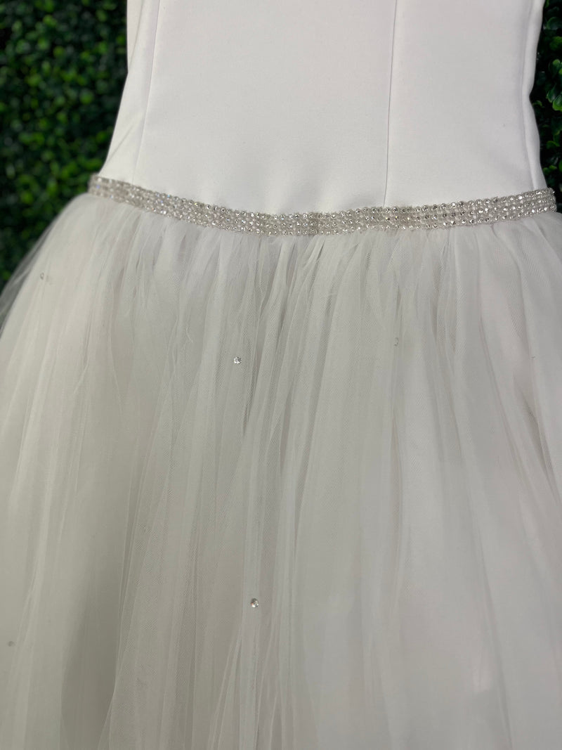Christie Helen girls’ communion dress, halter top drop waist bodice with rhinestone detailing, along with the waistline. Beautiful strappy back detailing. Tulle skirt with rhinestone appliqué. Great for your little girls communion day. FINAL SALE. Dress is in great condition.
