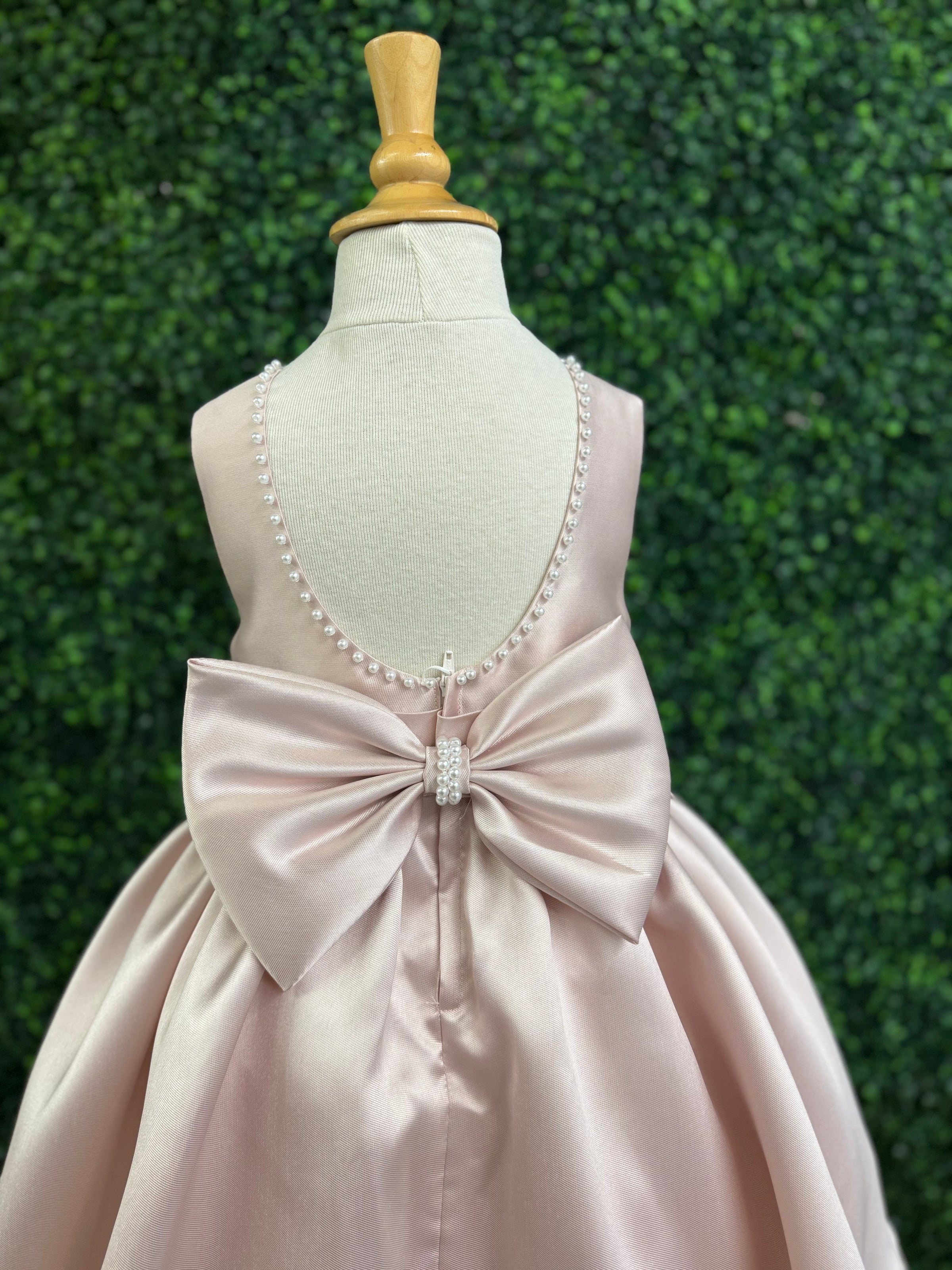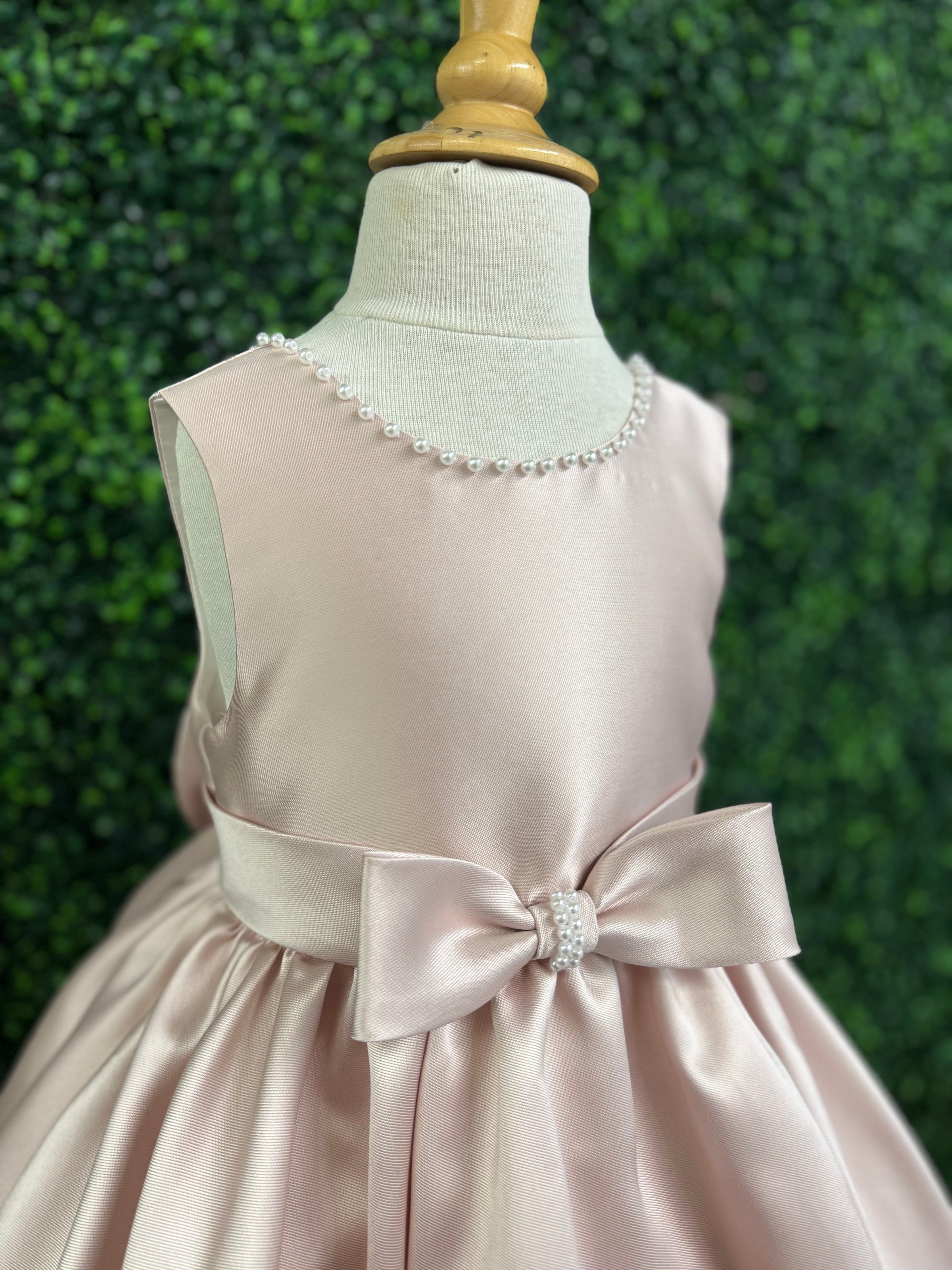 Timeless, elegant, and effortlessly refined—this dusty pink occasion dress is the definition of classic beauty. Designed in a luxurious satin finish, it offers a soft, luminous glow that feels both delicate and elevated for life’s most meaningful moments.  The bodice features a graceful scoop neckline adorned with hand-placed pearl trim, adding a subtle touch of sophistication. At the front, a statement bow with pearl detailing creates a focal point that is both charming and polished. The structured silhouette flows into a full, voluminous skirt, giving the dress a regal presence with every step.  From the back, a perfectly tailored sash and bow detail complete the look, ensuring beauty from every angle.  Perfect for baptisms, christenings, communions, weddings, and special celebrations, this piece is designed to be cherished.