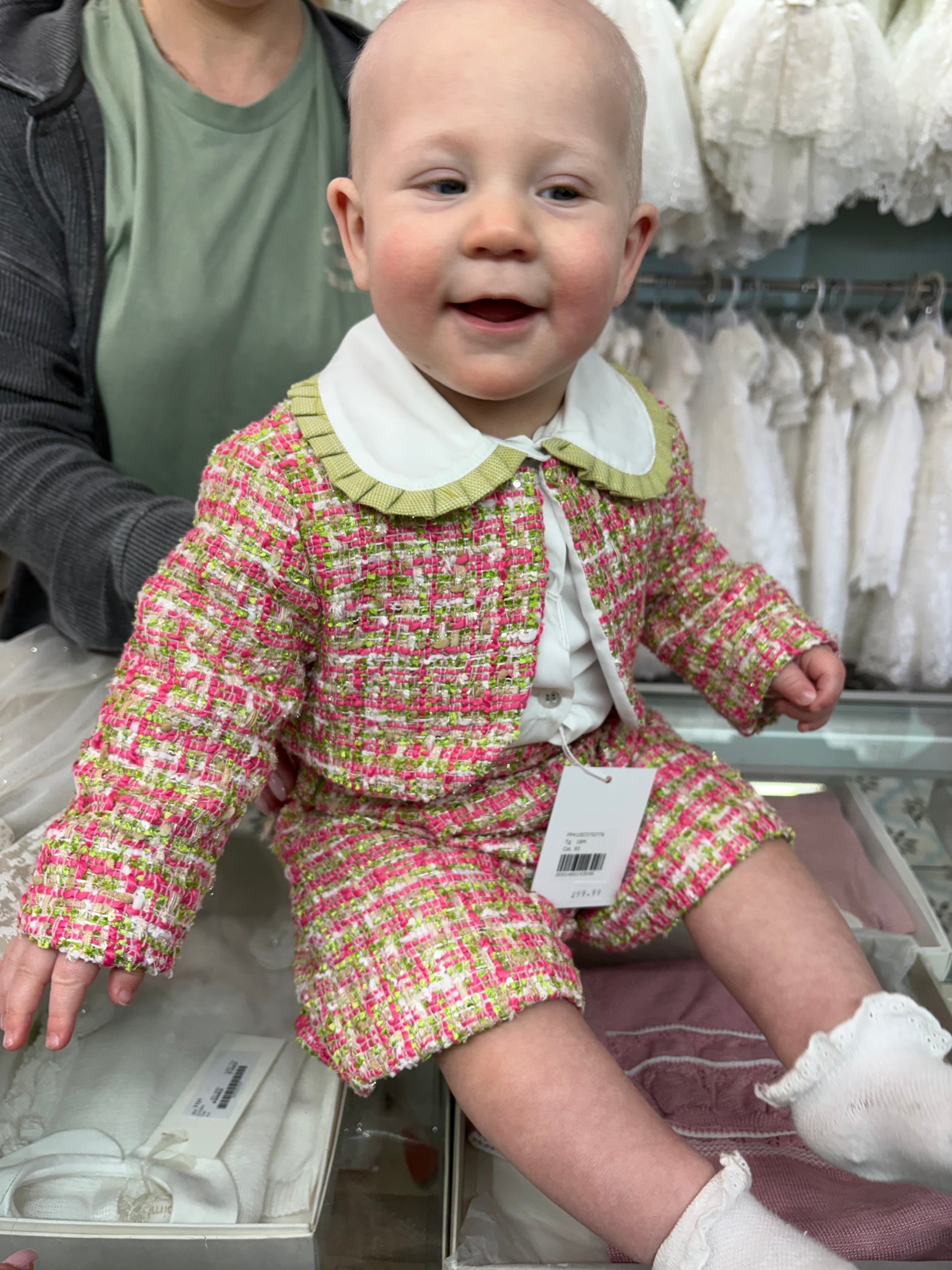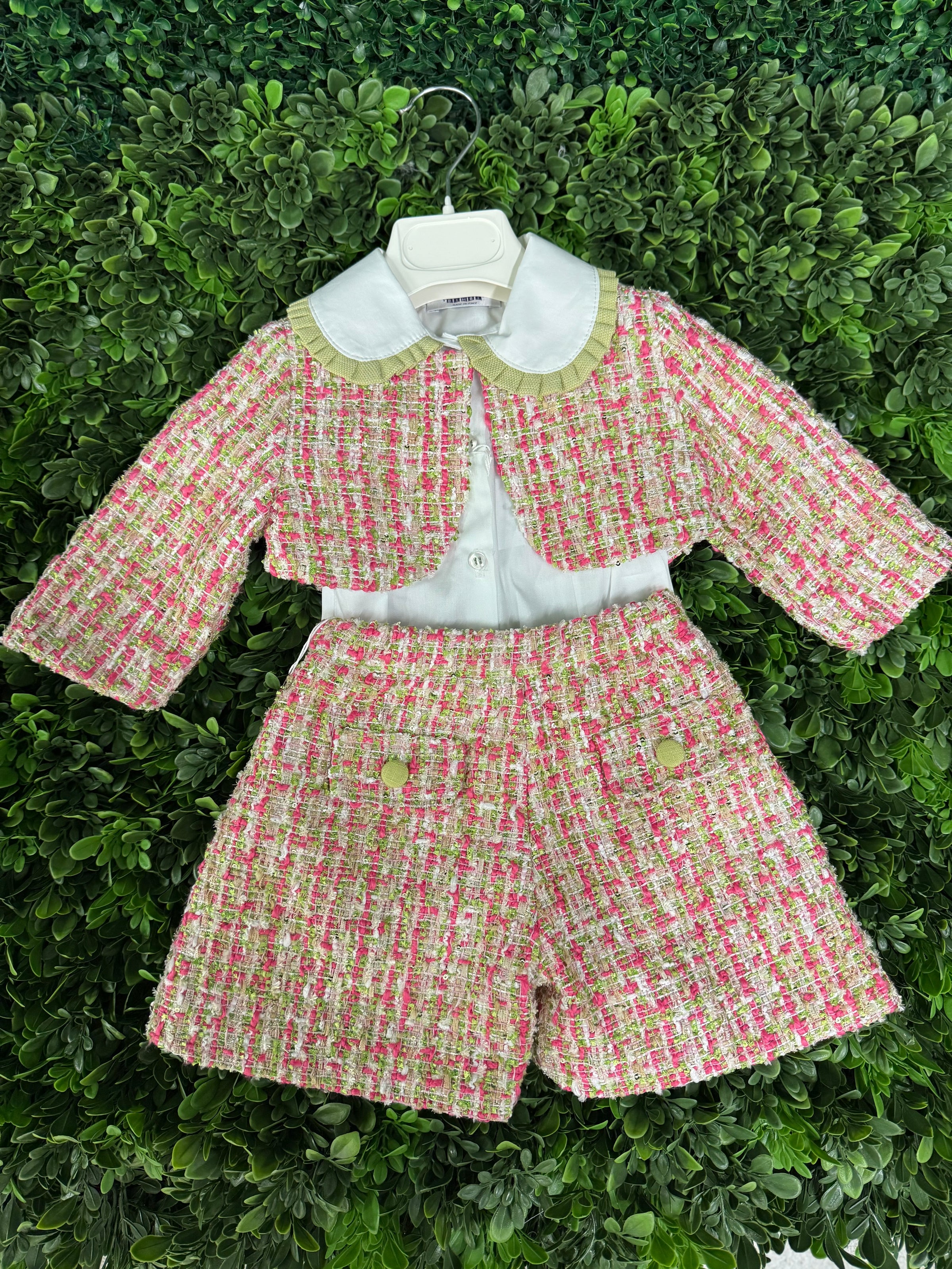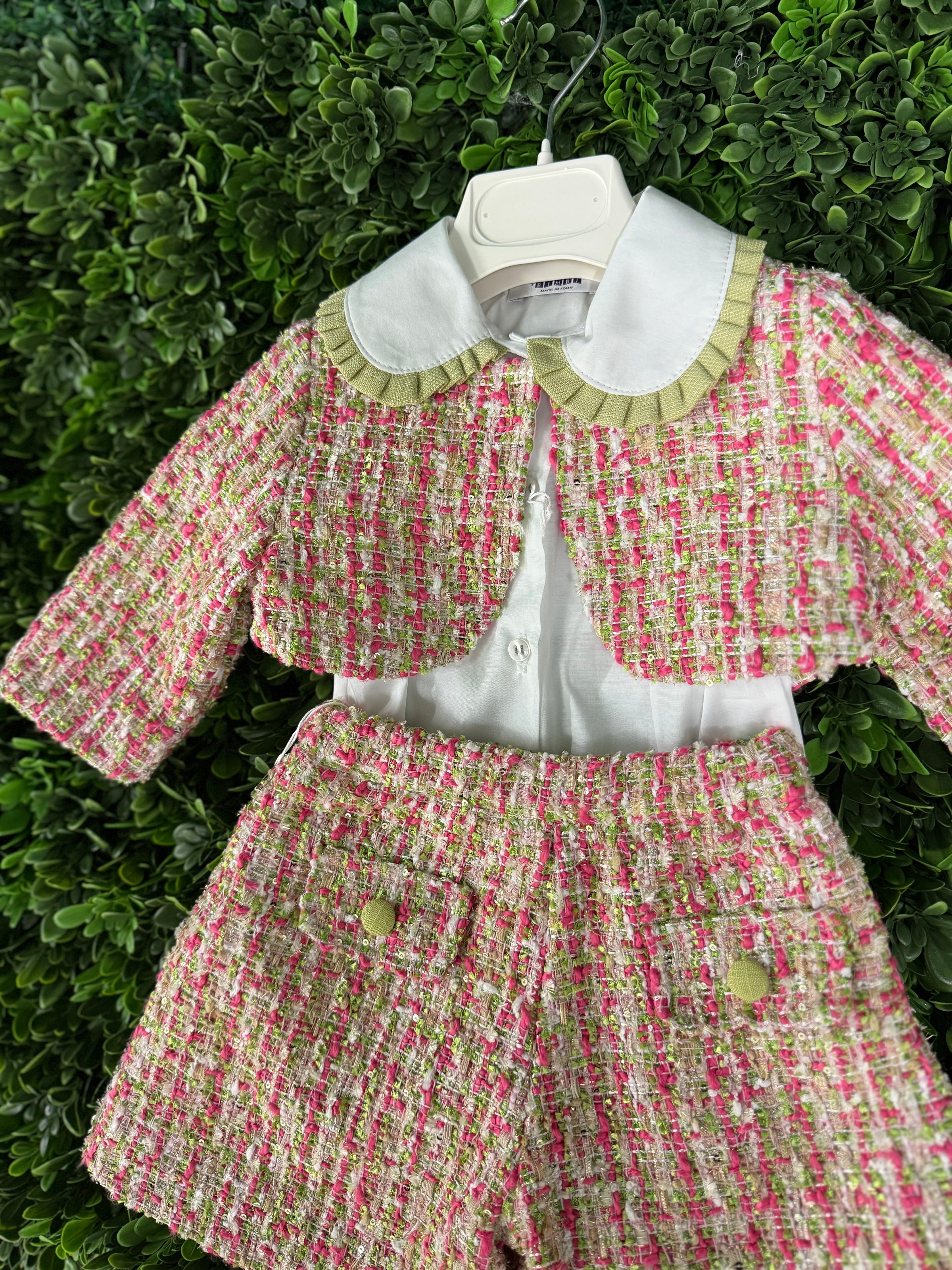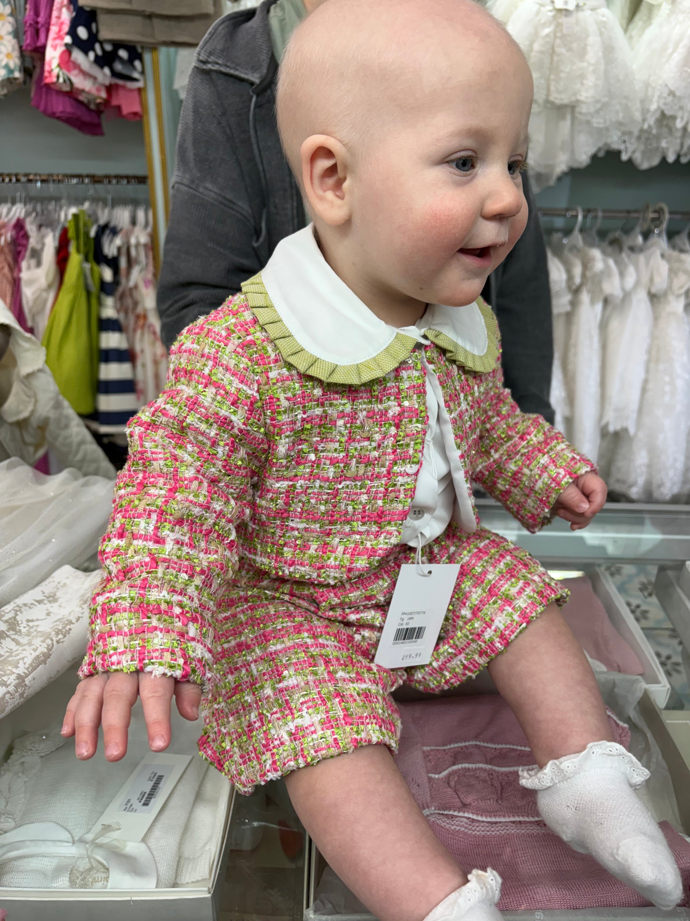 A fresh take on classic elegance, this beautifully tailored set by Michelina Bimbi blends timeless style with playful charm. Expertly made in Italy, the ensemble features a vibrant tweed fabric woven with soft shades of pink, green, and ivory—creating a rich texture that feels both sophisticated and unique. The cropped jacket is designed with a delicate Peter Pan collar layered over a crisp white blouse, finished with subtle pleated detailing for a refined touch. Paired with matching tweed shorts, complete with decorative buttons and a comfortable elastic waistband, this set offers both structure and ease for your little one.