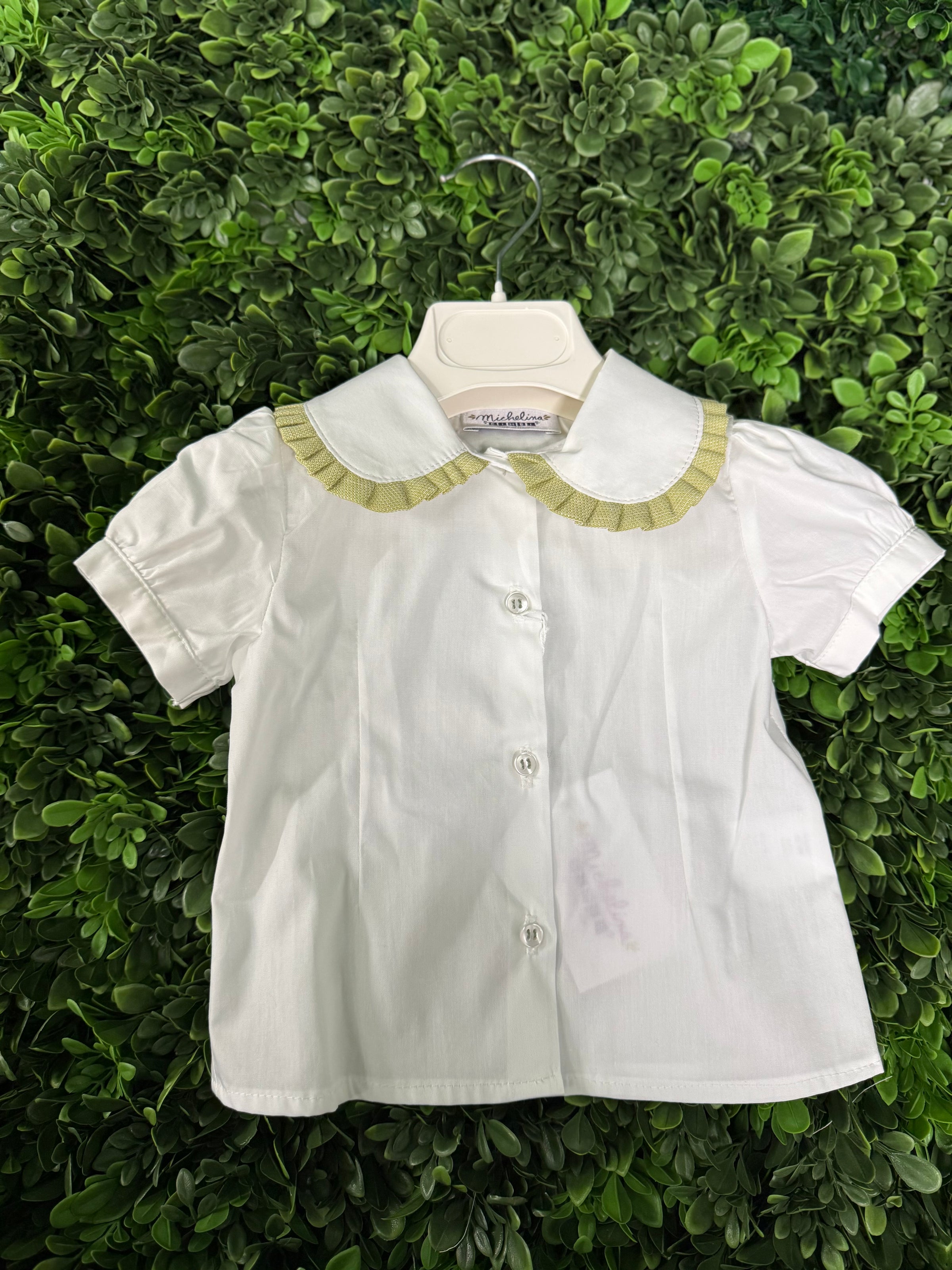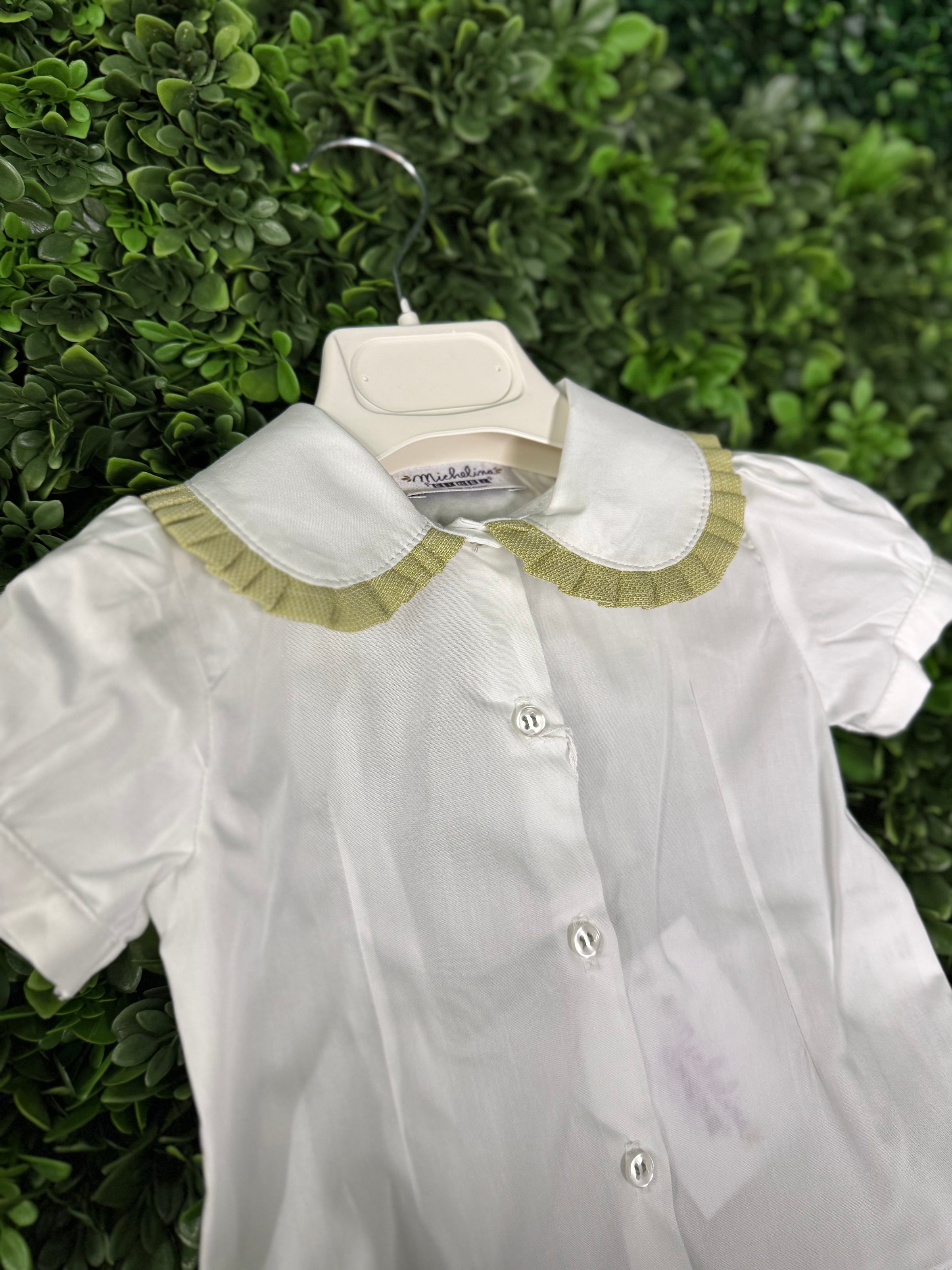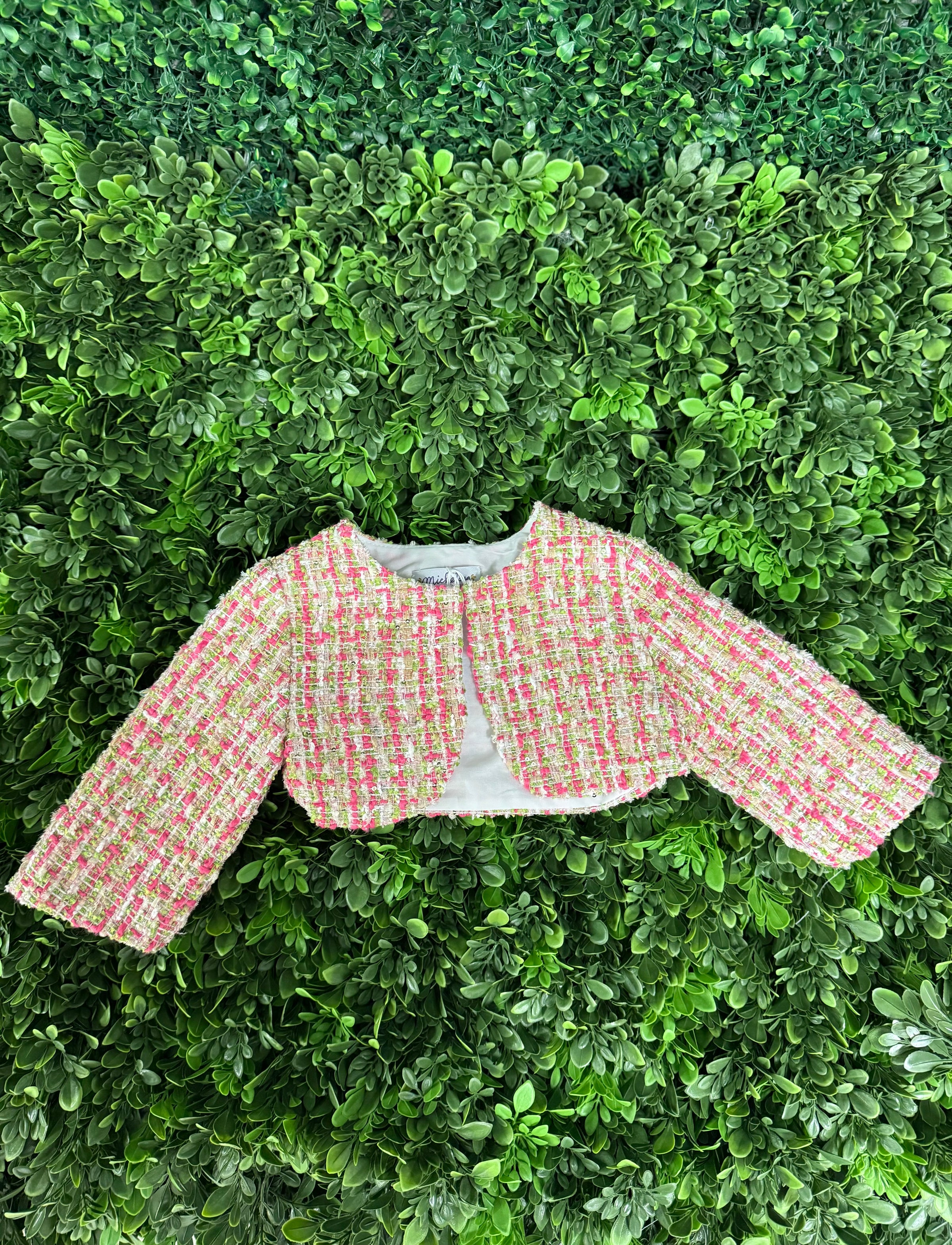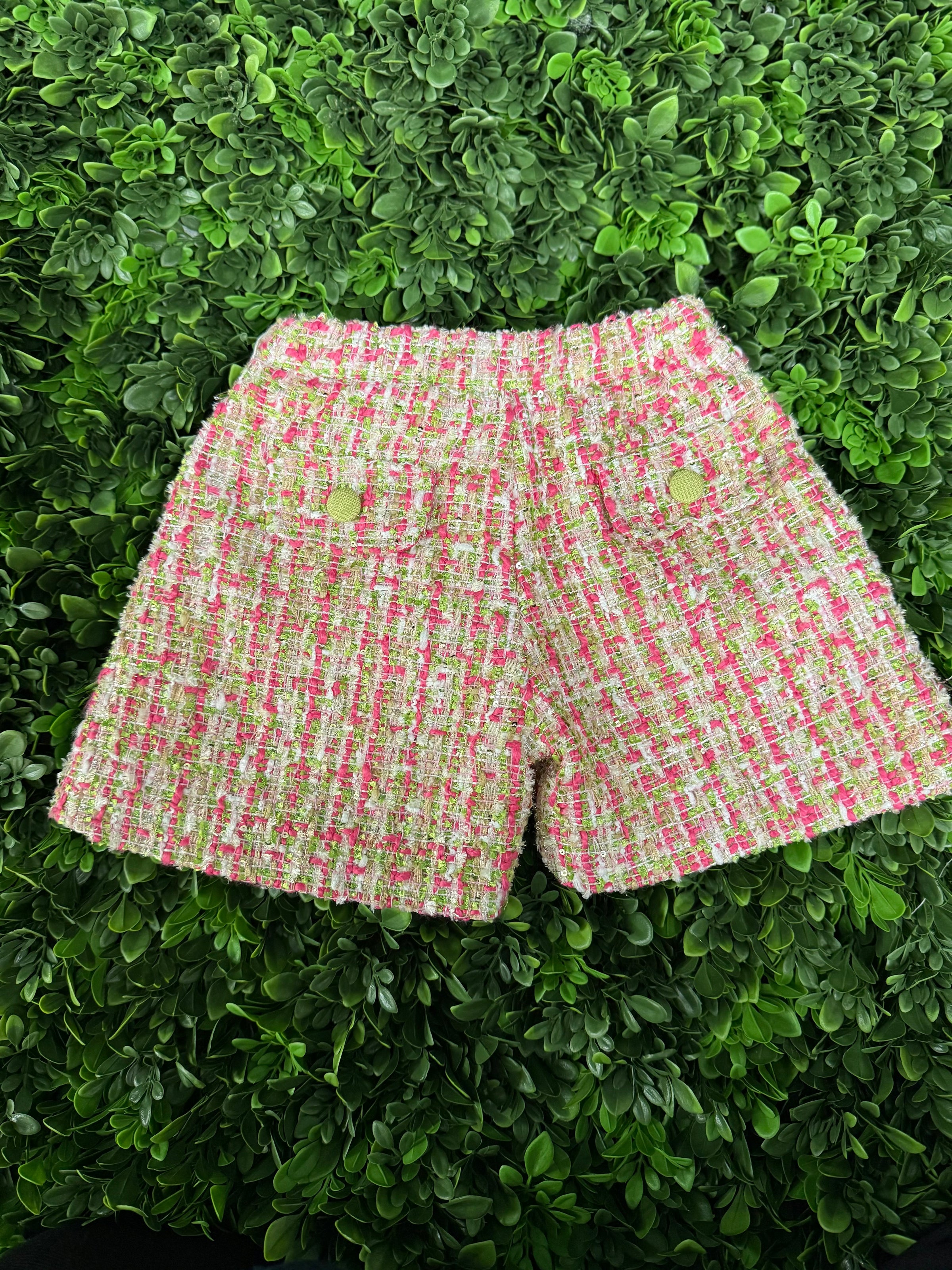 A fresh take on classic elegance, this beautifully tailored set by Michelina Bimbi blends timeless style with playful charm. Expertly made in Italy, the ensemble features a vibrant tweed fabric woven with soft shades of pink, green, and ivory—creating a rich texture that feels both sophisticated and unique. The cropped jacket is designed with a delicate Peter Pan collar layered over a crisp white blouse, finished with subtle pleated detailing for a refined touch. Paired with matching tweed shorts, complete with decorative buttons and a comfortable elastic waistband, this set offers both structure and ease for your little one.