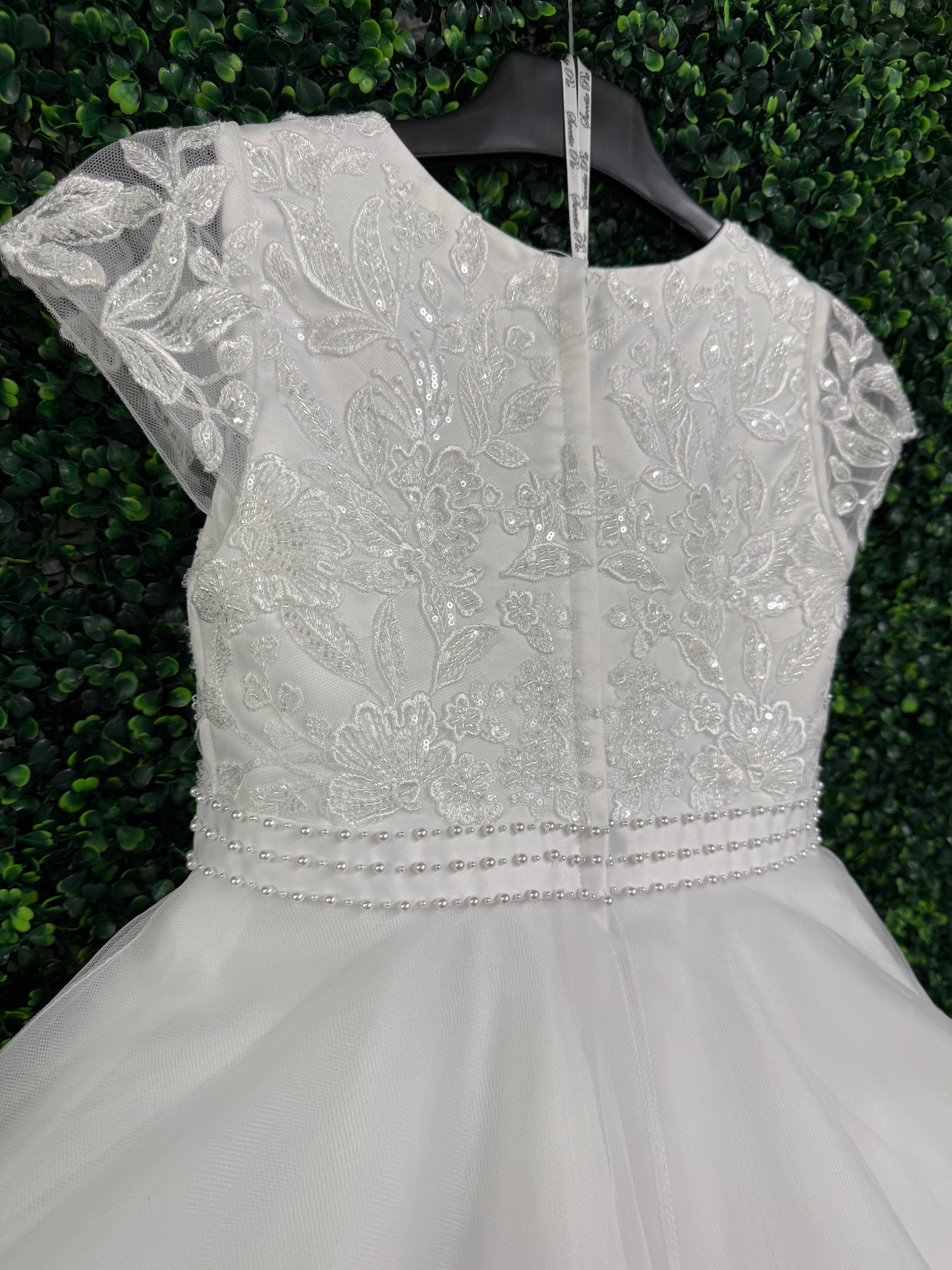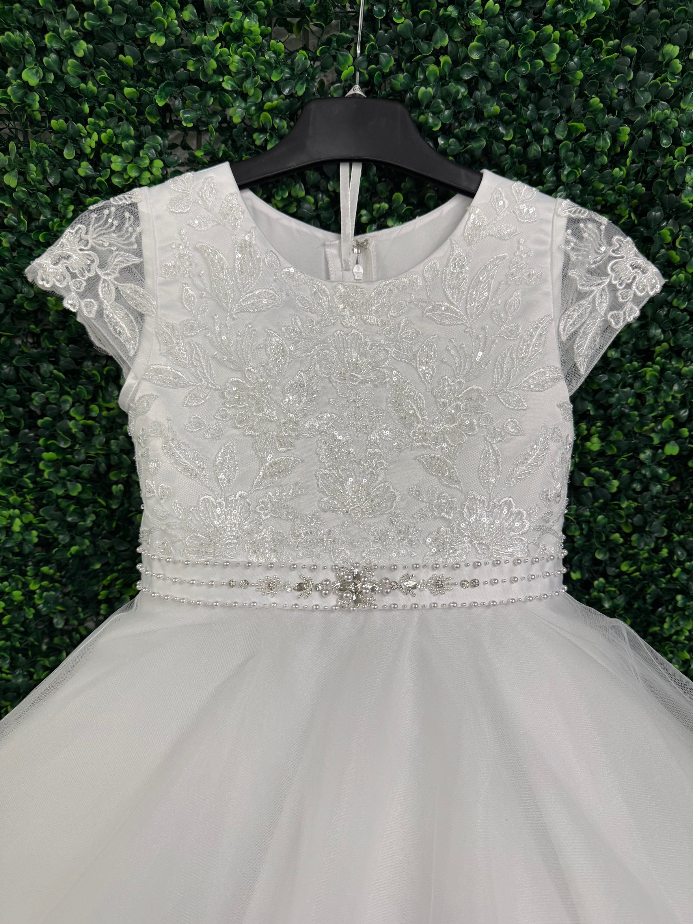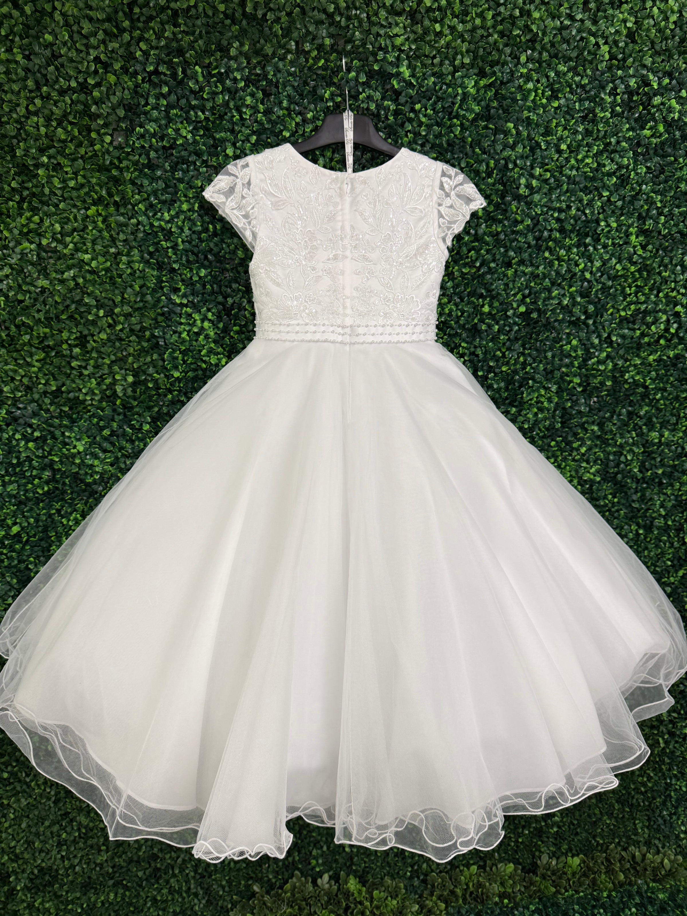 This gorgeous beaded floral lace gown is a classic communion dress. Lace along the bodice and on semi-sheer sleeve. Beaded belt along waistline. A full tea length skirt perfect for twirling. Zipper Closure.
