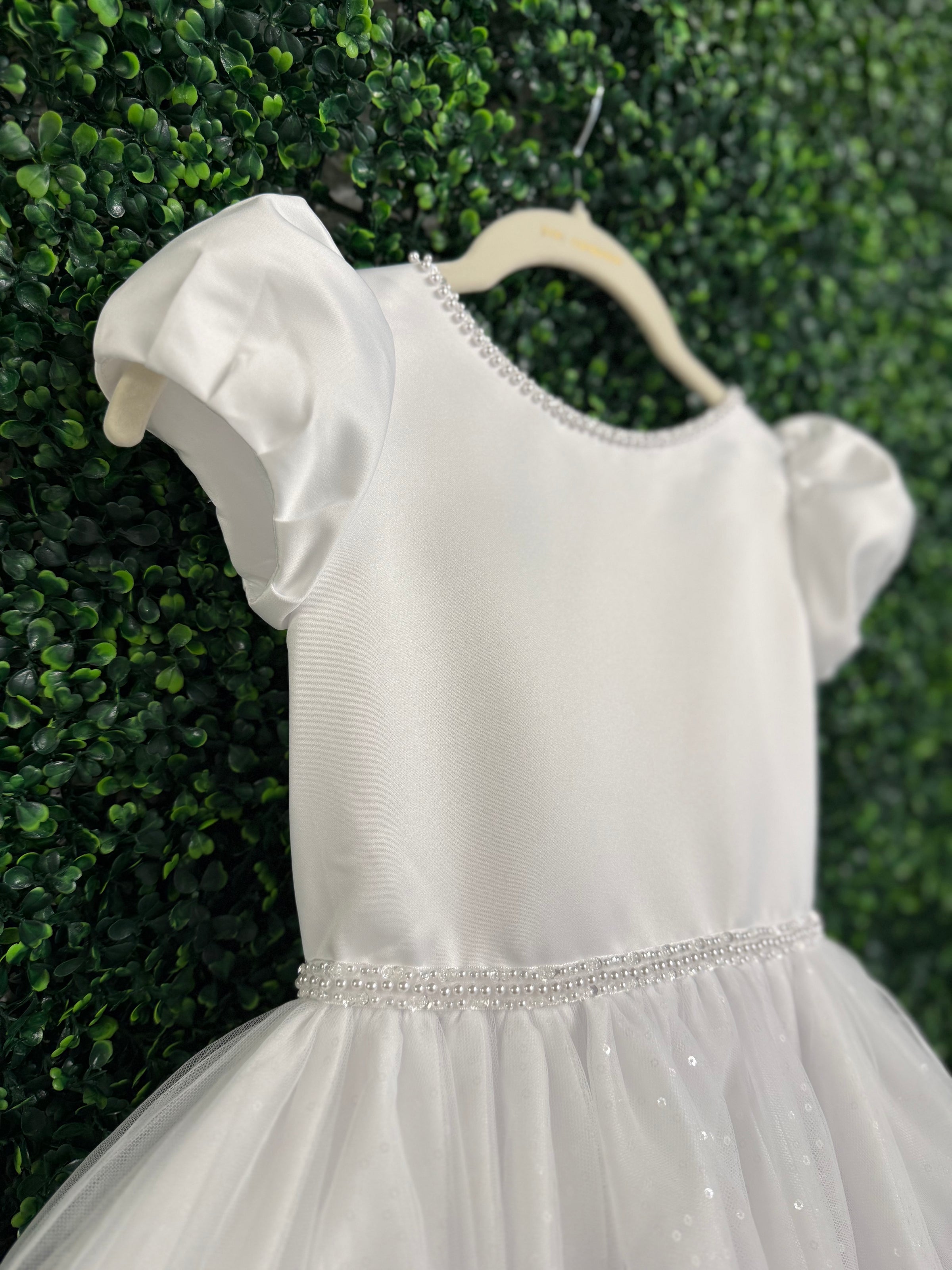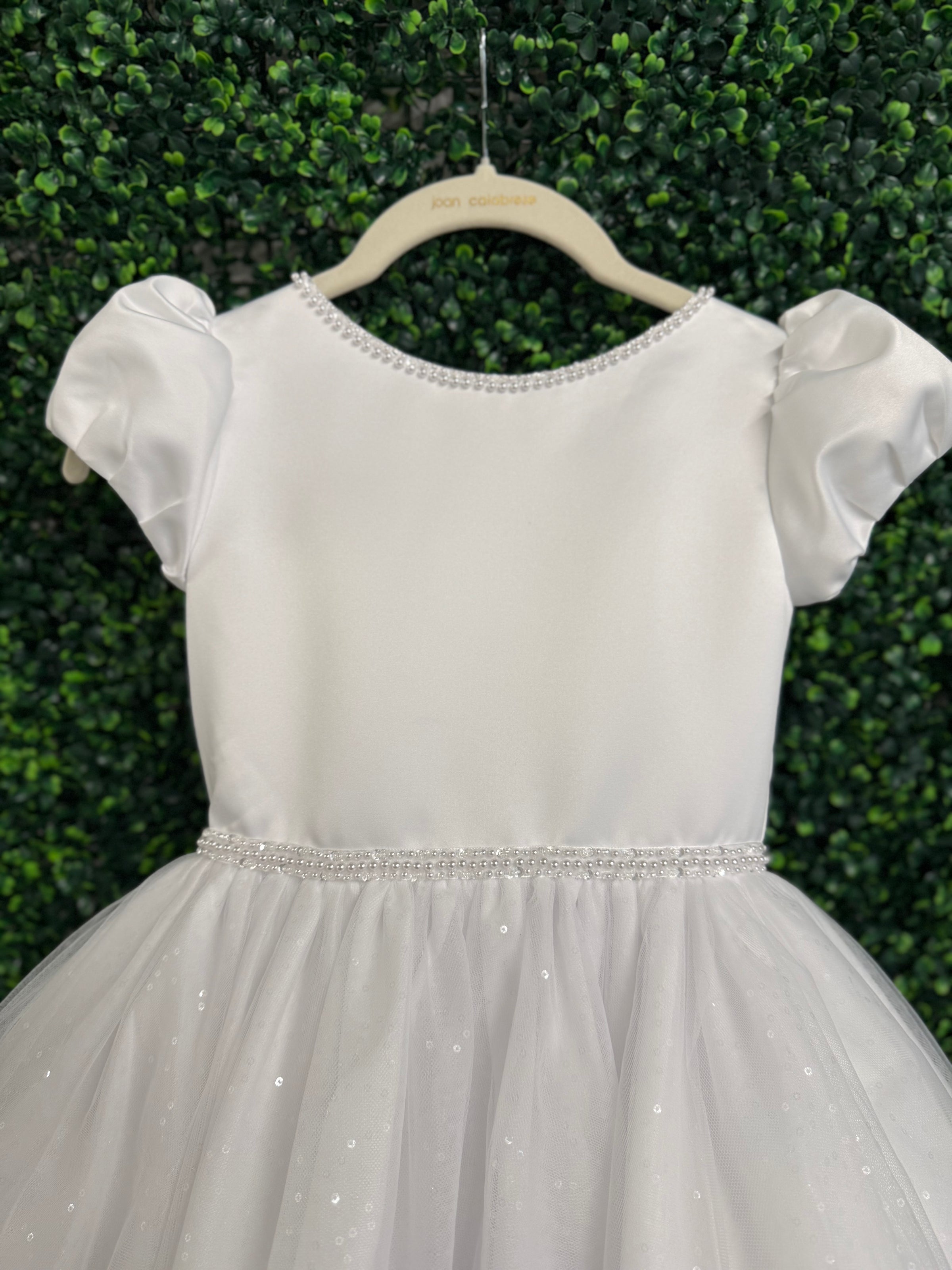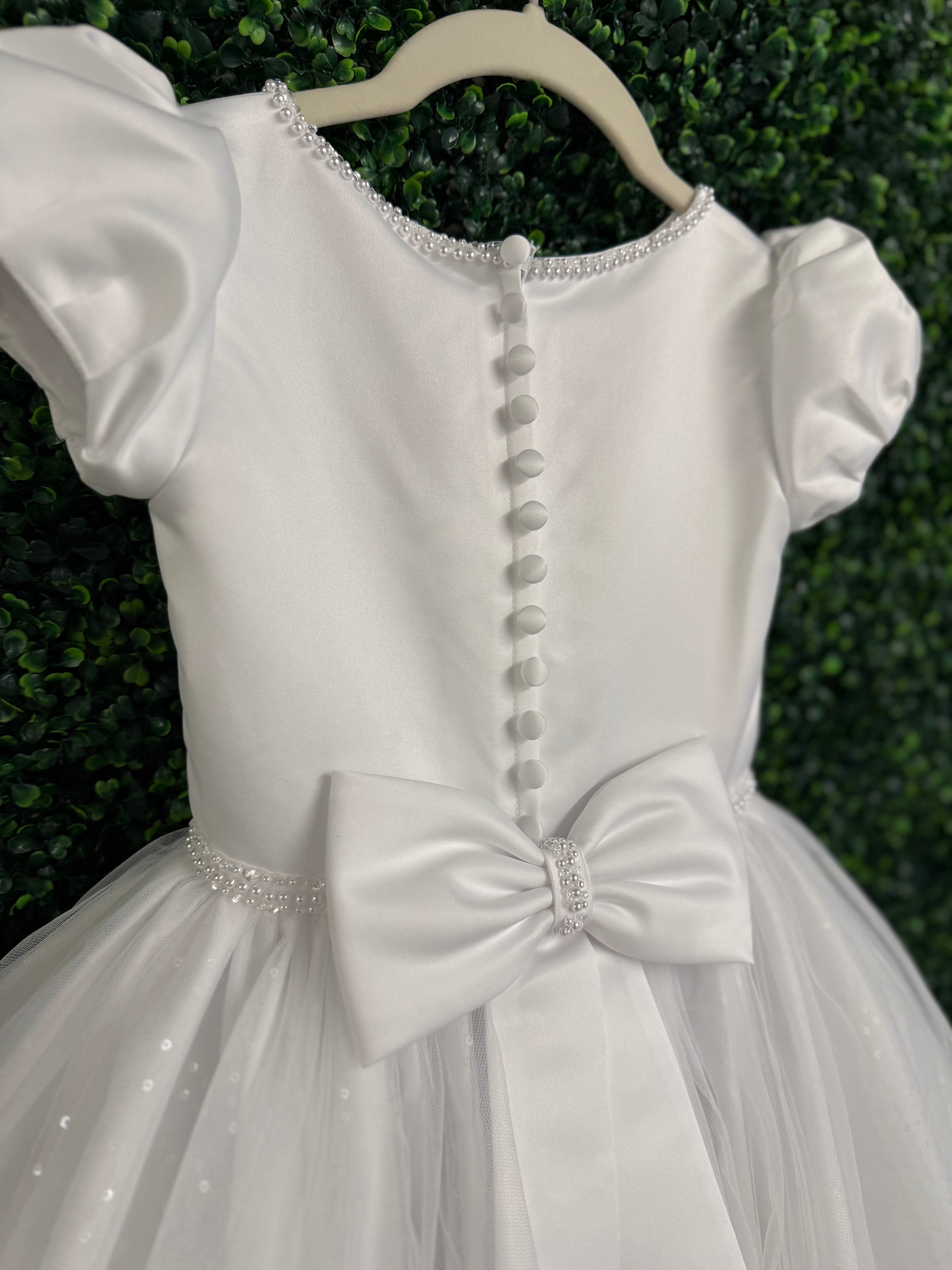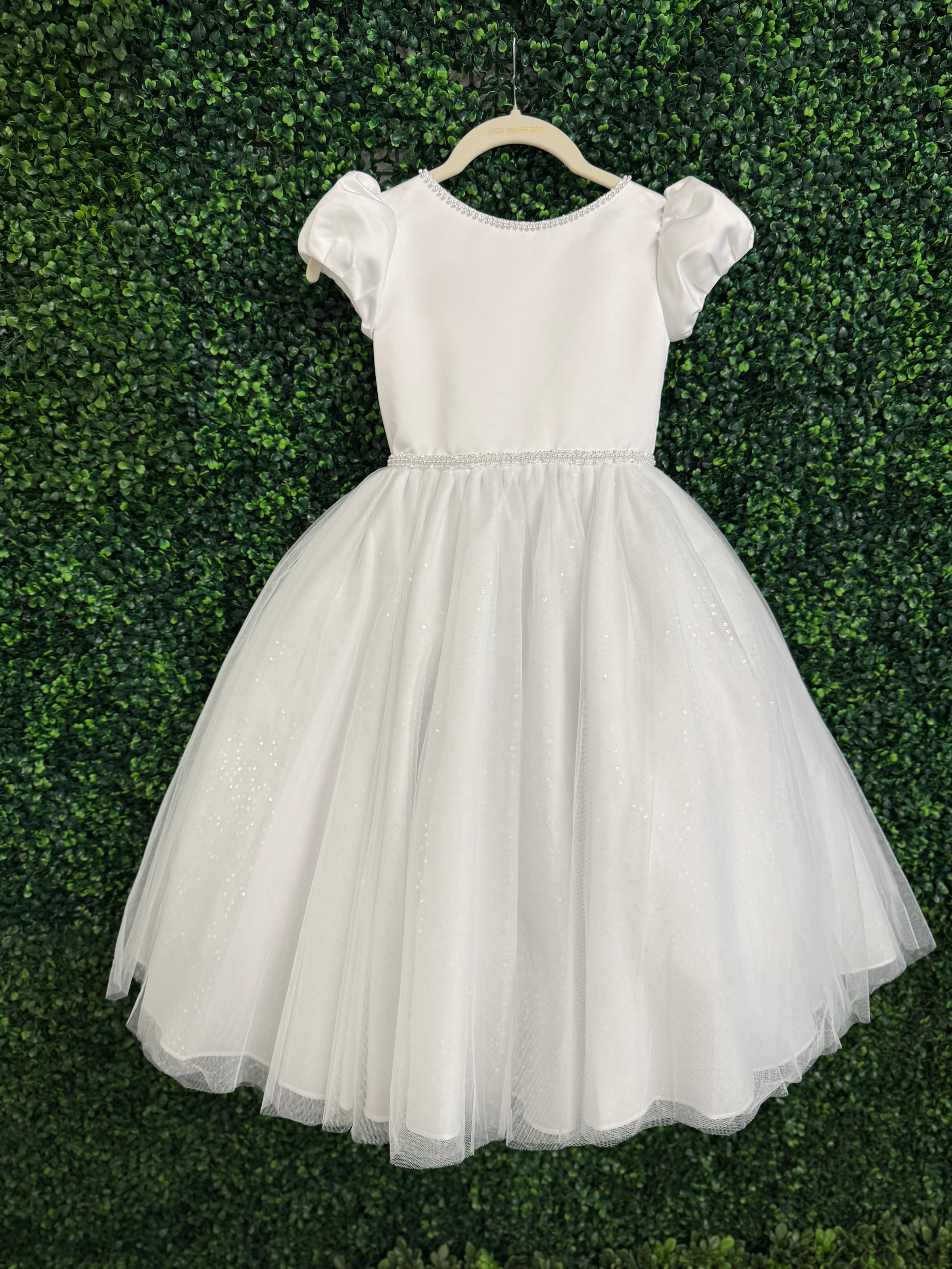 A classic Communion Tea Length Dress!  A soft satin bodice adorned with pearls along the neckline and waistline.  The bodice is finished with a structured puff cap sleeve.  A full sparkly gathered tulle tea length skirt.  Faux button back with a gorgeous satin bow.  Zipper closure.