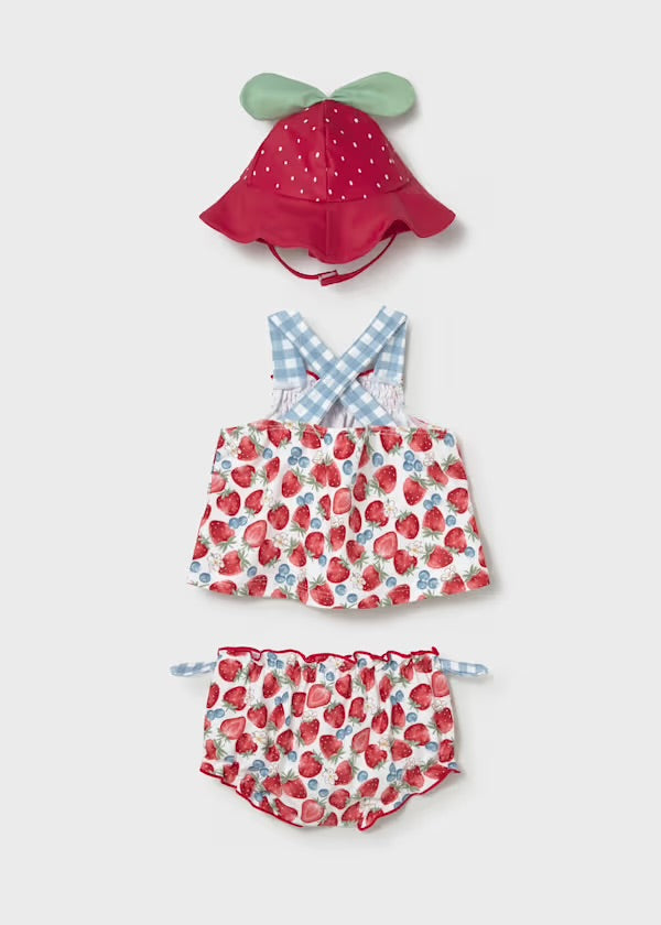 A sweet and playful three-piece summer outfit featuring a charming strawberry theme. This set includes strap top , sleeveless top with crisscross gingham straps and a cheerful strawberry-and-blueberry print. The loose, breezy fit is perfect for warm day. Matching bloomers, bottoms with the same fruit print and gentle elastic for comfort and easy movement. Sun hat, a  red hat with tiny white dots and an adorable green leaf detail on top, adding a fun, whimsical touch while helping provide sun protection. Made for sunny outings, photos, and everyday cuteness, this outfit combines comfort with a fresh, summery style.