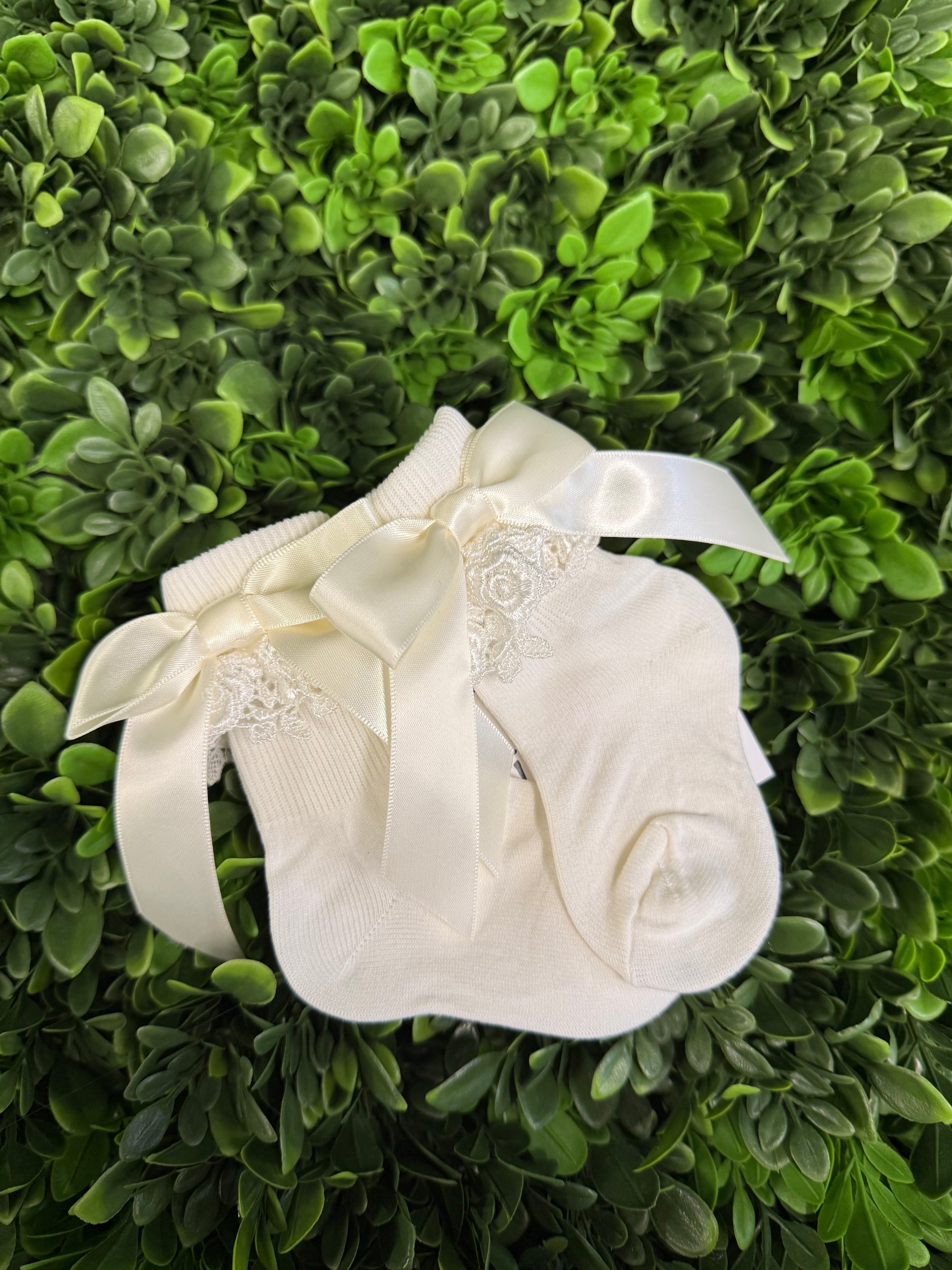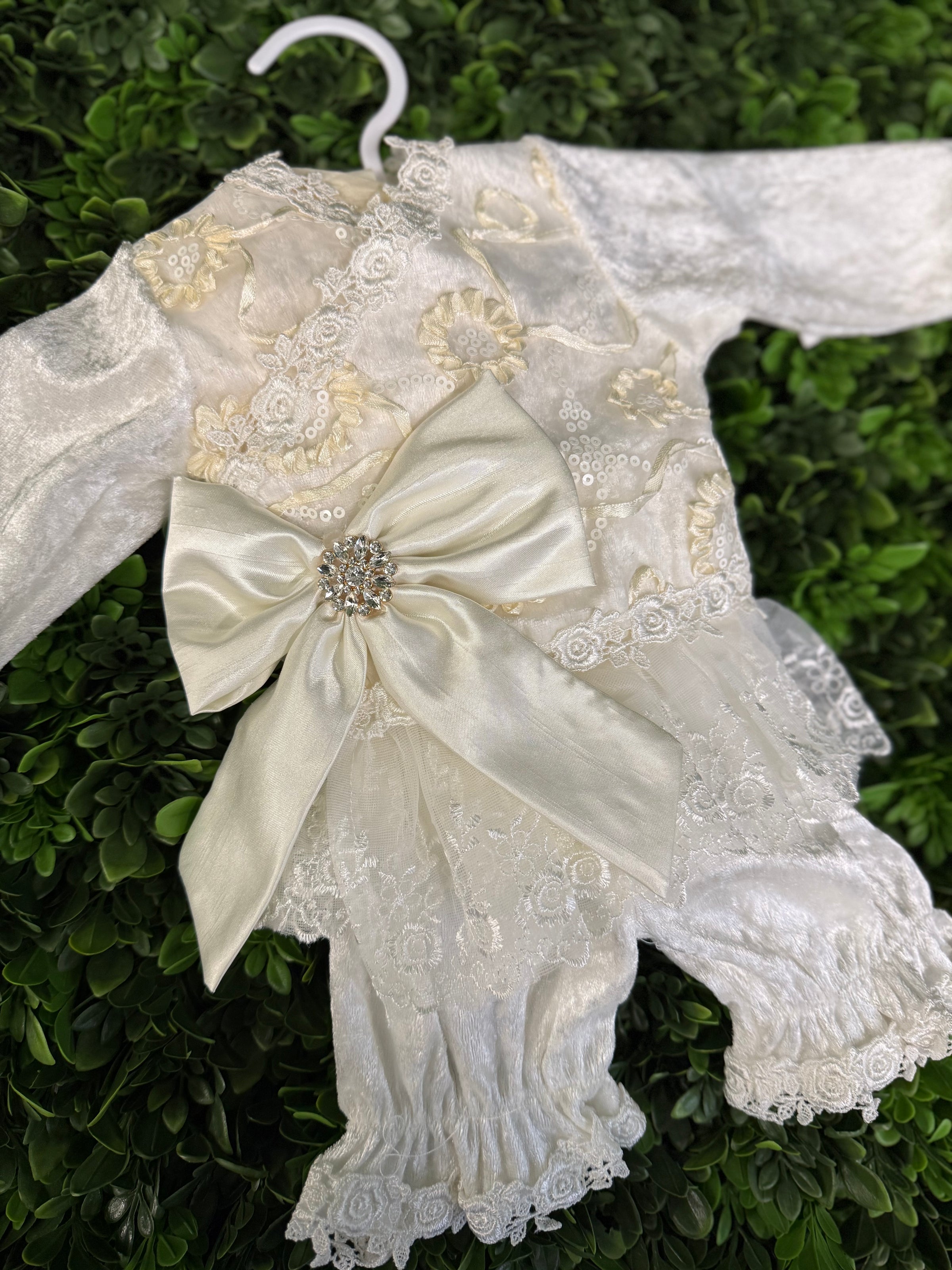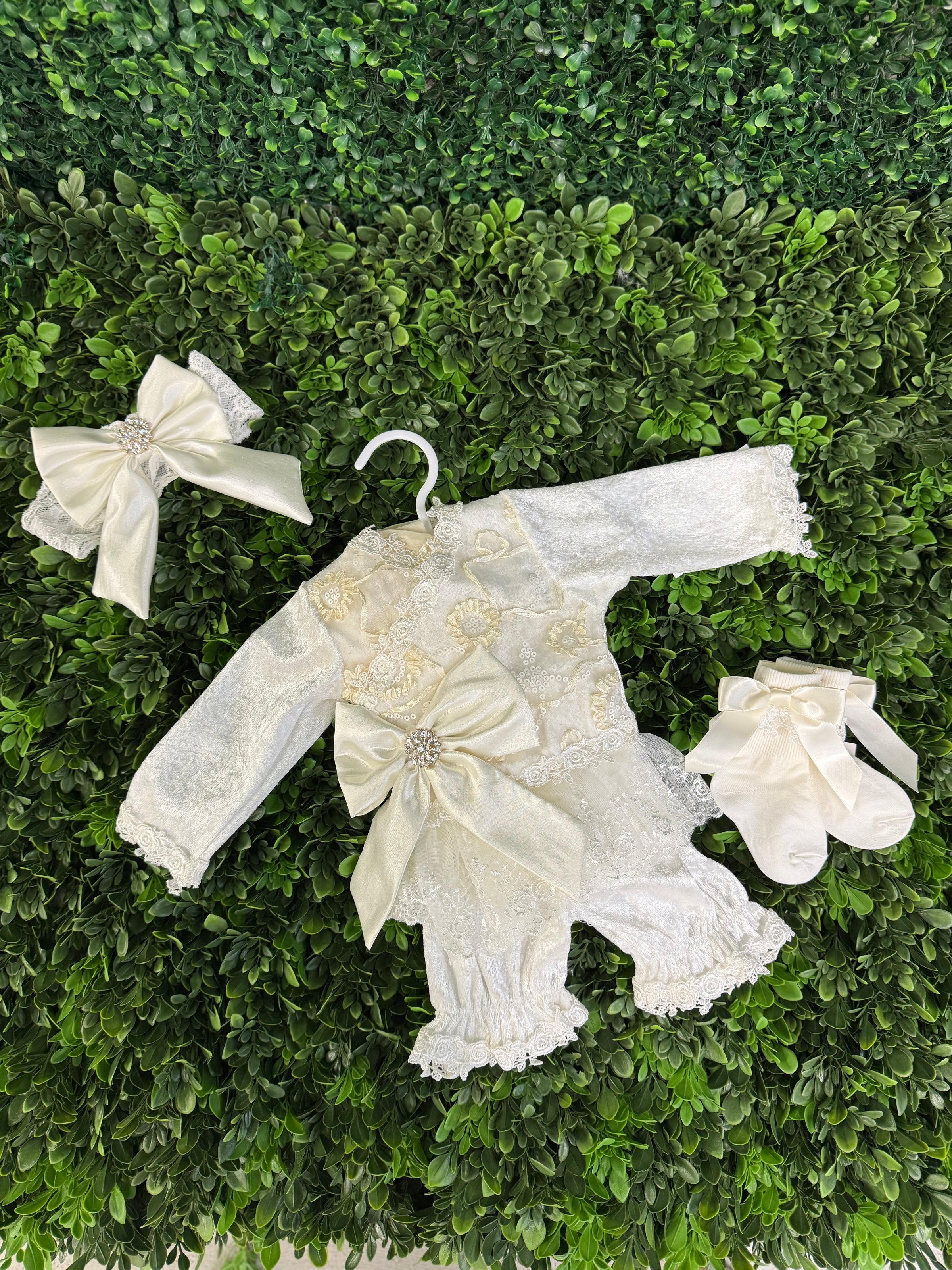 Katie Rose Ivory Infant Cotton Velvet Lace Bow Set with Matching Socks and Headband