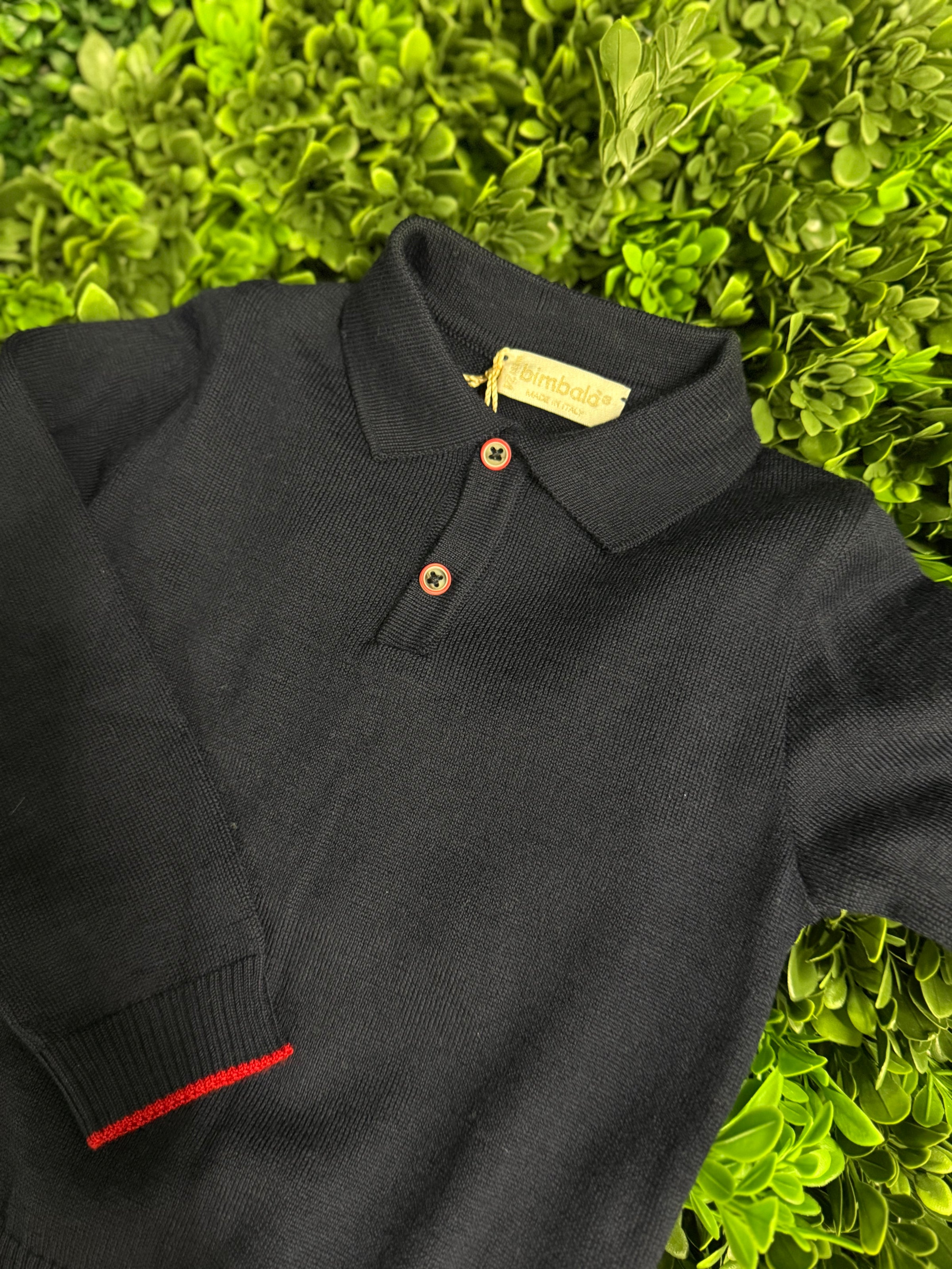 Made in Italy by Bimbalo'.  This handsome 2pc is made of beautiful wool blended fabric and includes adjustable slim plaid pants, and navy knit polo with red trim.  This styles runs large and we recommend purchasing to the age of the child.
