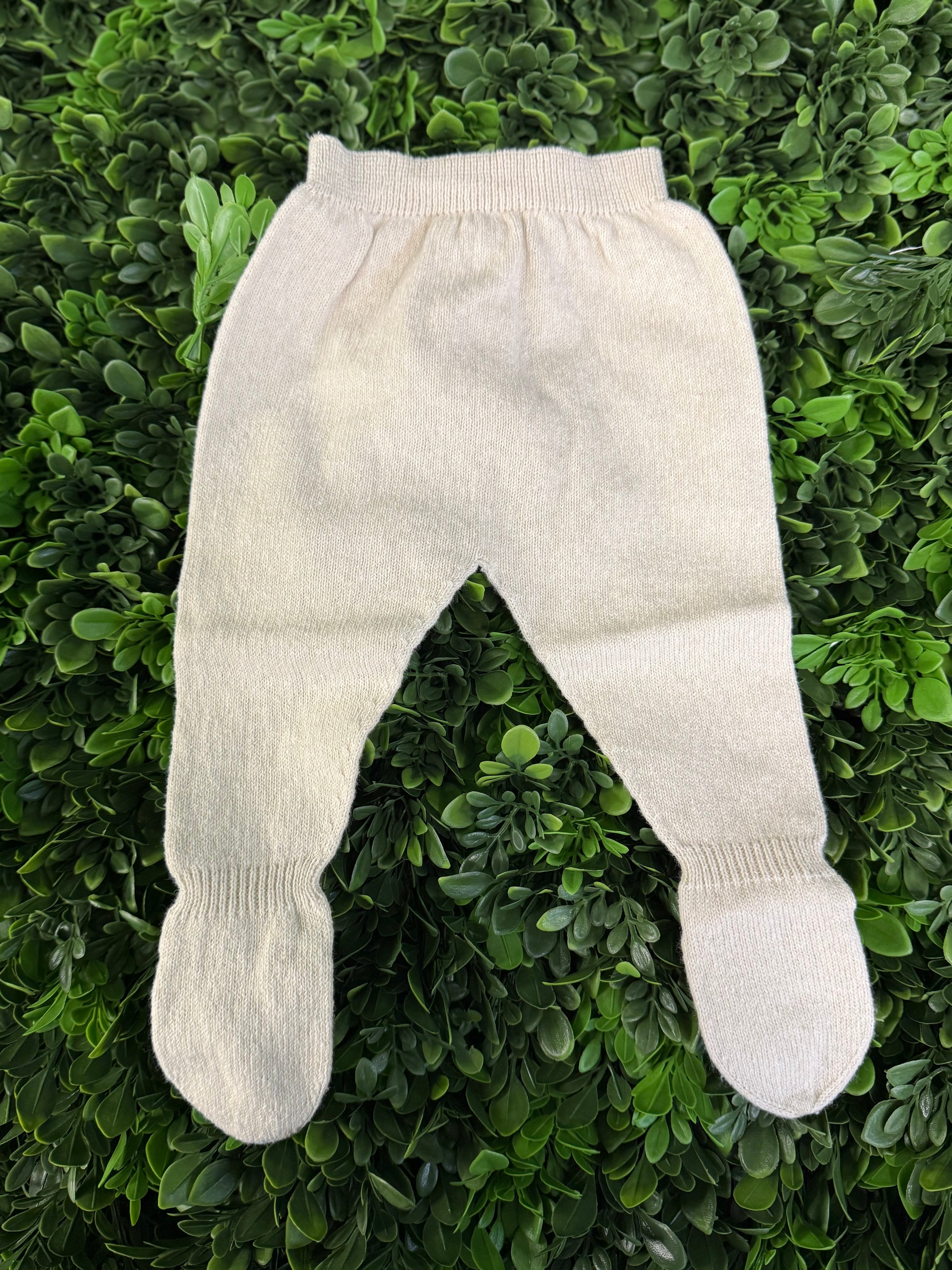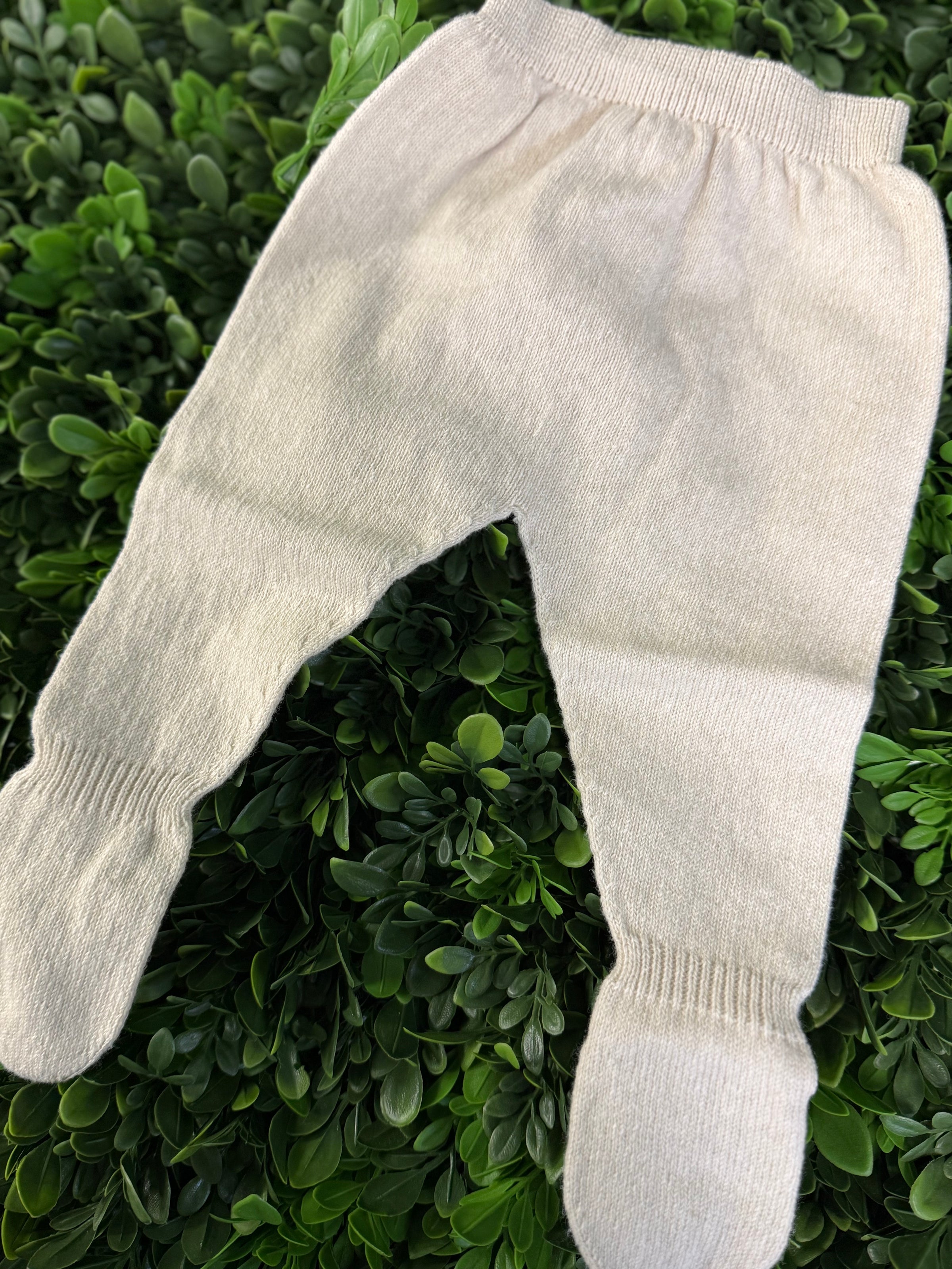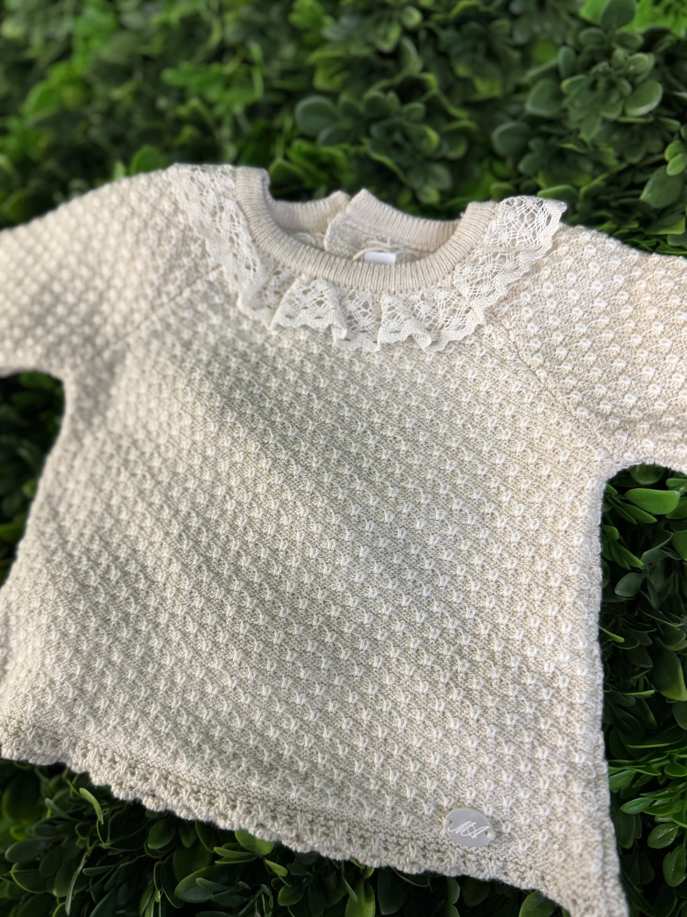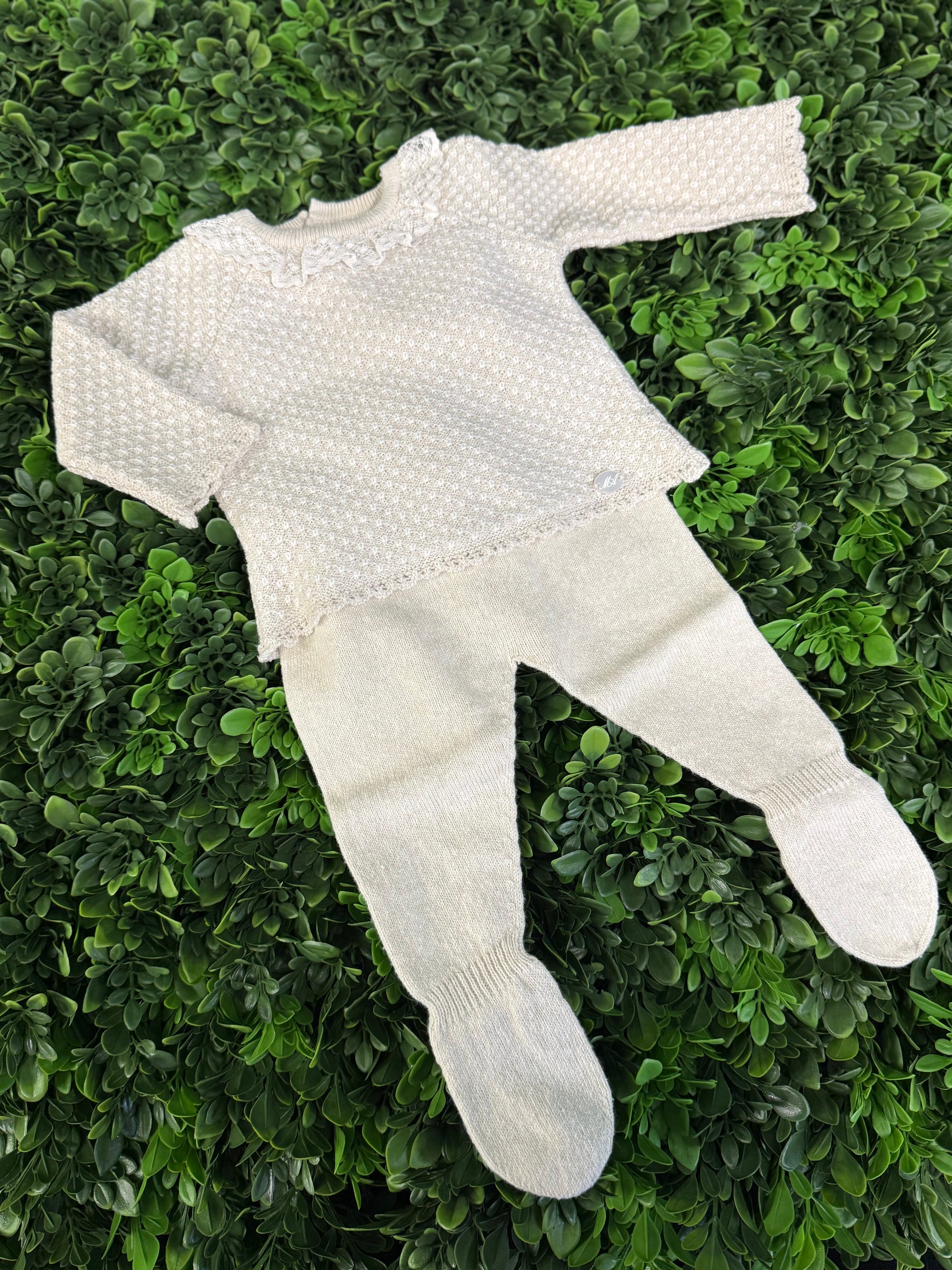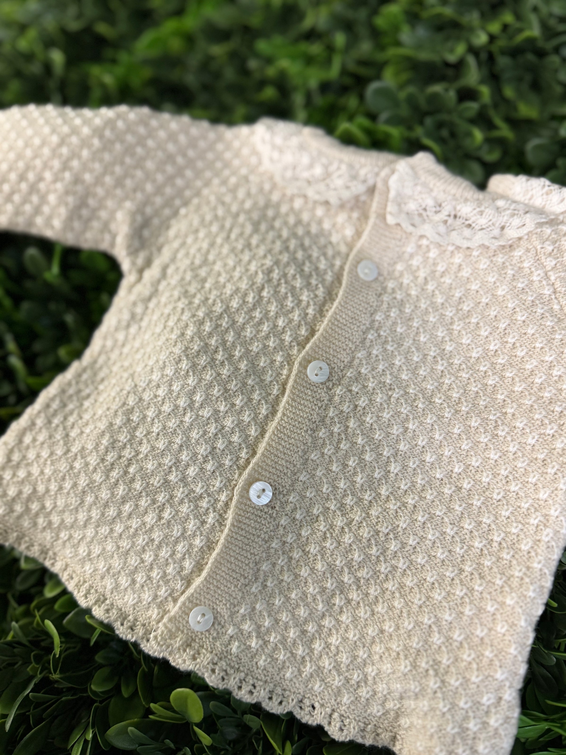 Made in Spain by Martin Aranda! Beautiful lace detailed two piece outfit. It features a traditional style collar, cable knit sweater, and is paired with soft cotton knit footie pants. Button closure in the back of the sweater for easy changing.