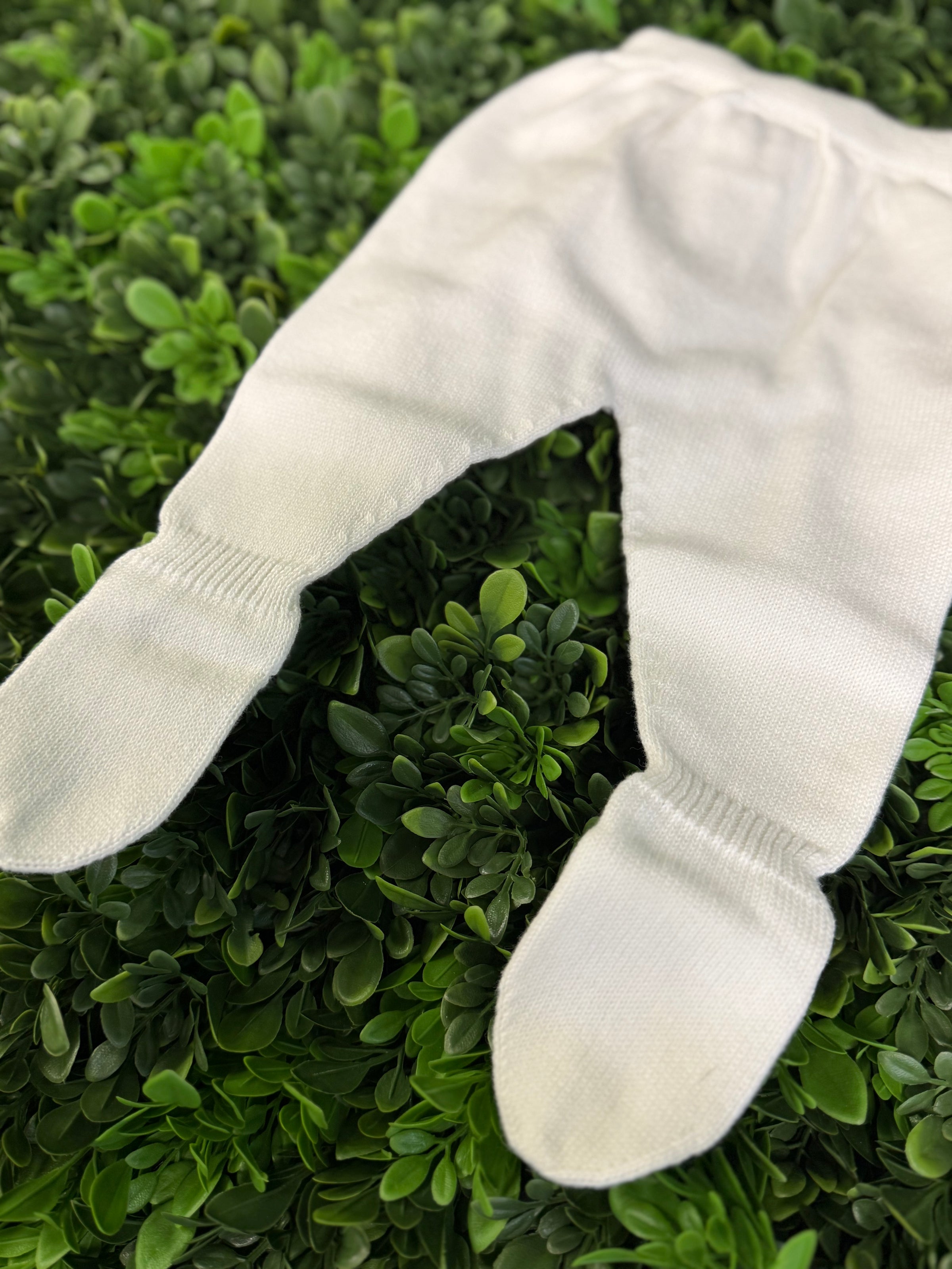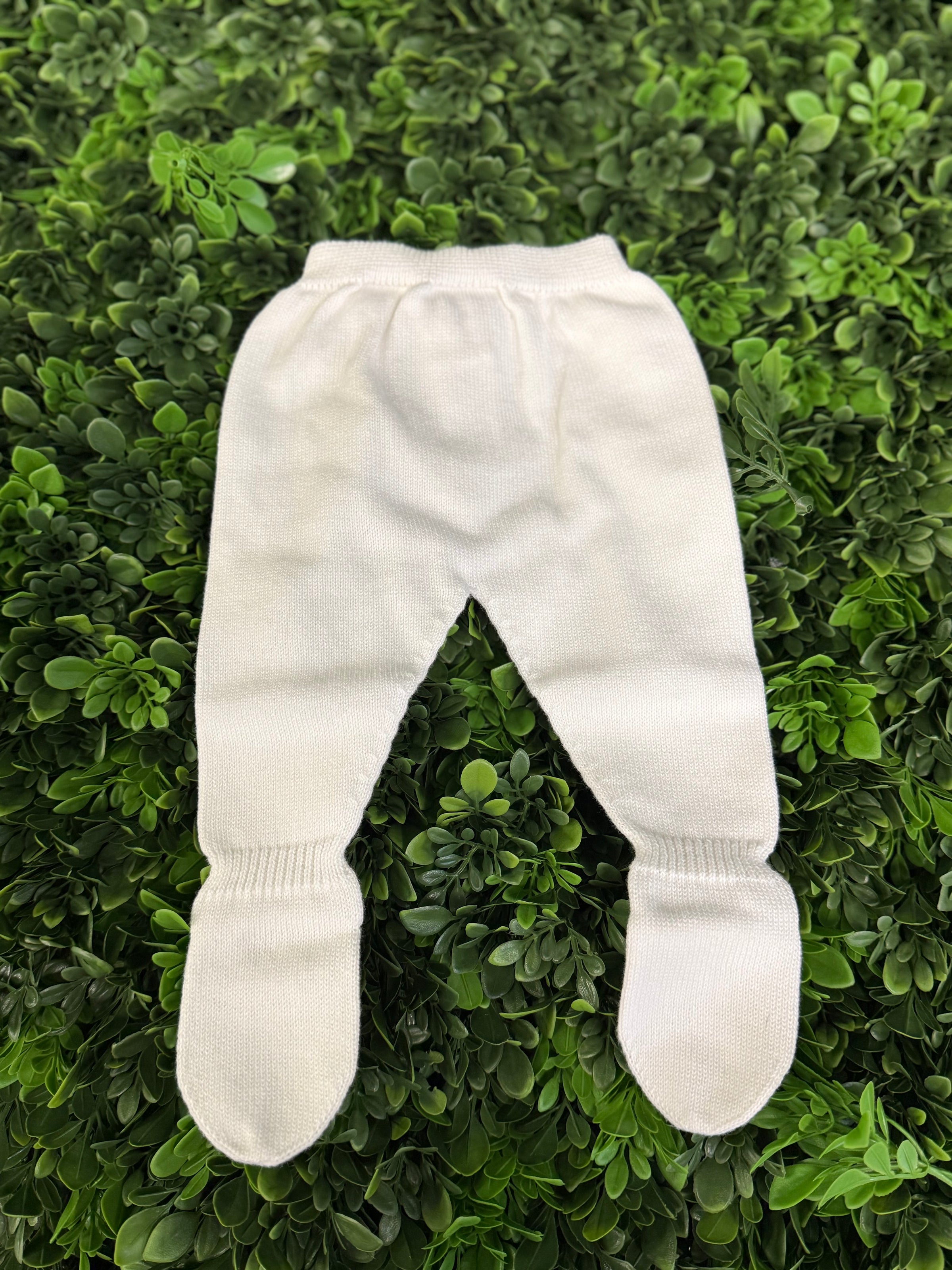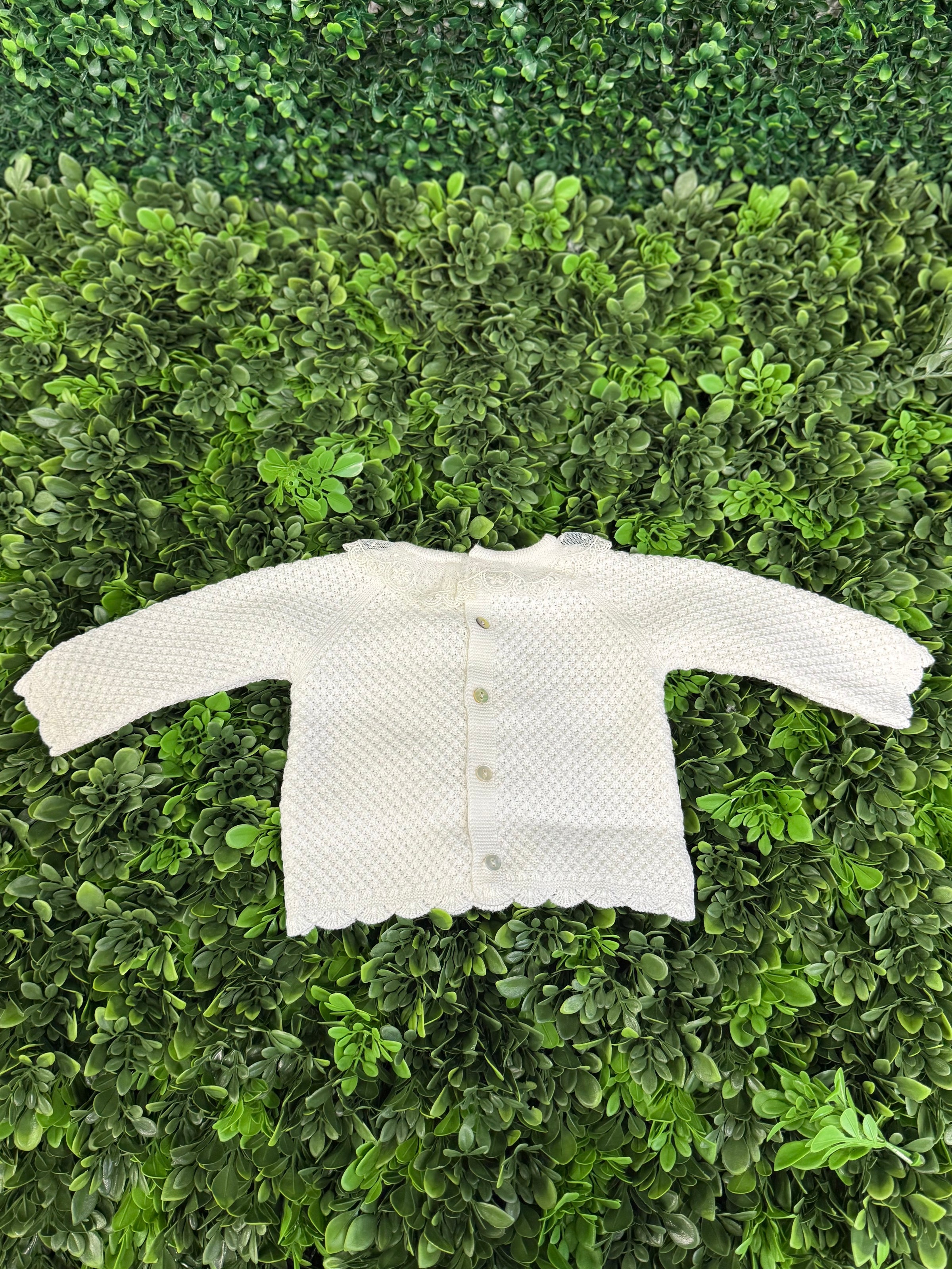 Made in Spain by Martin Aranda! Beautiful lace detailed two piece outfit. It features a scallop lace collar, cable knit sweater, and is paired with soft cotton knit footie pants. Button closure in the back of the sweater for easy changing.