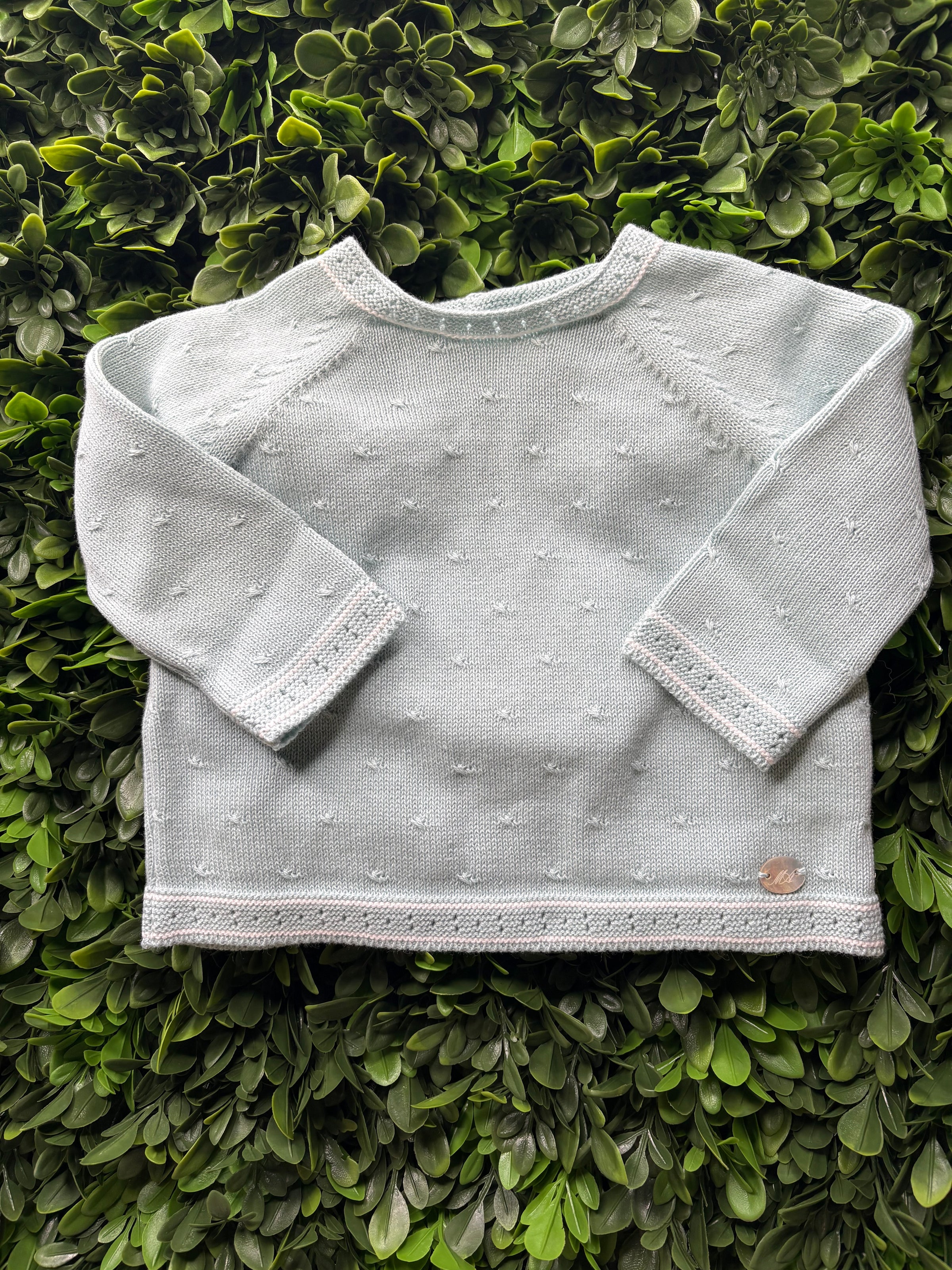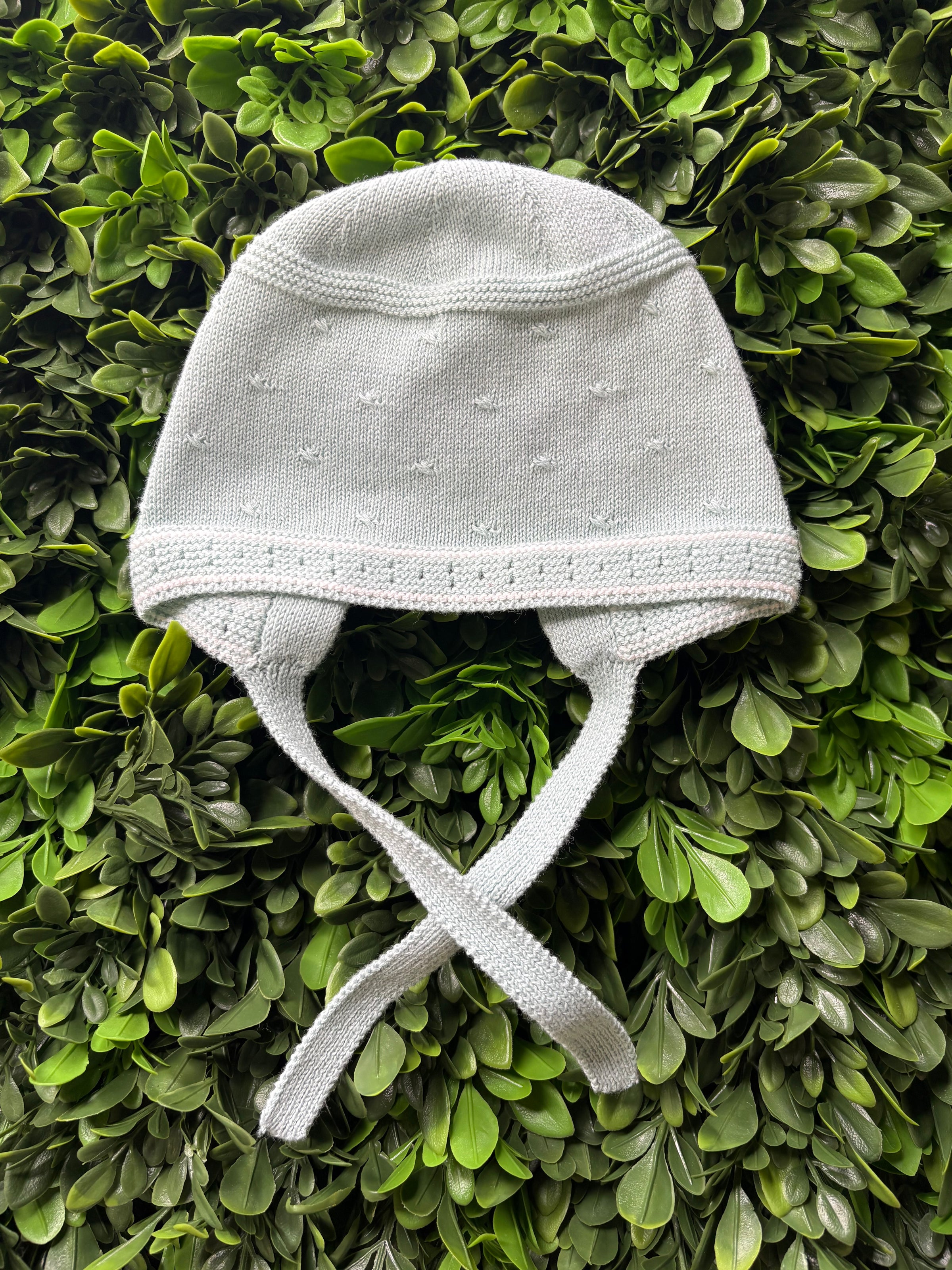 Made in Spain by Martin Aranda! Great 3 piece knit set for your little one. It features a pattered knit sweater top, knit footed pants, and delicate matching bonnet. Button closure in the back of the sweater for easy changing. This is a great option for a take me home outfit! Matching blanket sold separately.