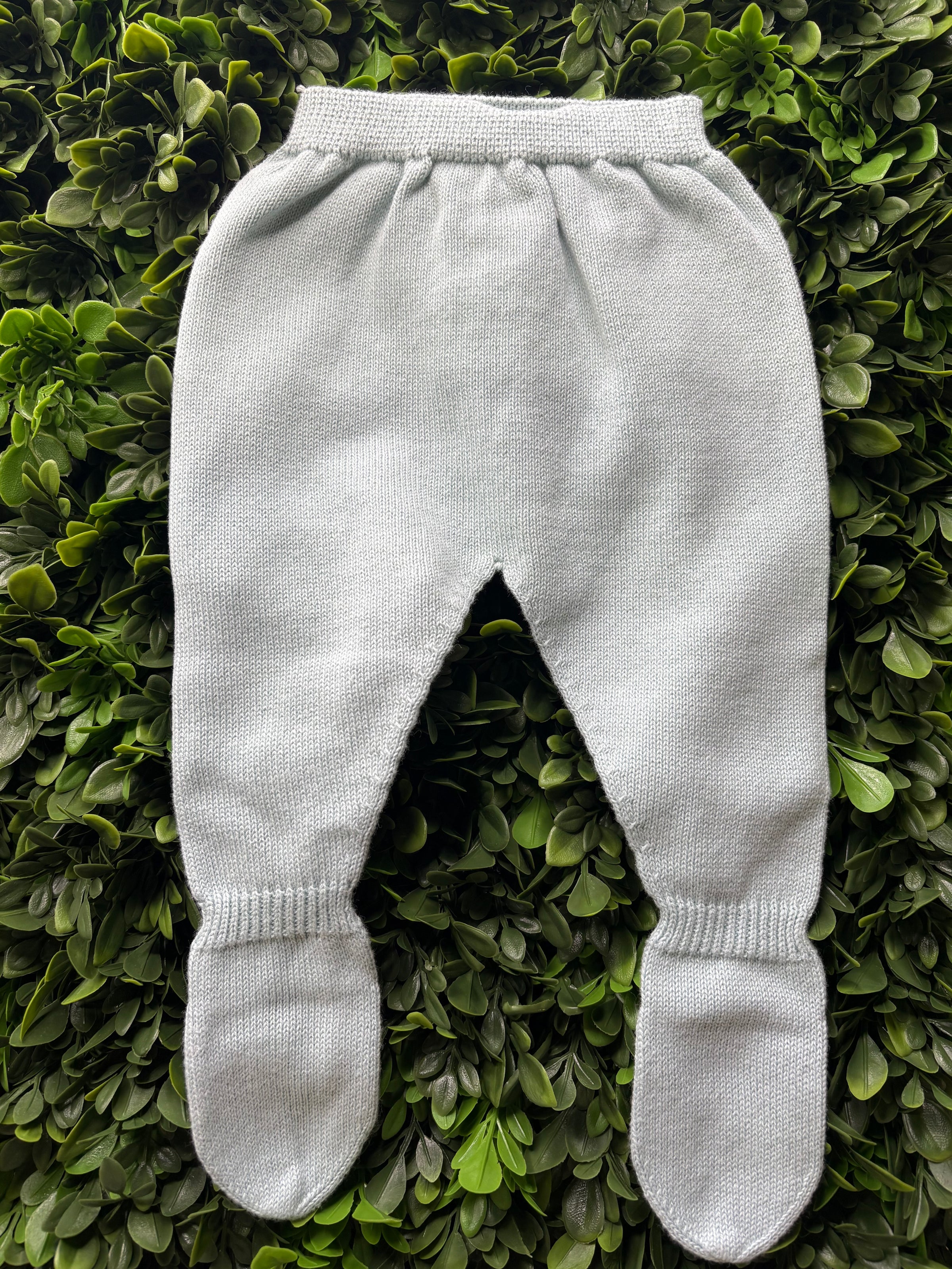 - Knit footed pants, sweater, and bonnet