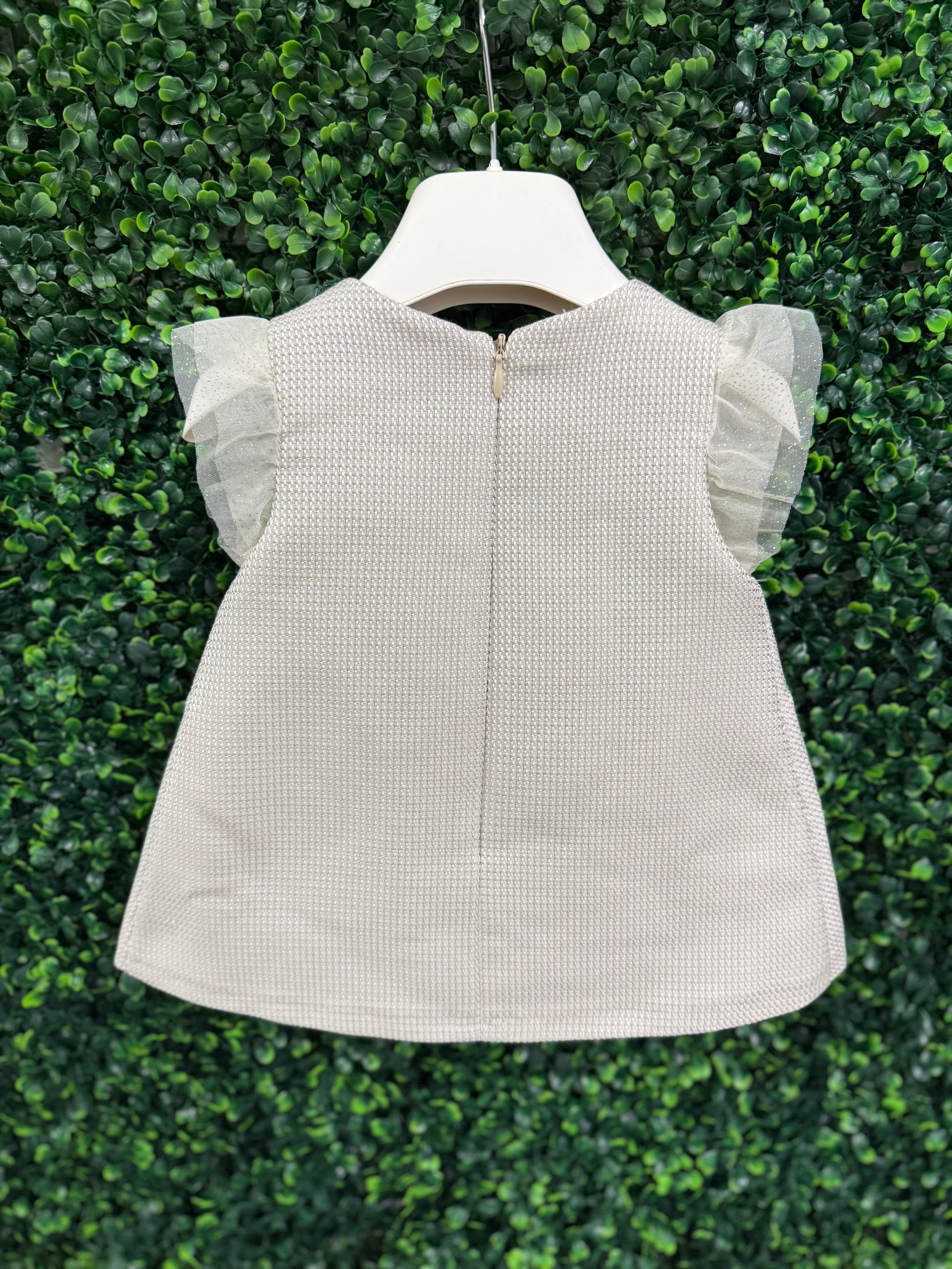 Elegant in its simplicity and rich in detail, this beautifully crafted dress is a timeless addition to any little wardrobe.  Made in Italy, it features a refined textured ivory and taupe fabric that offers subtle dimension and a softly structured silhouette.  Delicate tulle cap sleeves with a hint of shimmer add a touch of whimsy, while the front patch pockets are finished with petite bow accents for an extra dose of charm.  The clean A-line shape ensures comfort and ease, complemented by a smooth back zipper for effortless dressing.