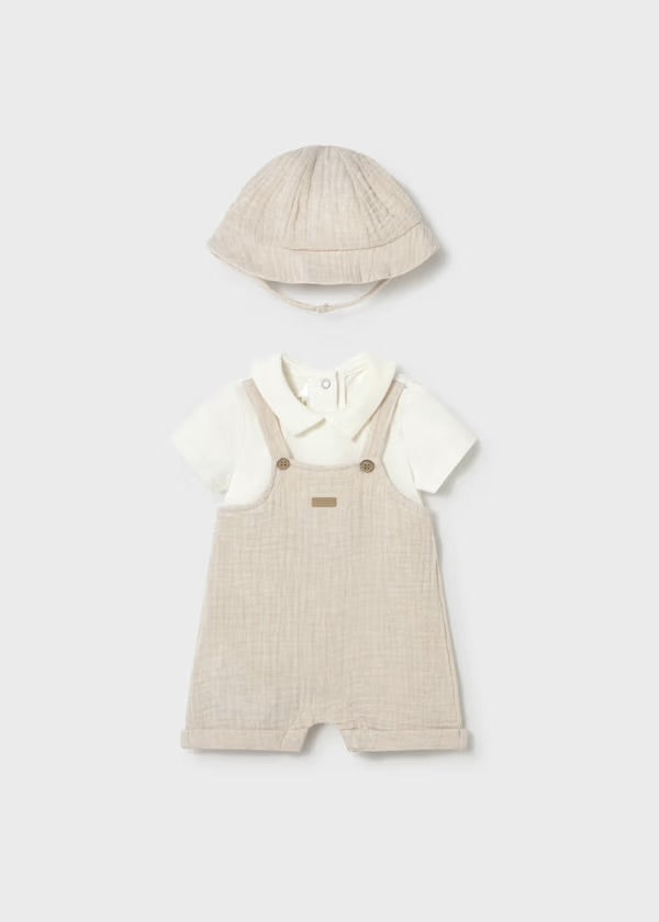 From our Spring/Summer Collection. A cute 3 piece outfit includes a neutral colored dungaree with white cotton body suit, and matching hat. Wood accent buttons along the top to secure suspender straps and along the sides.