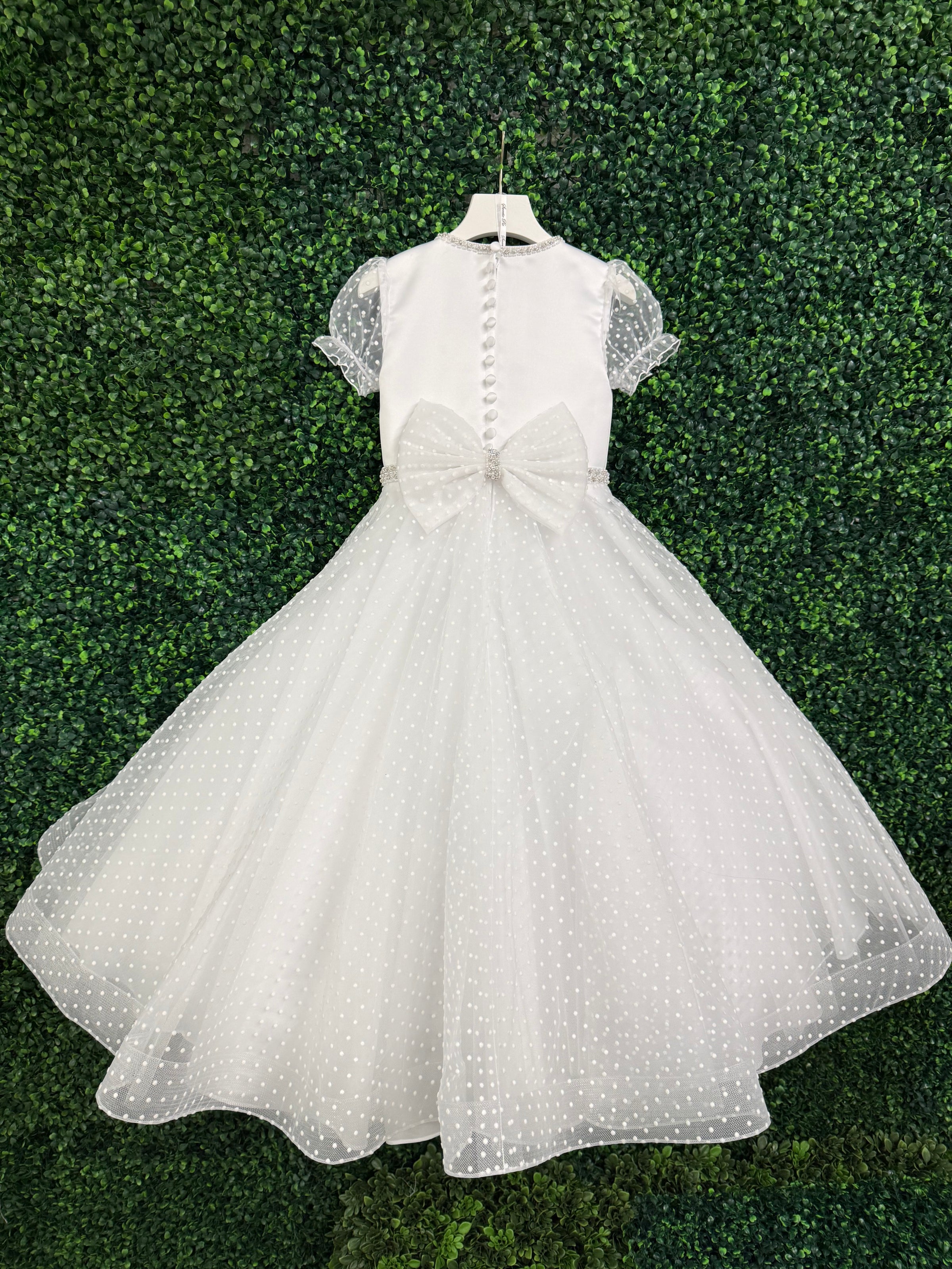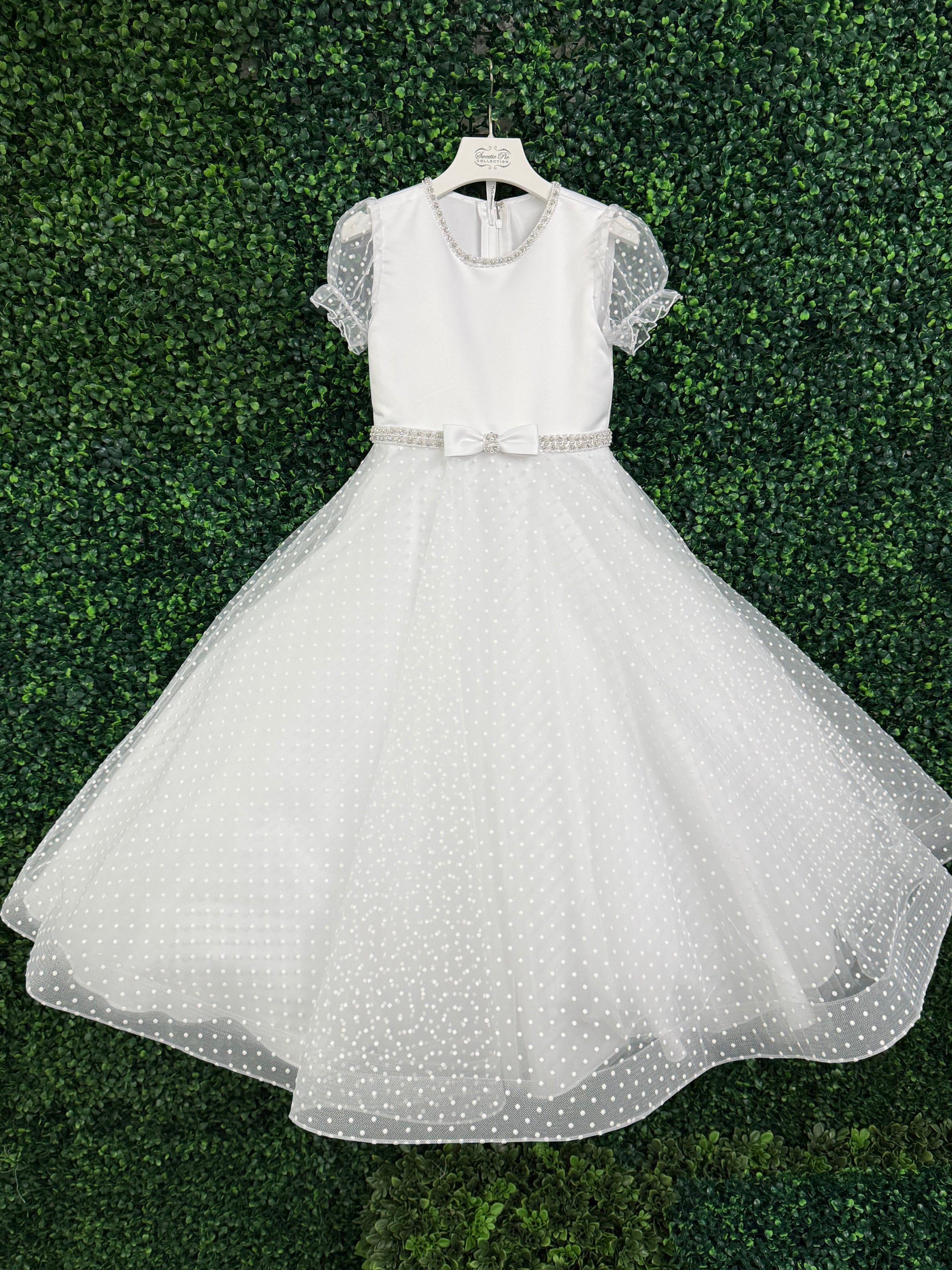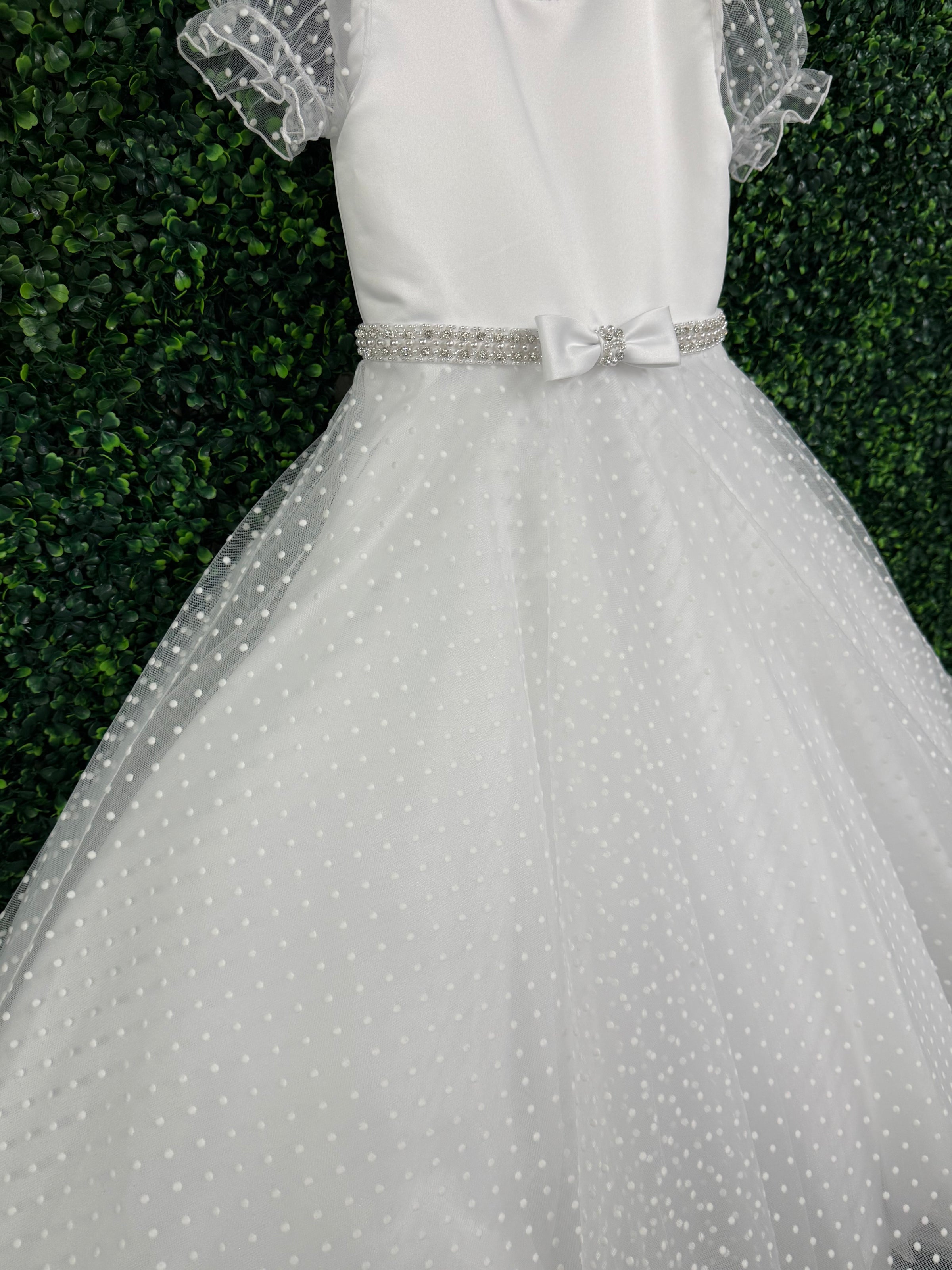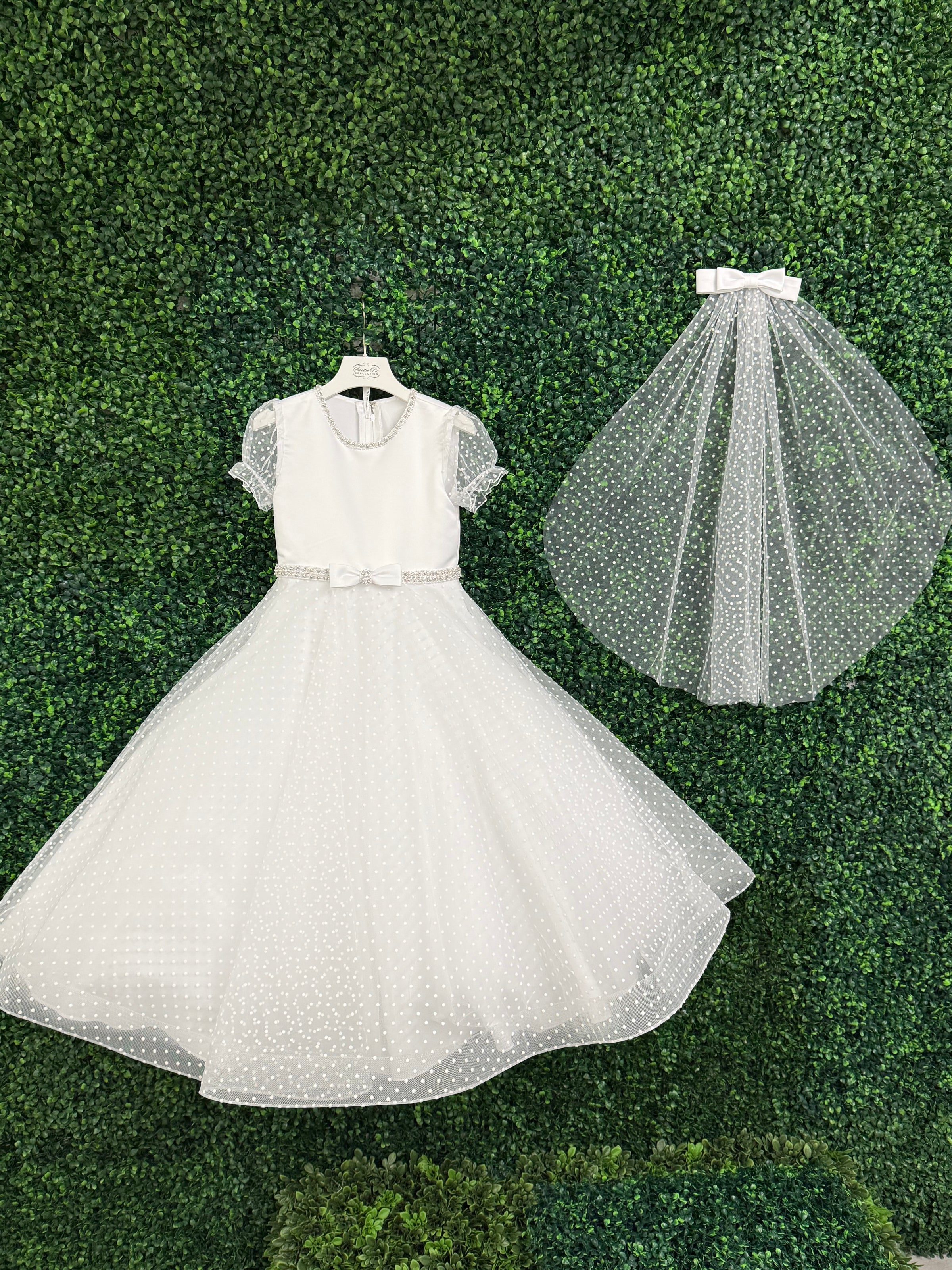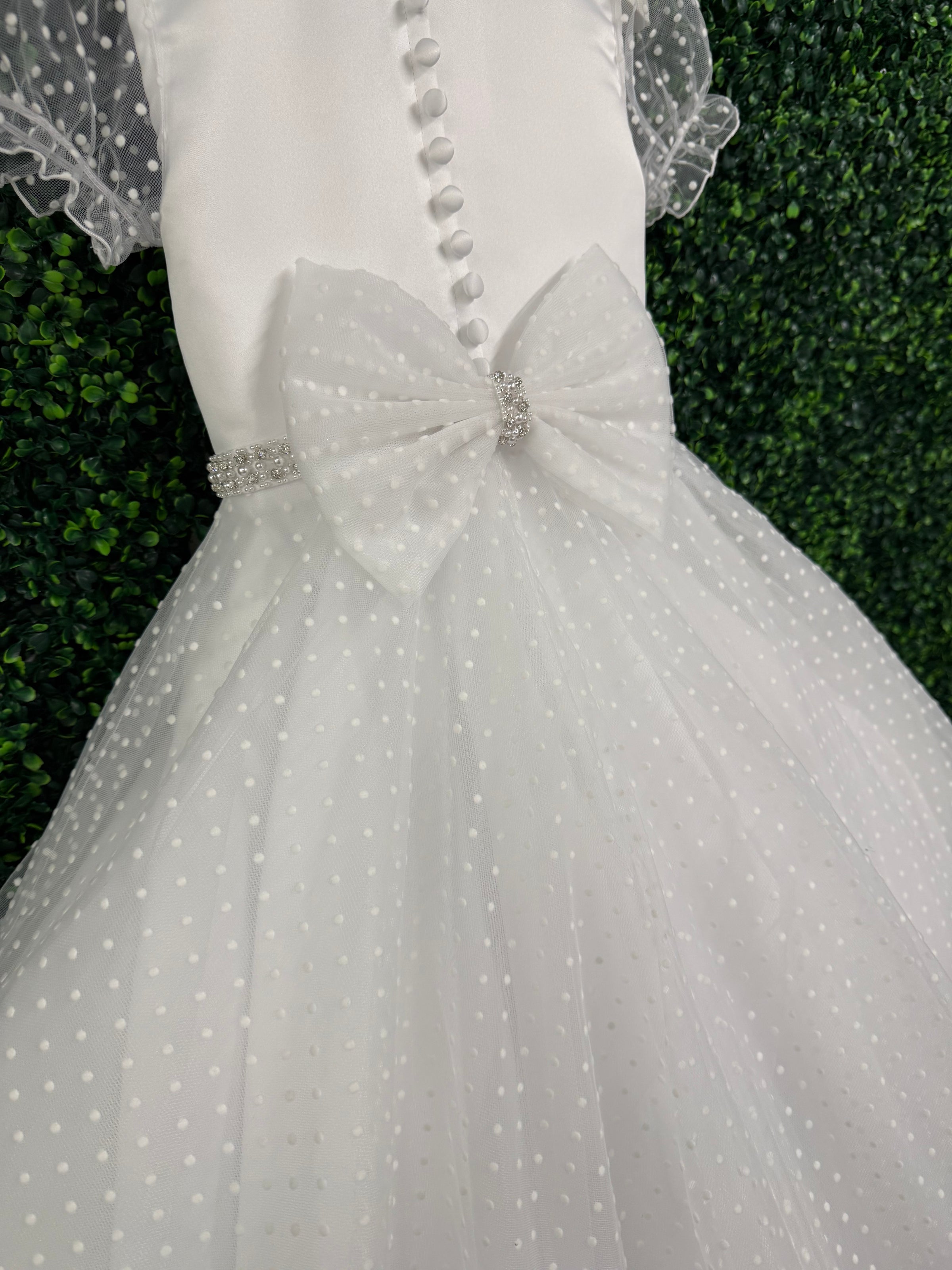 If you’re looking for a twist to your traditional gown, this one's for you. This tulle communion dress with a polka dot pattern, extended sheer puff sleeve, circular skirt, satin bodice , and defined bow. Pearl and beaded belt. Truly a unique piece with its vintage inspired structure! Zipper Closure. Matching veil included!