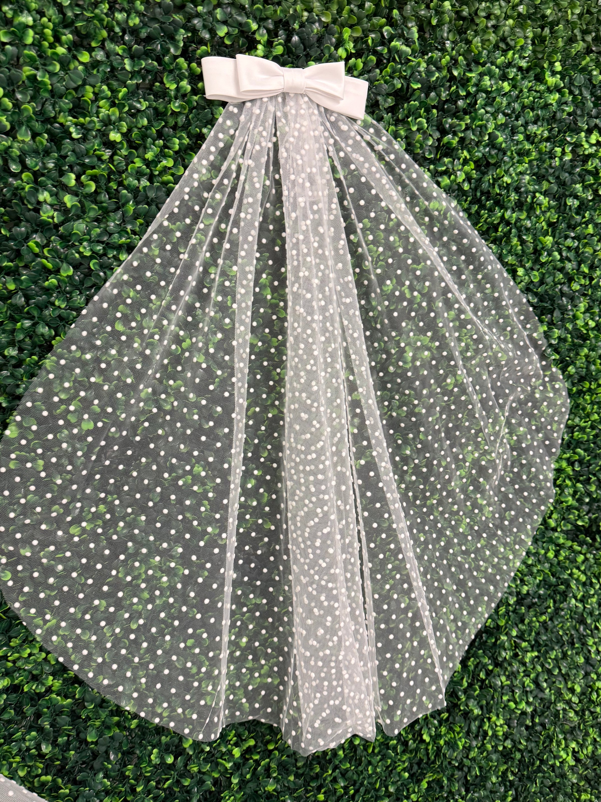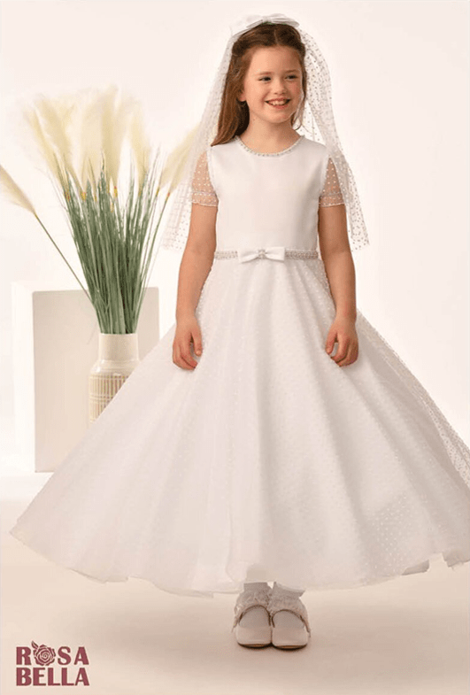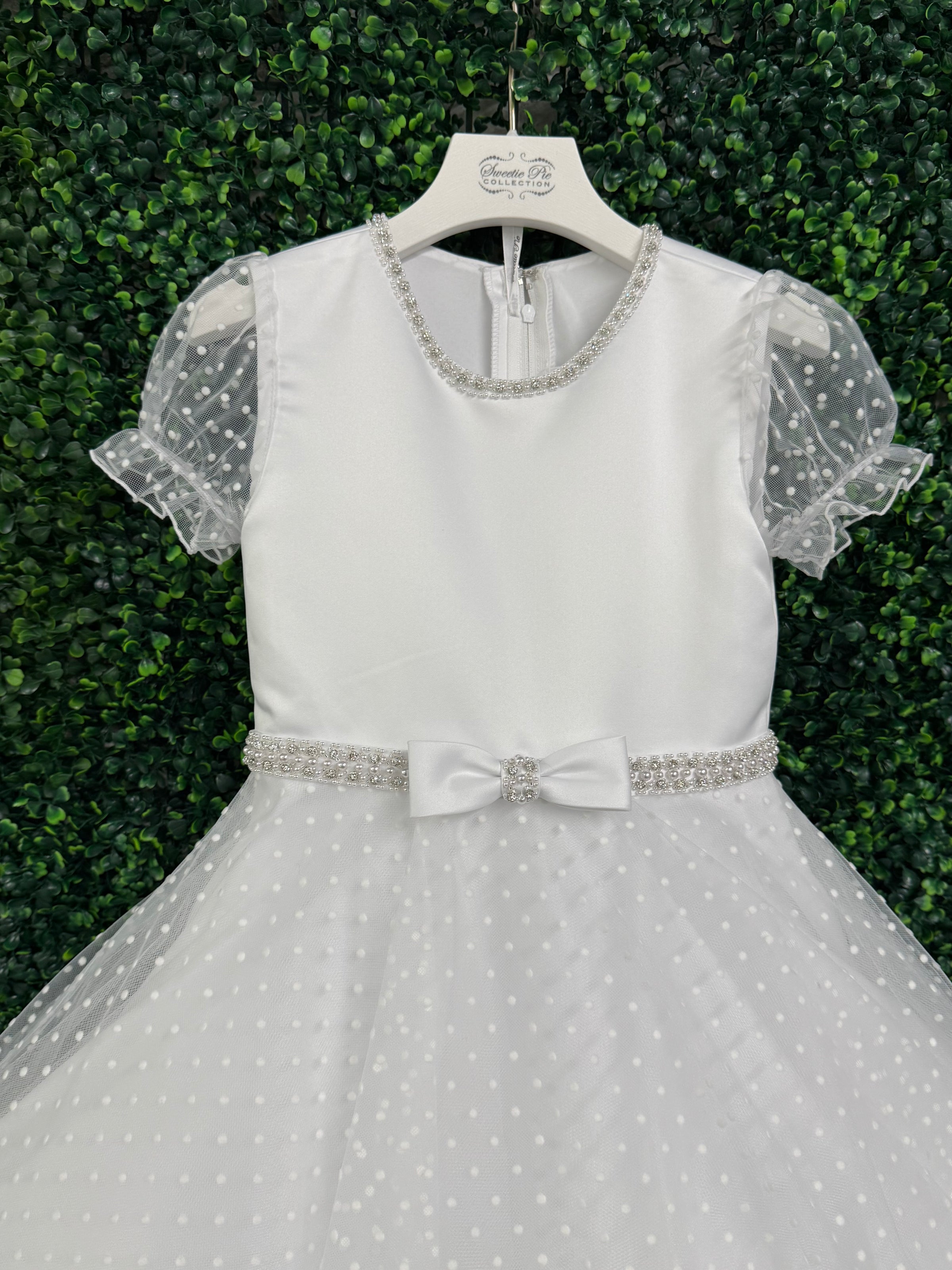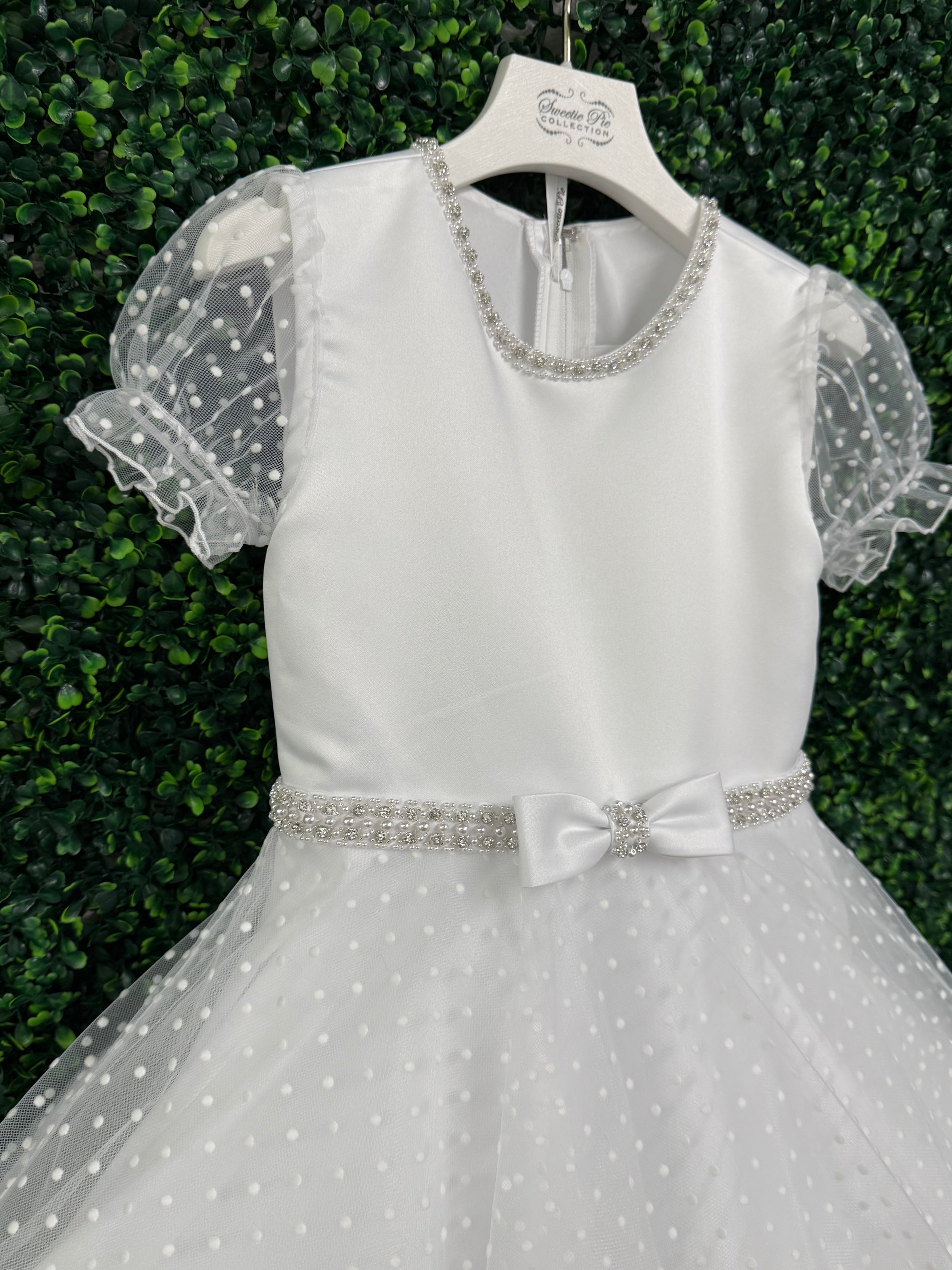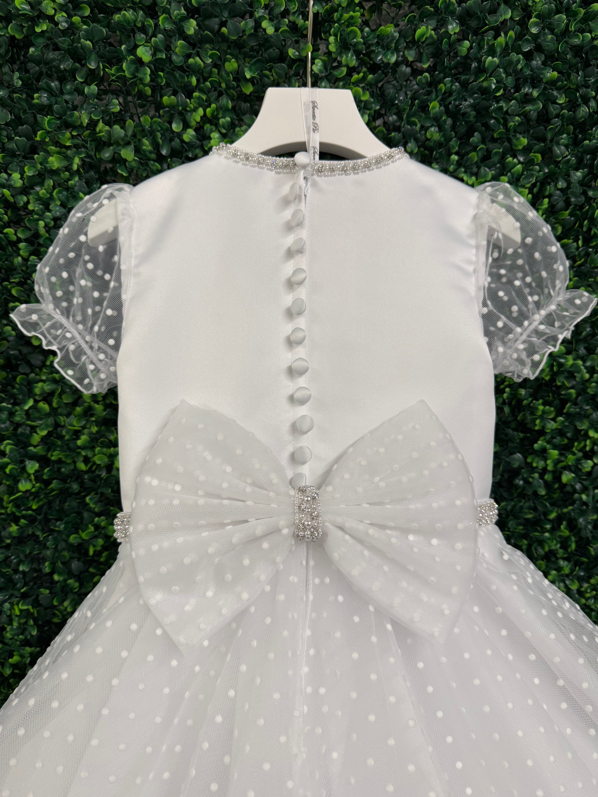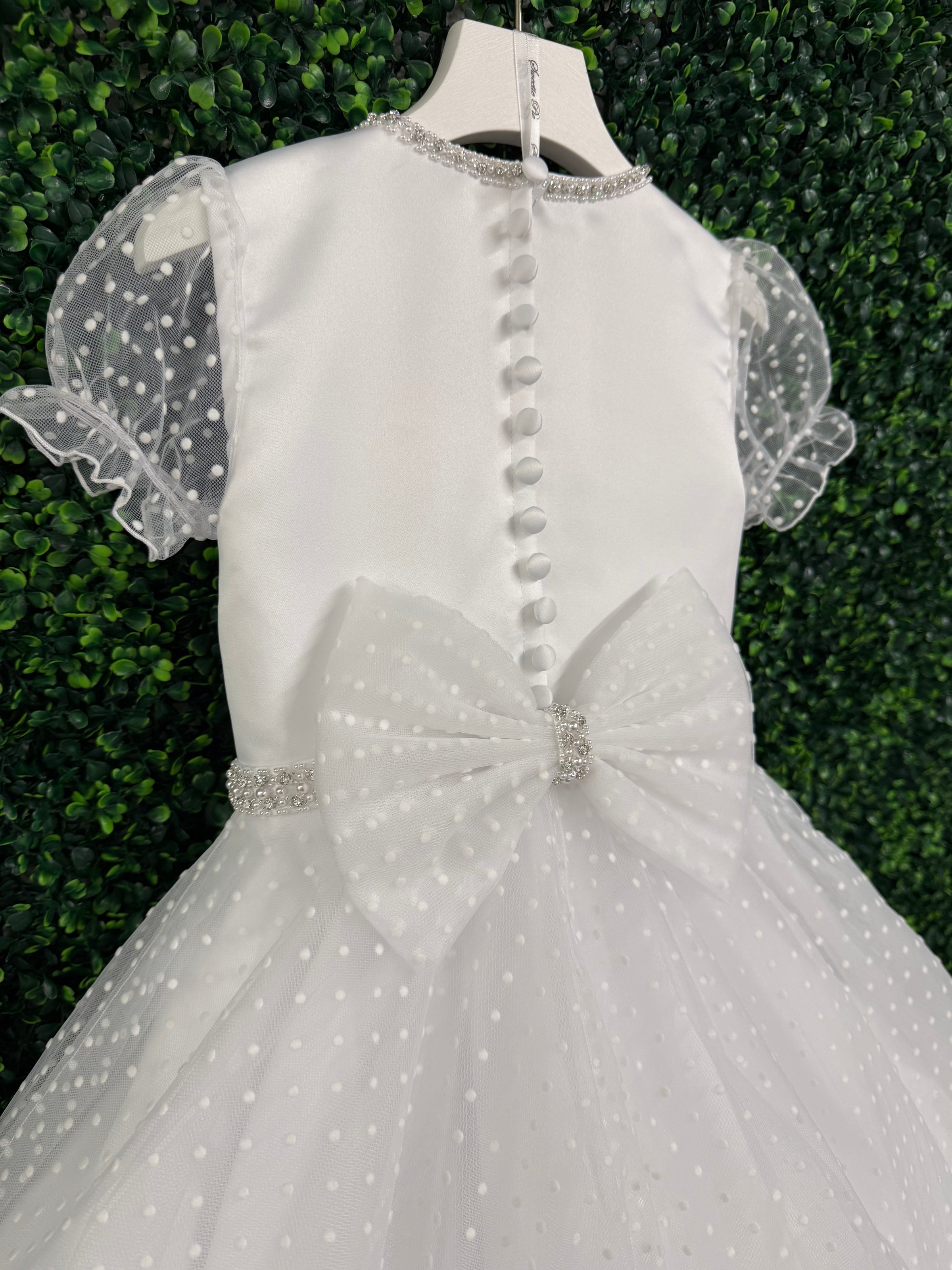 If you’re looking for a twist to your traditional gown, this one's for you. This tulle communion dress with a polka dot pattern, extended sheer puff sleeve, circular skirt, satin bodice , and defined bow. Pearl and beaded belt. Truly a unique piece with its vintage inspired structure! Zipper Closure. Matching veil included!