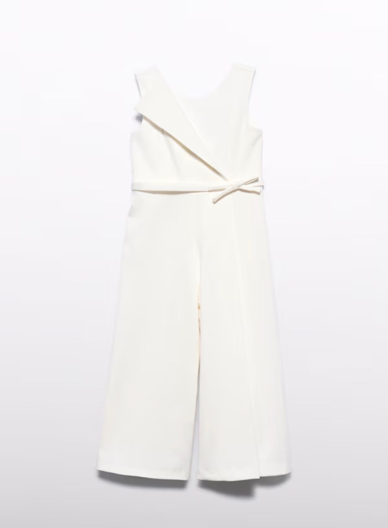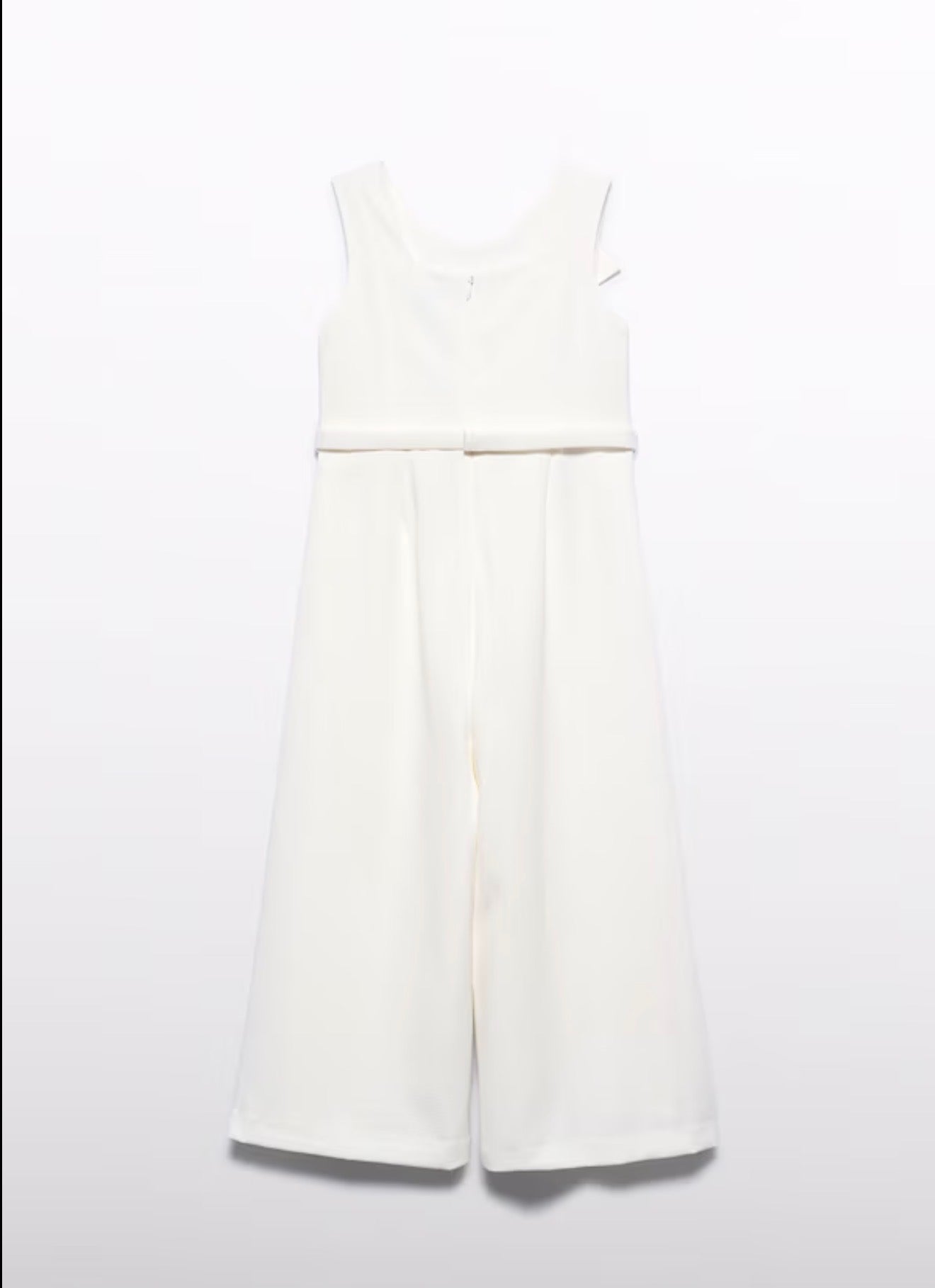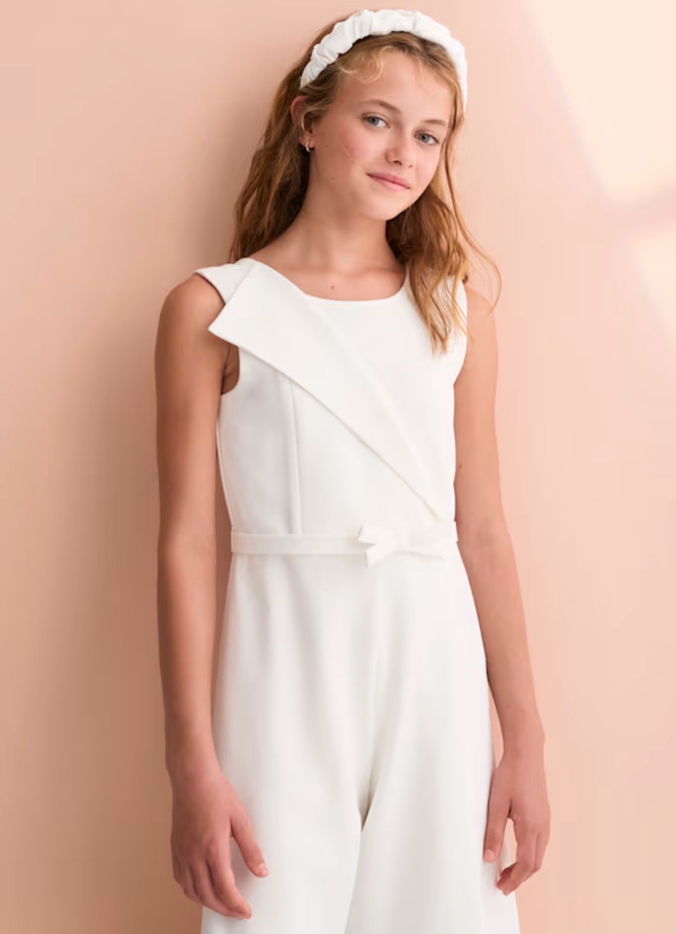 This beautiful jumpsuit makes the perfect after communion changing outfit! Beautiful crepe fabric with cascade detail and bow belt at waistline. Also great for a spring/summer special event or birthday.