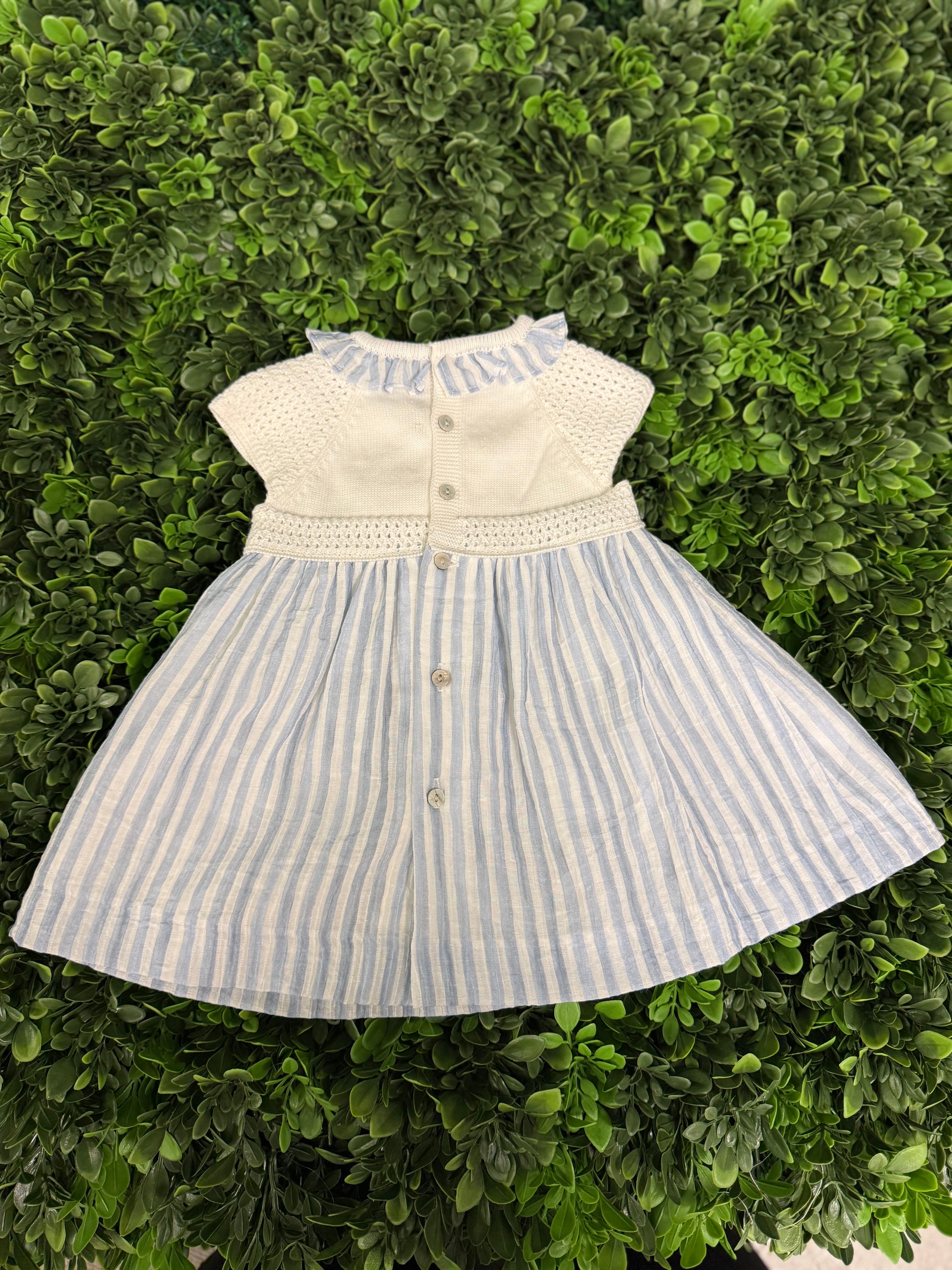 Soft, timeless, and effortlessly charming—this darling dress is made for your sweetest moments.  Featuring a beautifully hand-finished ivory knit bodice with delicate cap sleeves, it’s complemented by a soft blue-and-white striped skirt that flows with gentle movement.  A ruffled neckline adds a touch of vintage elegance, while two perfectly placed bows at the waist create an extra dose of sweetness.  Designed with both style and comfort in mind, the lightweight fabric keeps little ones cool, and the back button closure ensures easy dressing.