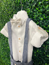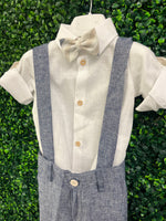 Made in Italy! This darling linen button down collared shirt  and suspender set offers a sharp look.  Matching indigo linen suspender pants and striped bow tie  to complete the outfit. Perfect for a changing outfit or party.  Item is in stock and ships immediately.
