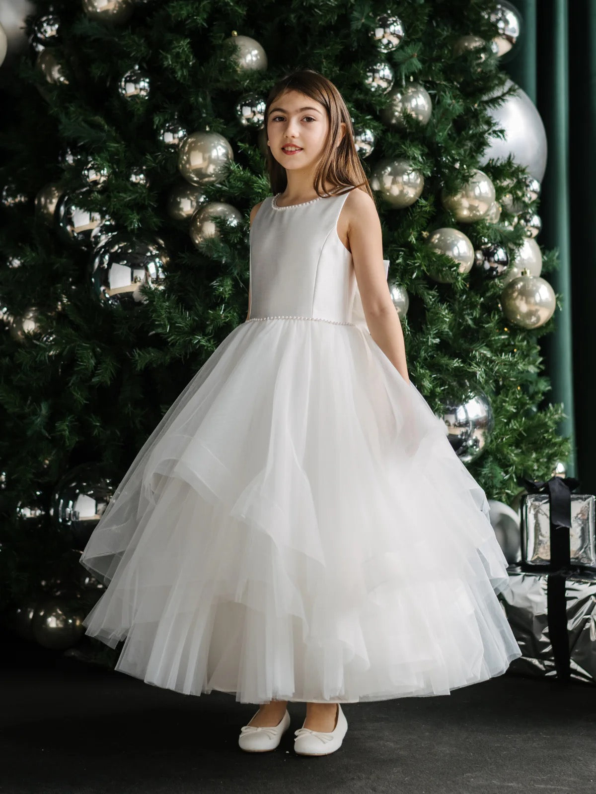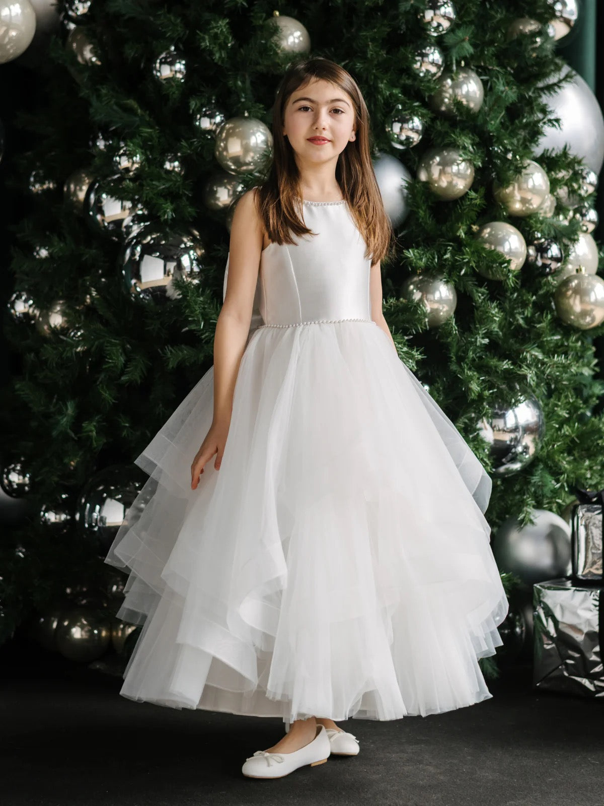 A beautiful gown featuring a textured satin bodice with delicate pearl lined neckline and waistline. Gown features a V shaped  back and a round neckline.  Horsehair trimmed tiered skirt makes it perfect for twirling!  Zipper closure make for an easy and comfortable fit!  Teter Warm dresses are light weight, soft and lined in cotton.  Great option for sensory or delicate skin!