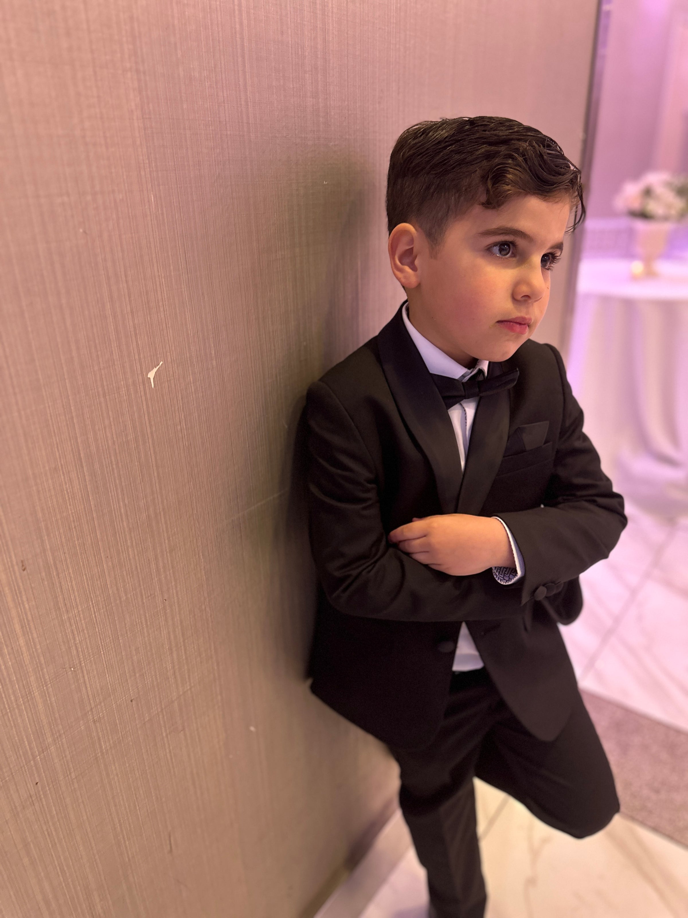 Boys tuxedo in regular fit with slim pant.  Tux jacket features satin lapels, buttons, and pocket square.  Black pants have a slim fit.  Pair with a white shirt, bow tie, and black shoes to complete the look!  Perfect for any special occasion or for ring bearer.