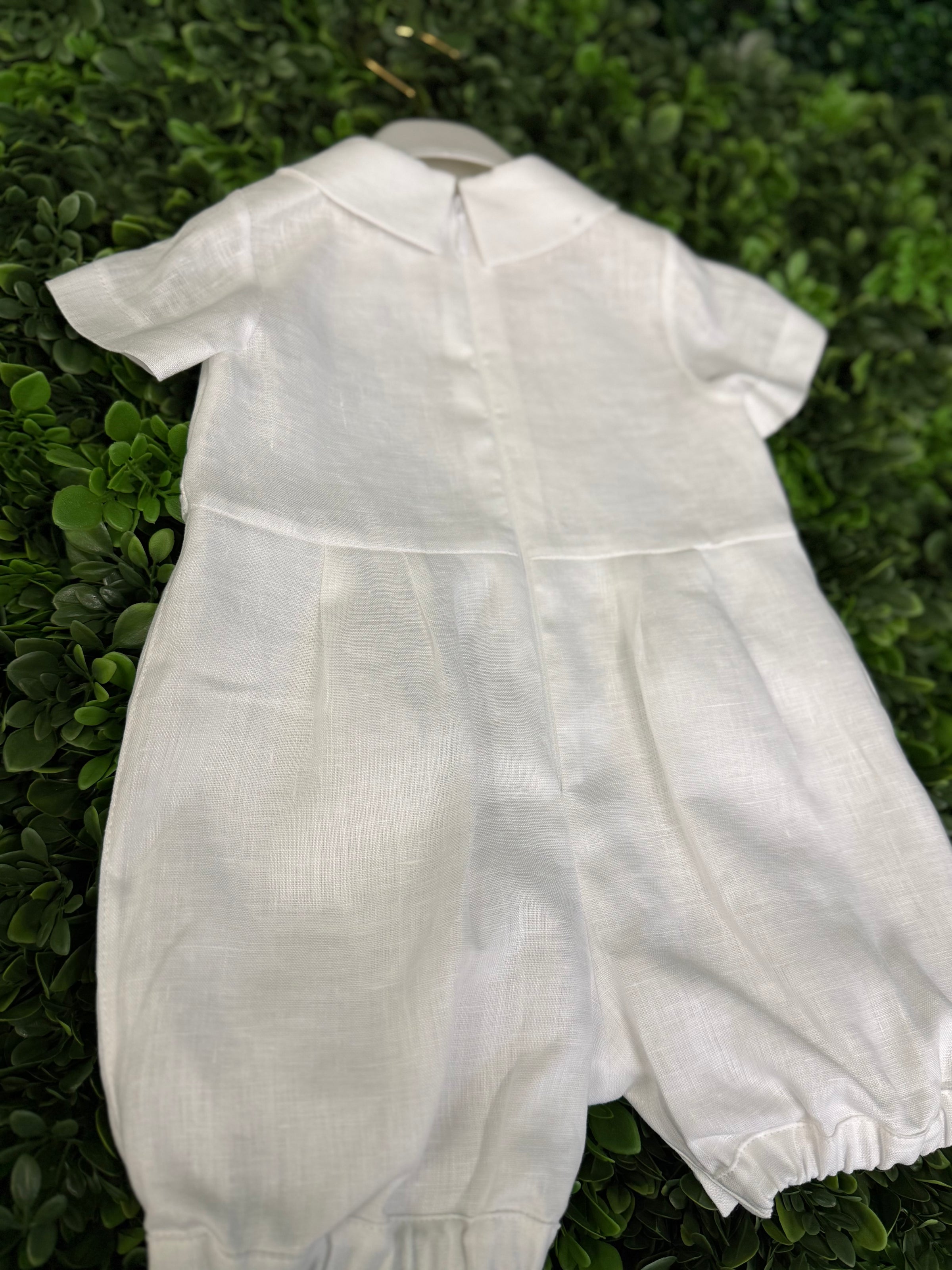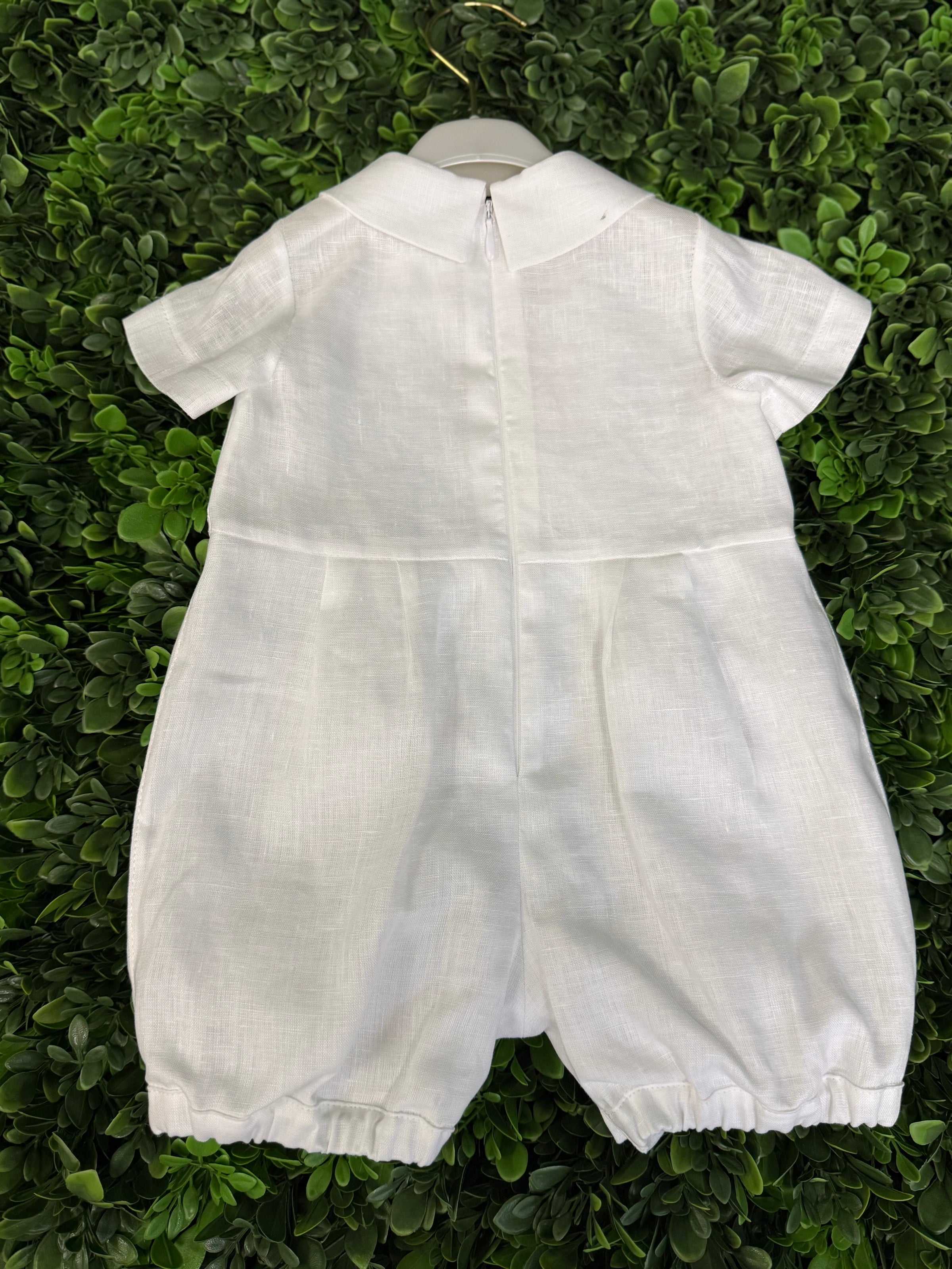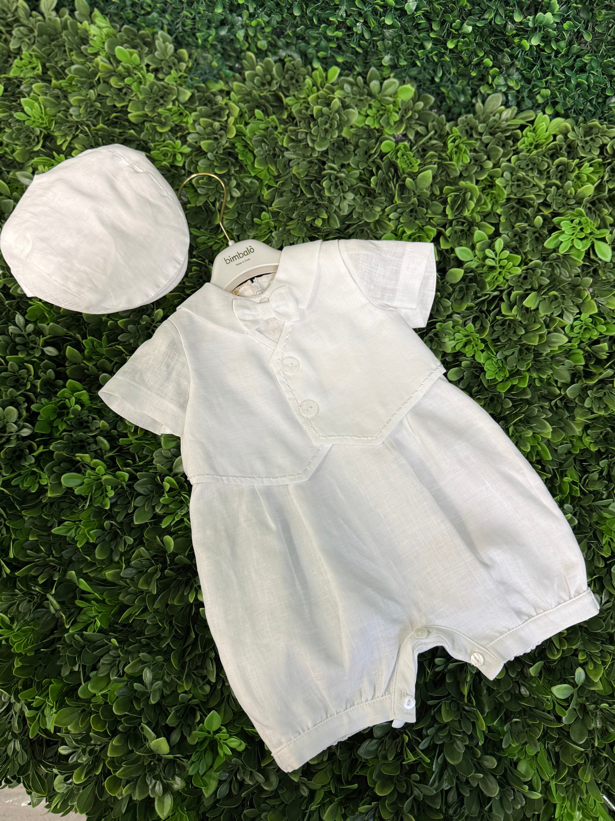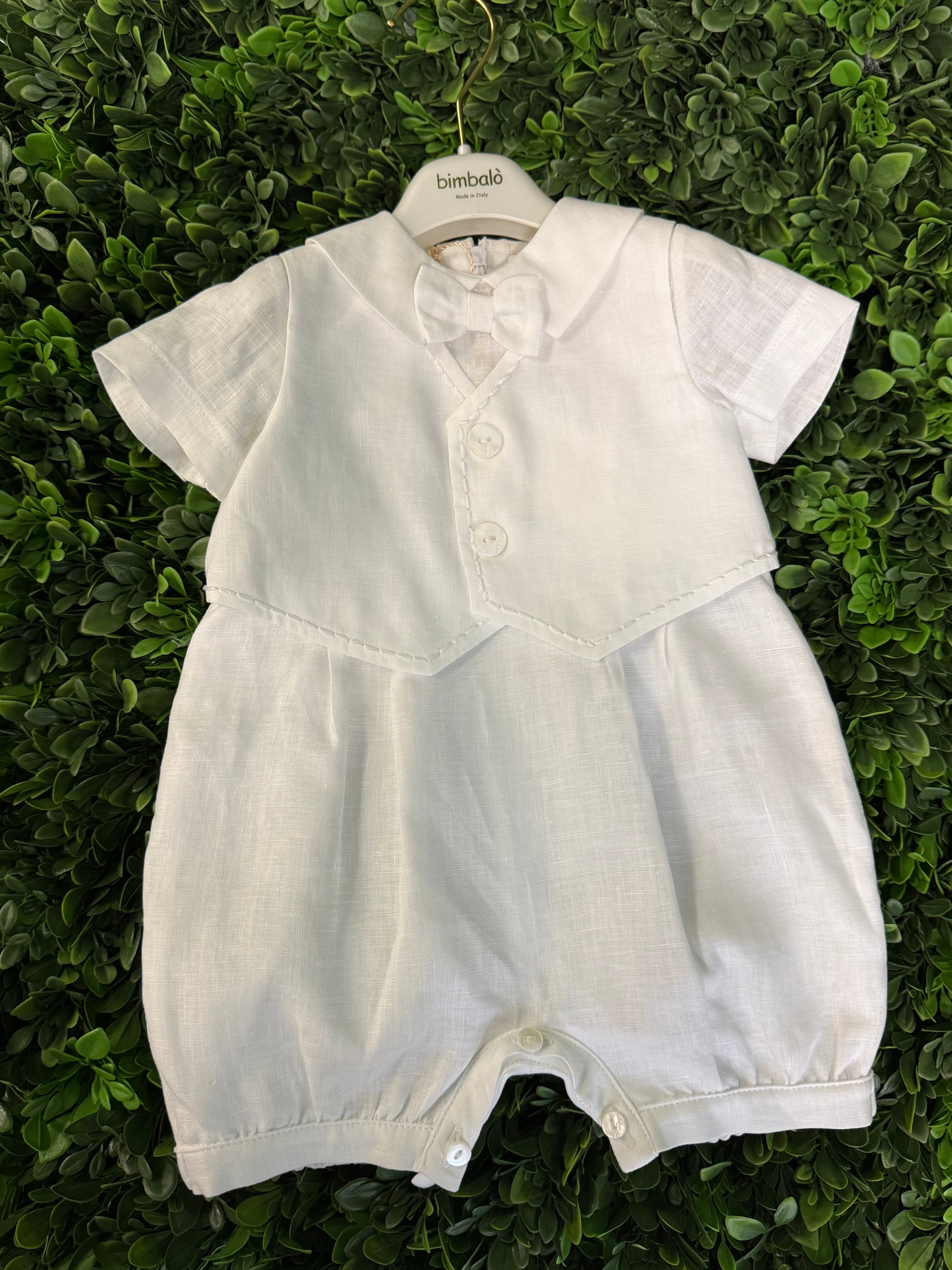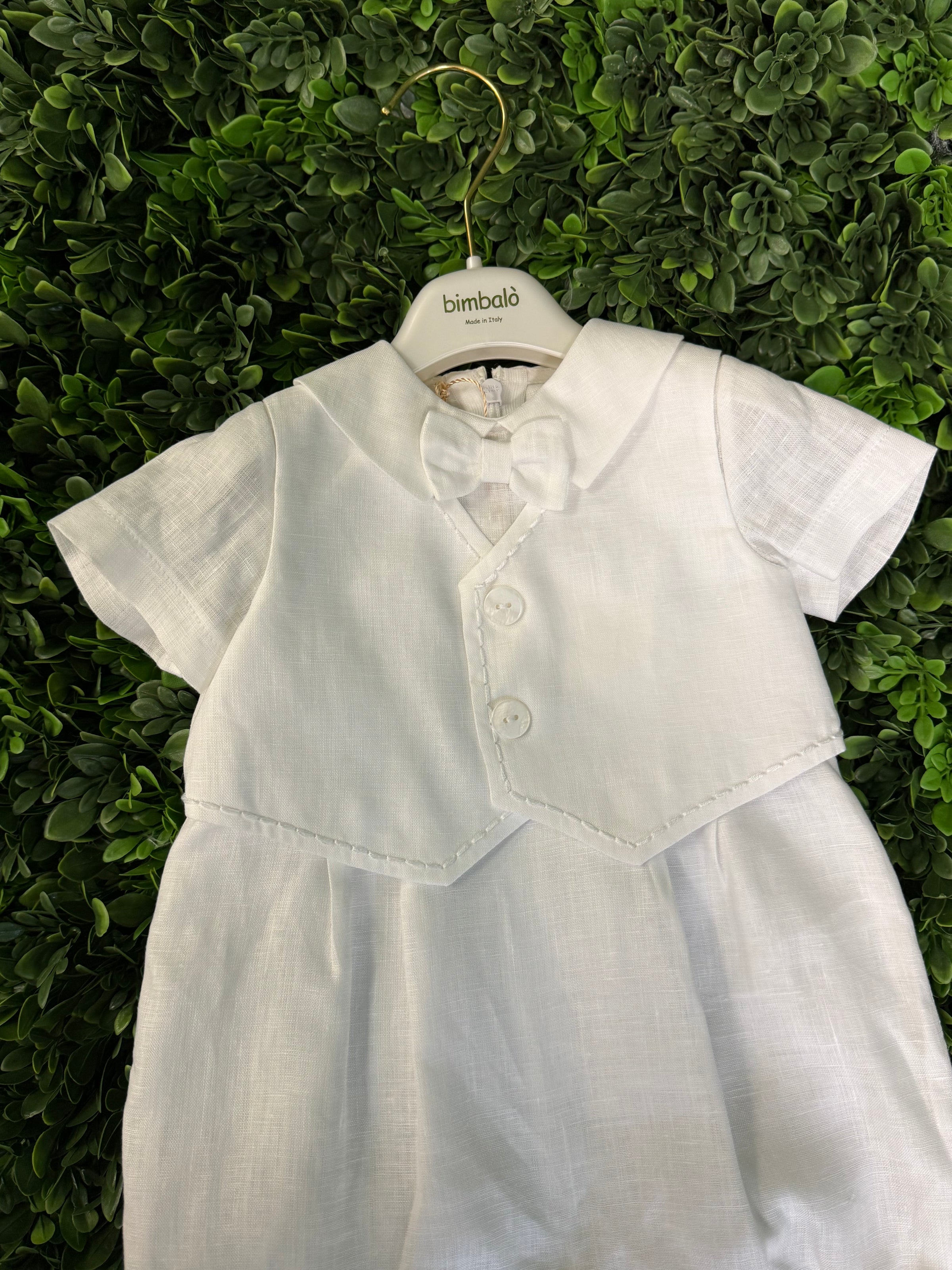 Made in Italy!!  Exquisite quality!  This adorable cotton and linen romper by Bimbalo features a vest with exposed stitching detailing, a sweet bow tie,