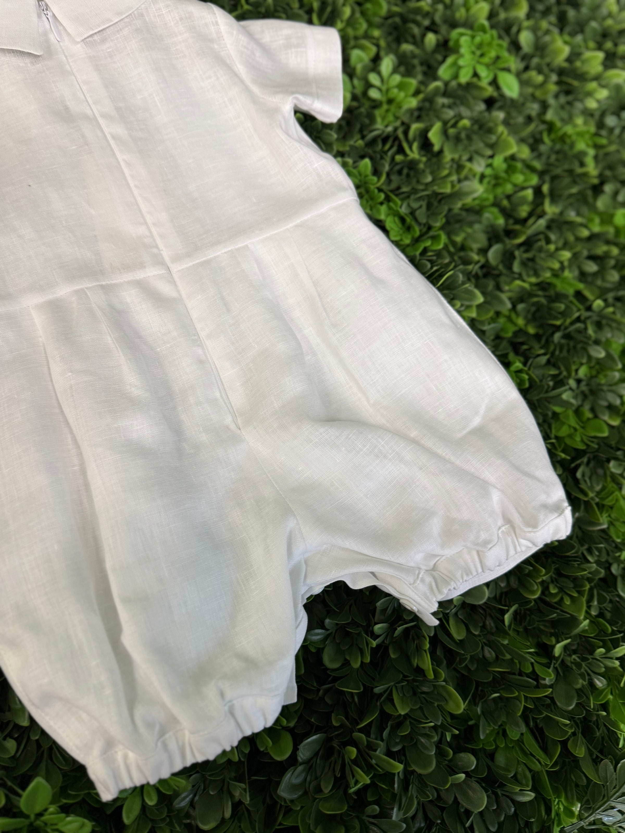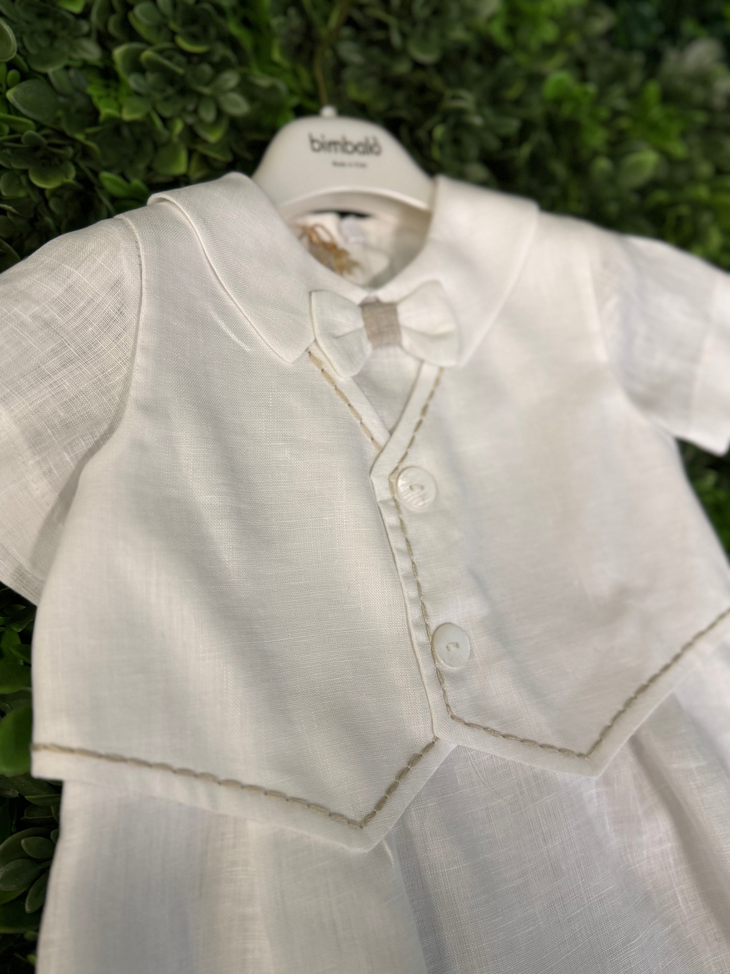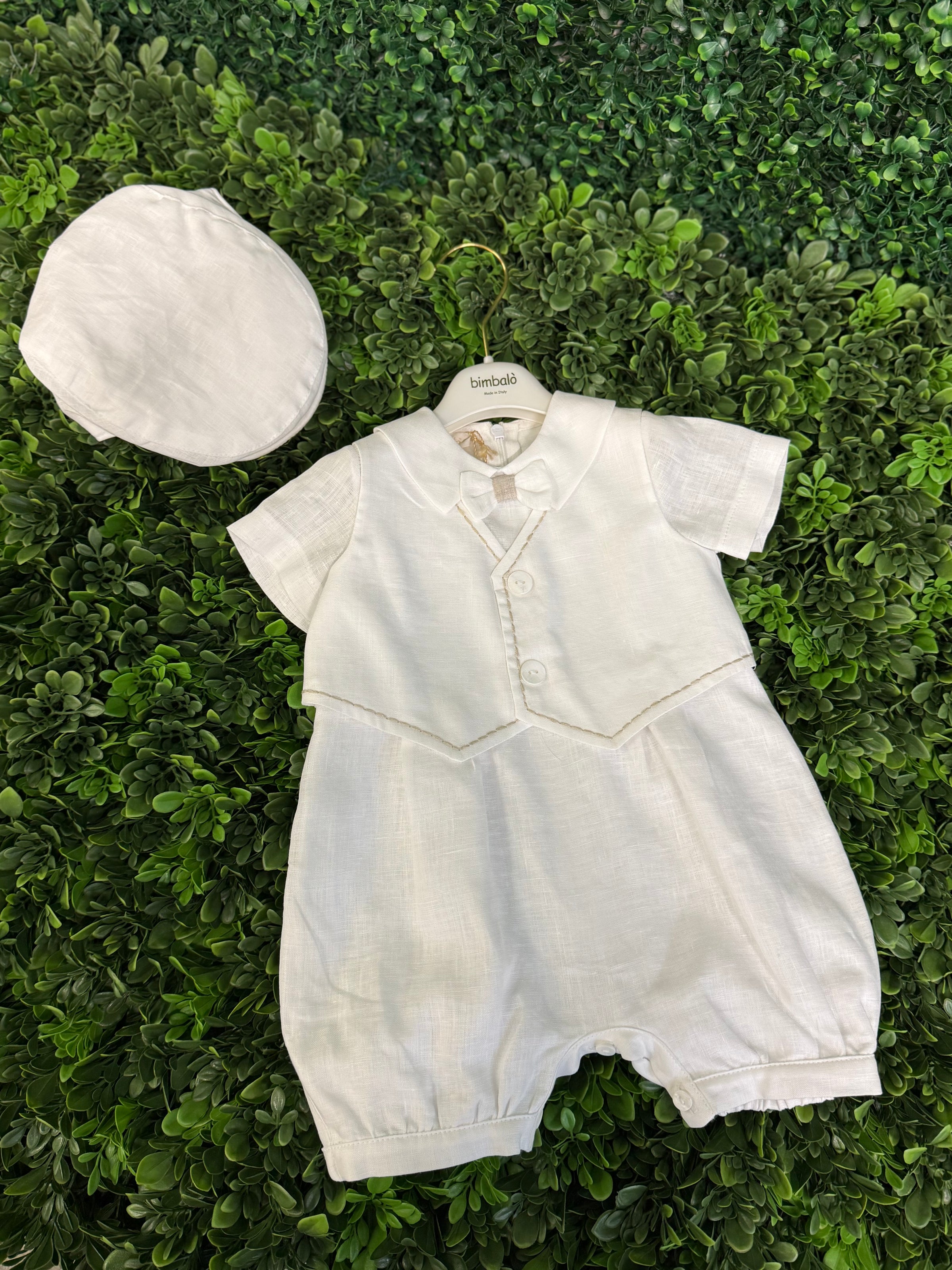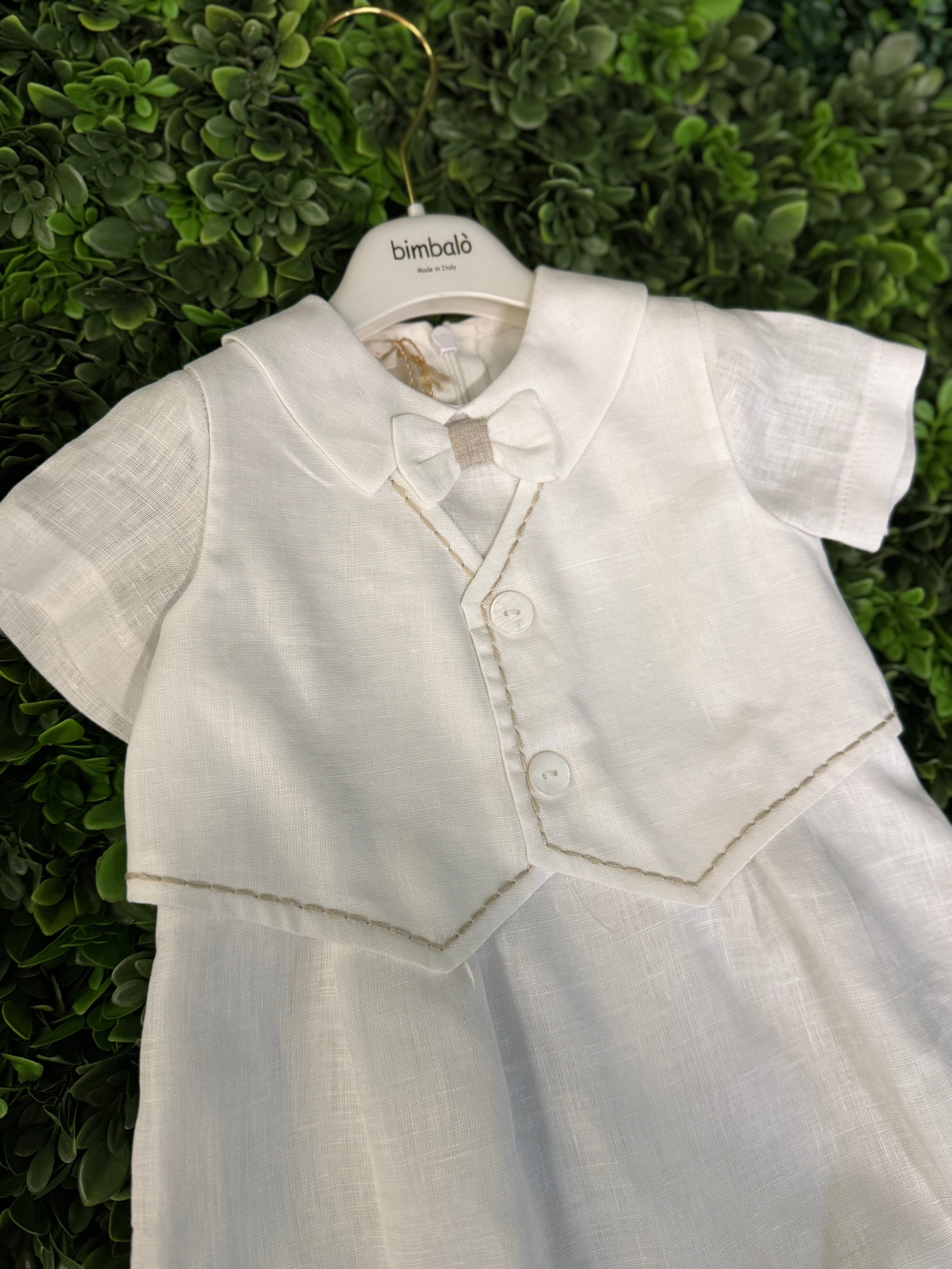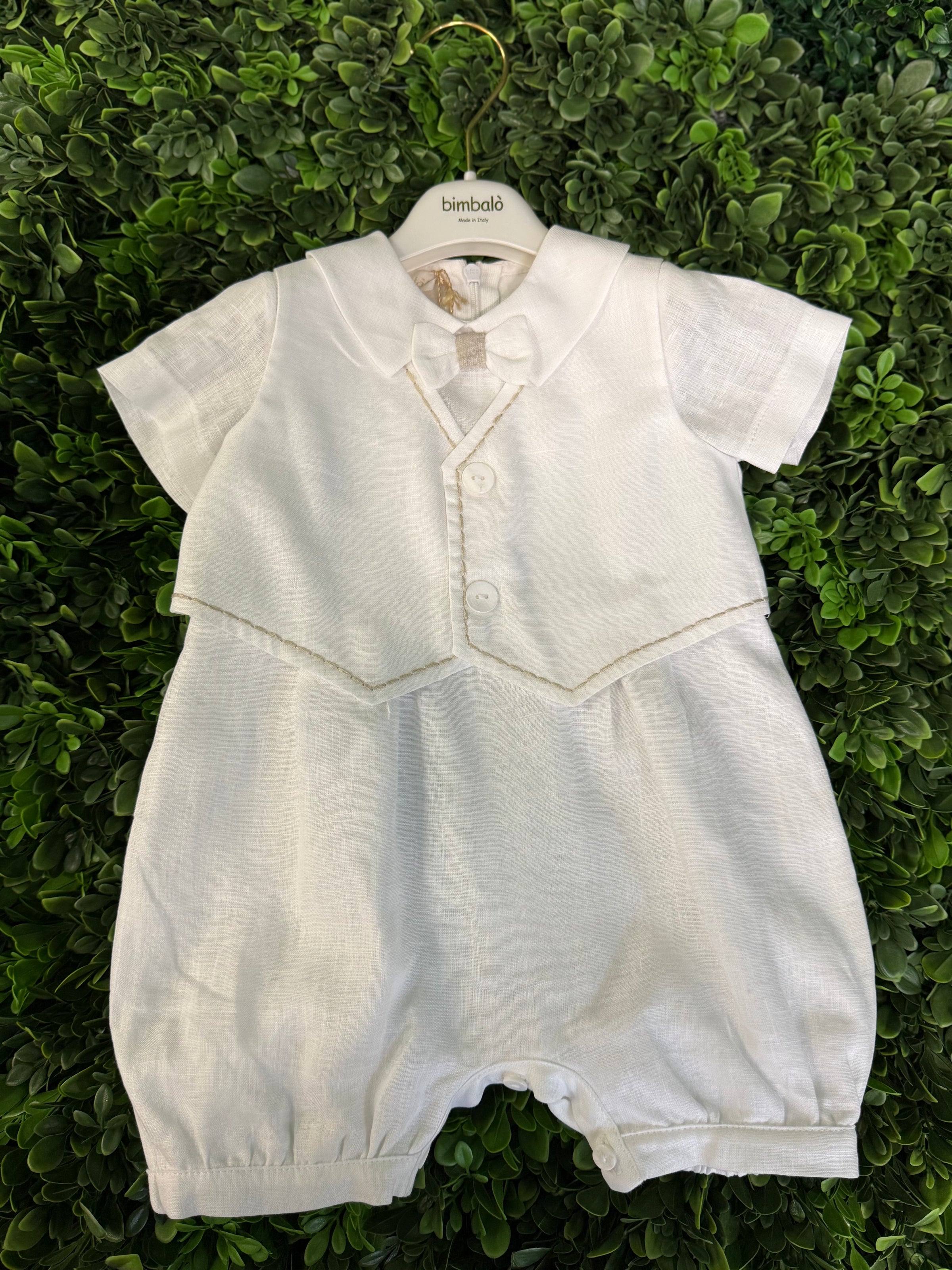 Made in Italy!!  Exquisite quality!  This adorable cotton and linen romper by Bimbalo features a vest with exposed stitching detailing, a sweet bow tie,