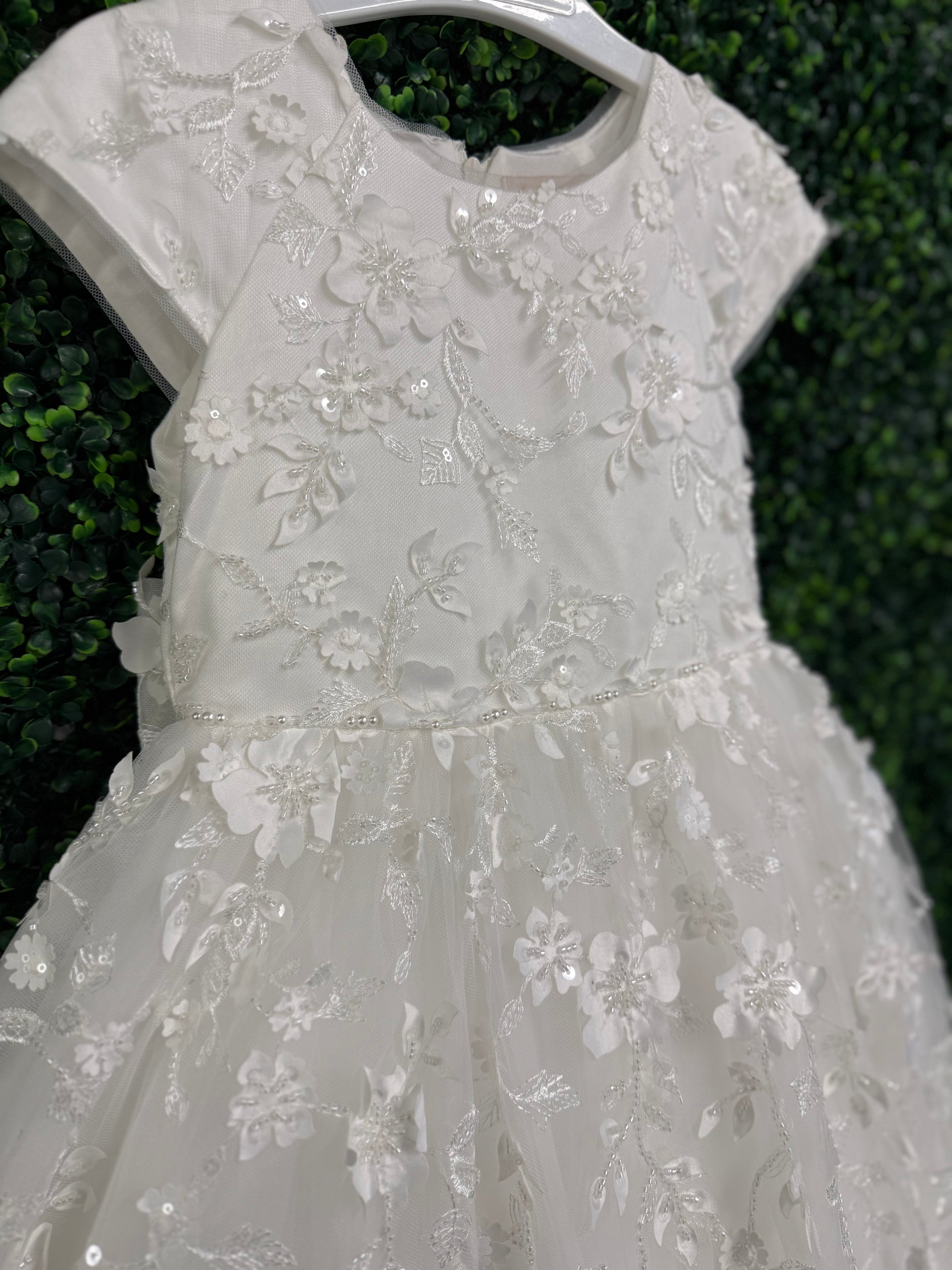 Delicately designed for your little girls special day.  Made with enchanting beaded 3D floral appliqués cascading across a multi-layered tulle skirt. The pleated hem adds a modern twist.  This ethereal gown features a cap sleeve.  Bow back with coordinating floral embellishments.