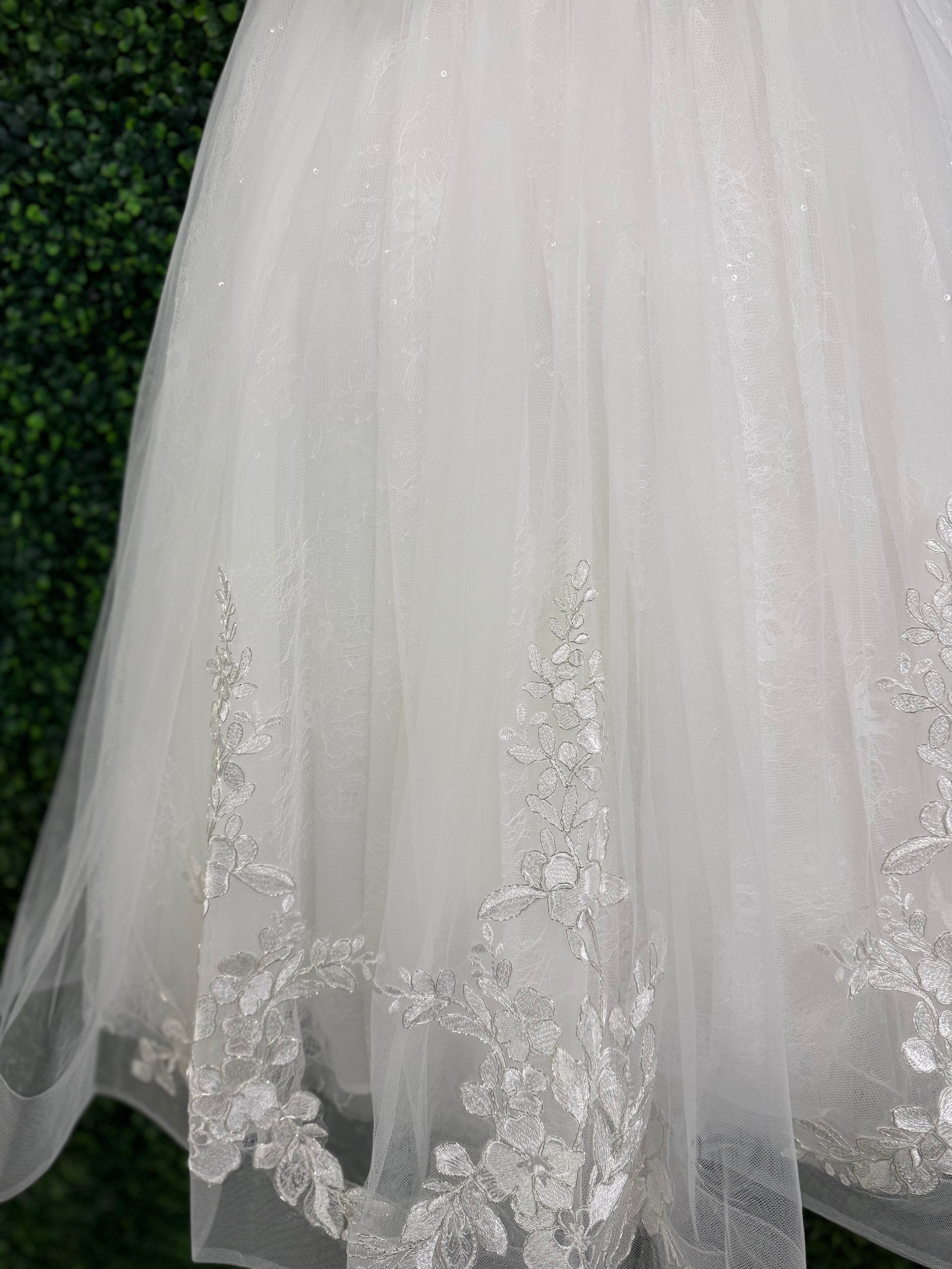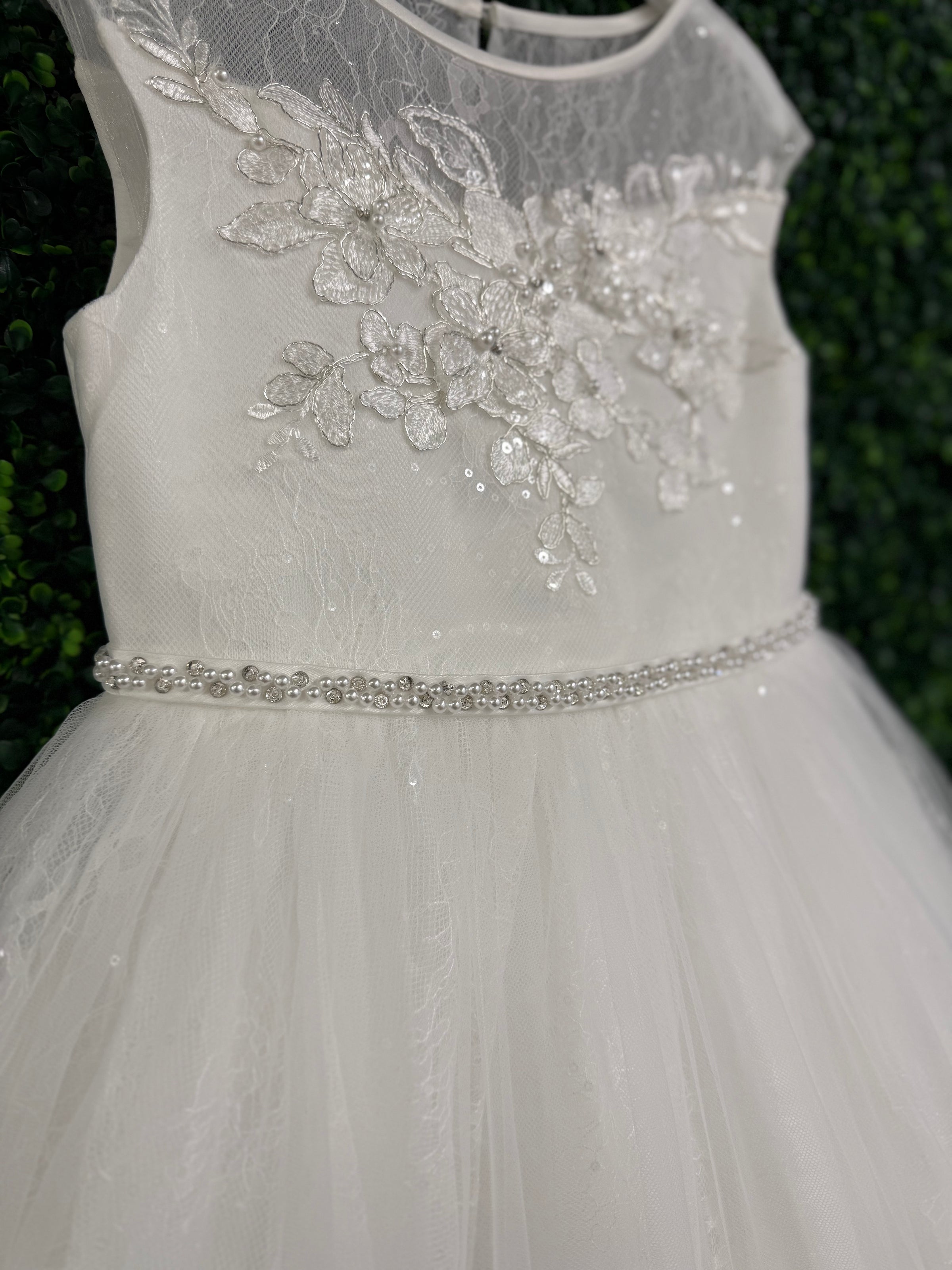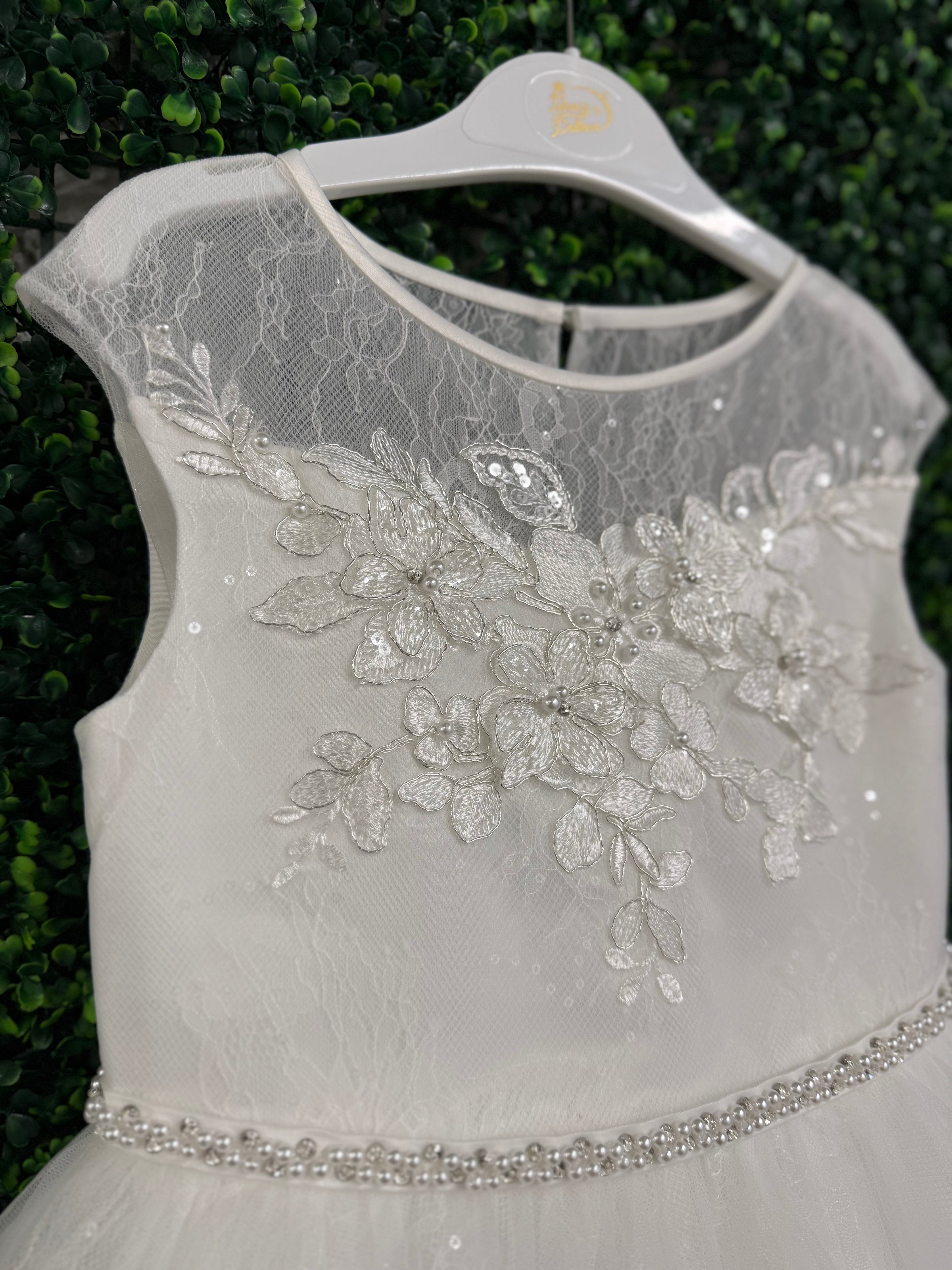 A sweet and delicate lace gown.  A sleeveless bodice that features metallic floral lace appliqués and beading.  A pearl belt along the waistline leads into a full circle skirt.  The skirt is finished with floral appliqués along the hemline. Dress is soft and comfortable!  Zipper closure.