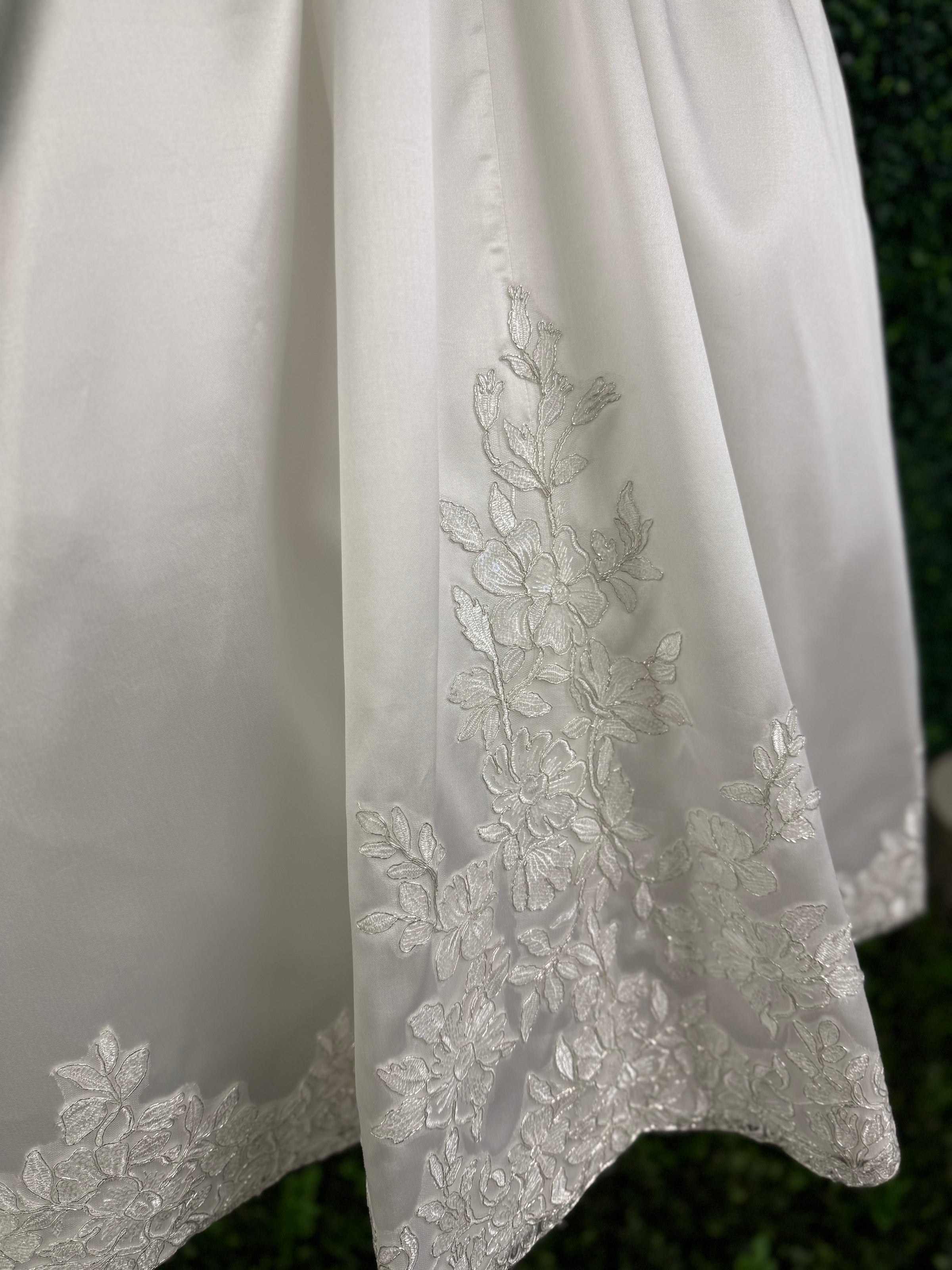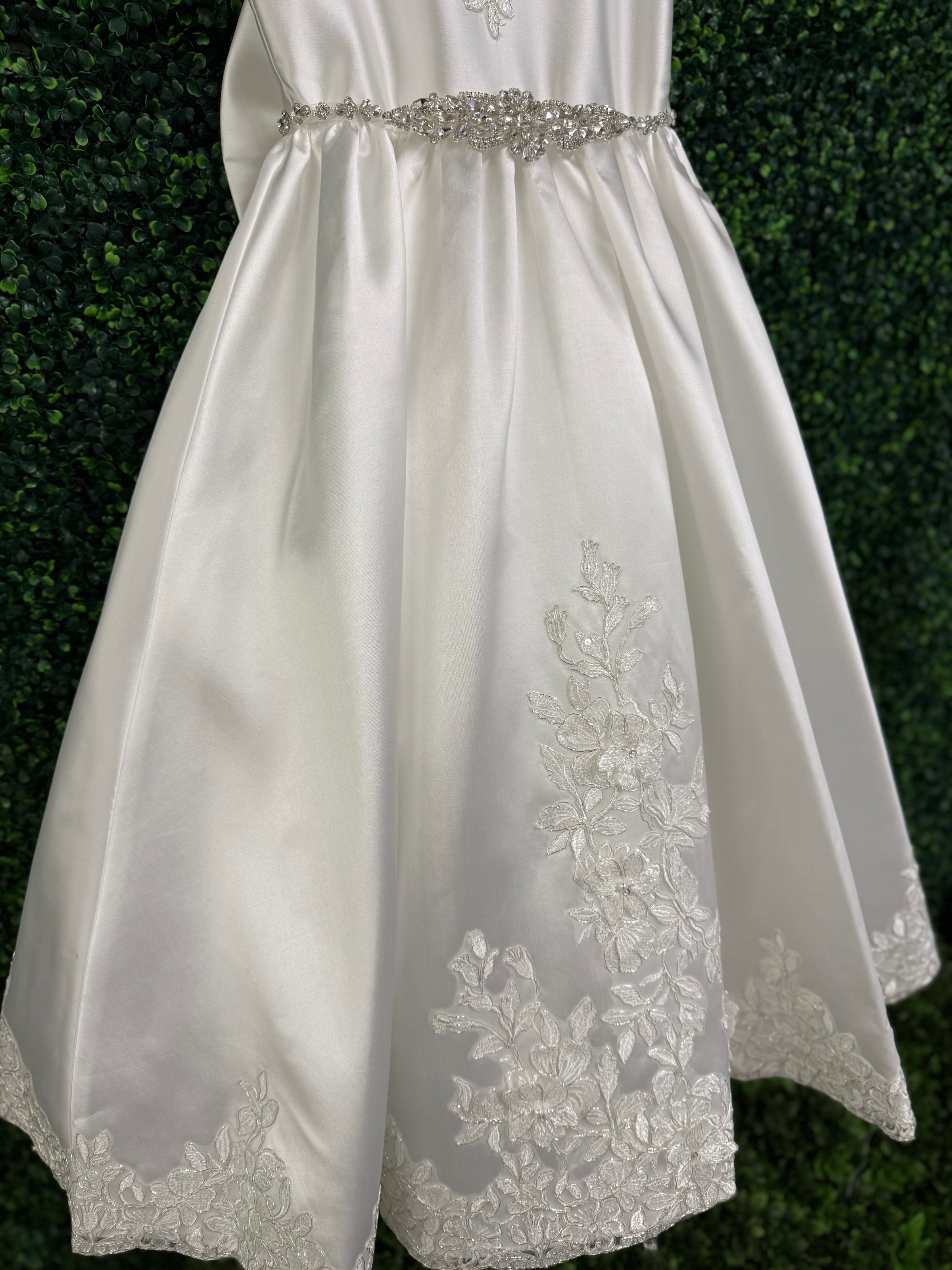 Step into a fairytale with the exquisite Princess Daliana Girls’ mikado and placed lace gown. The mikado provides structure and luster. The bodice features a semi-sheer boat neck effect with beautiful embroidered lace appliqués. At the waistline a sparkly rhinestone trim belt creates a memorizing silhouette. The full box circle skirt features lace appliqués as well as on the hemline.