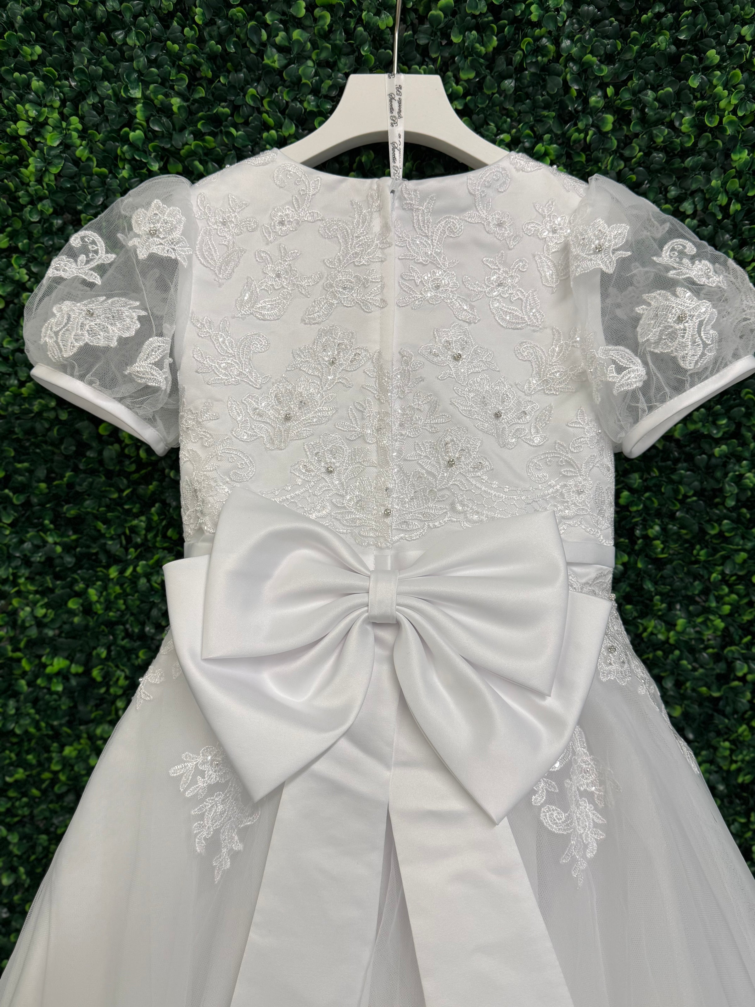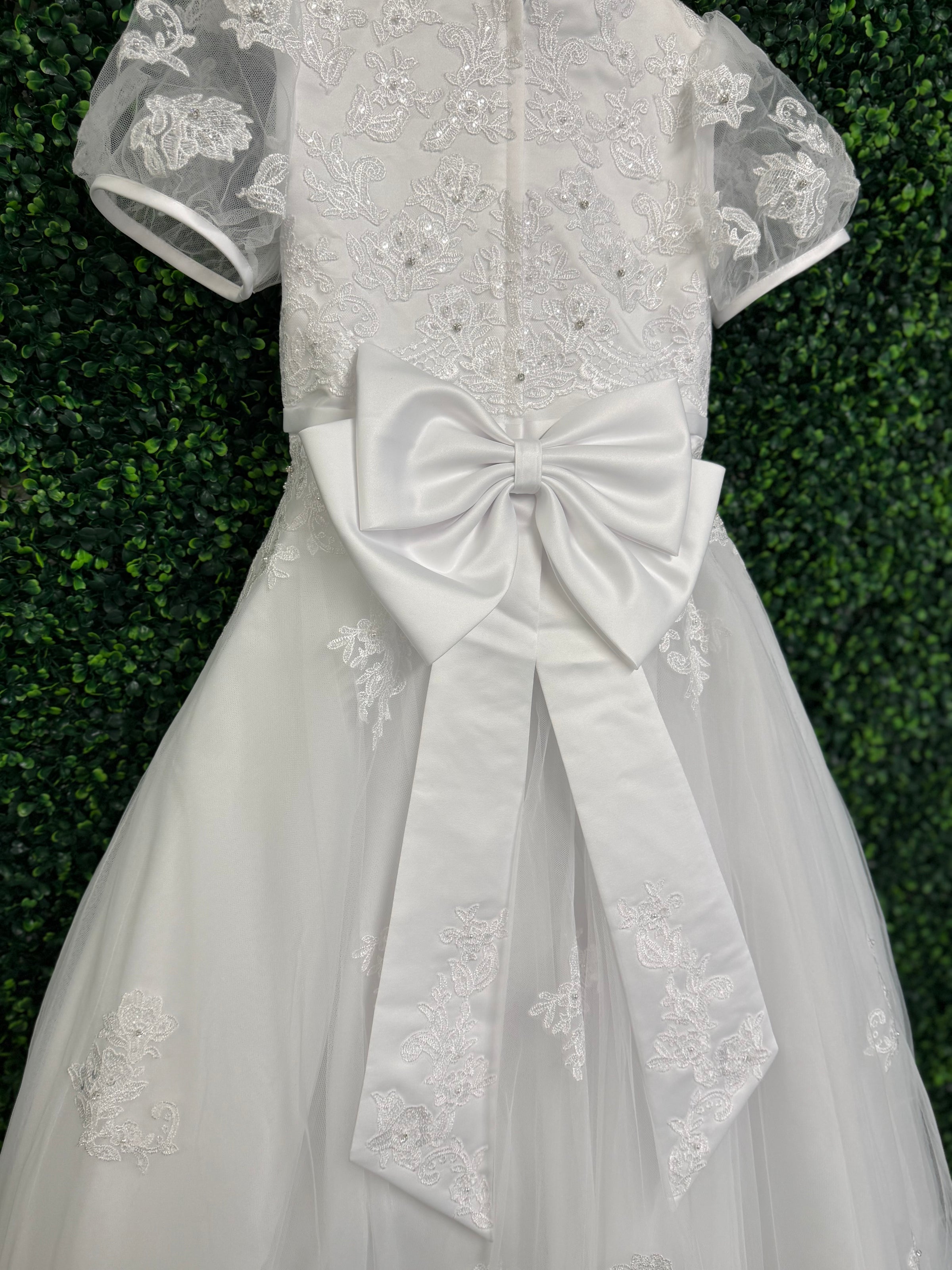 This gorgeous beaded floral lace gown is a classic communion dress. Lace along the bodice and on semi-sheer puff sleeve. Beaded belt along waistline. A full length skirt perfect for twirling with a show stopping bow. Zipper Closure.