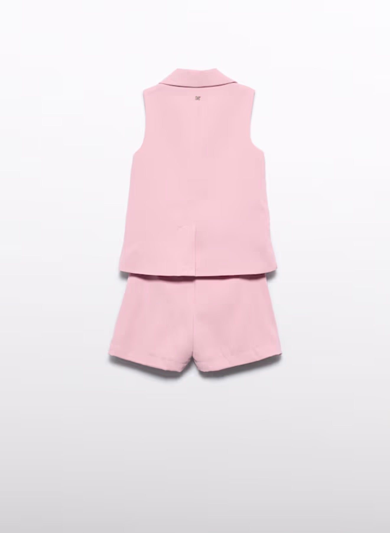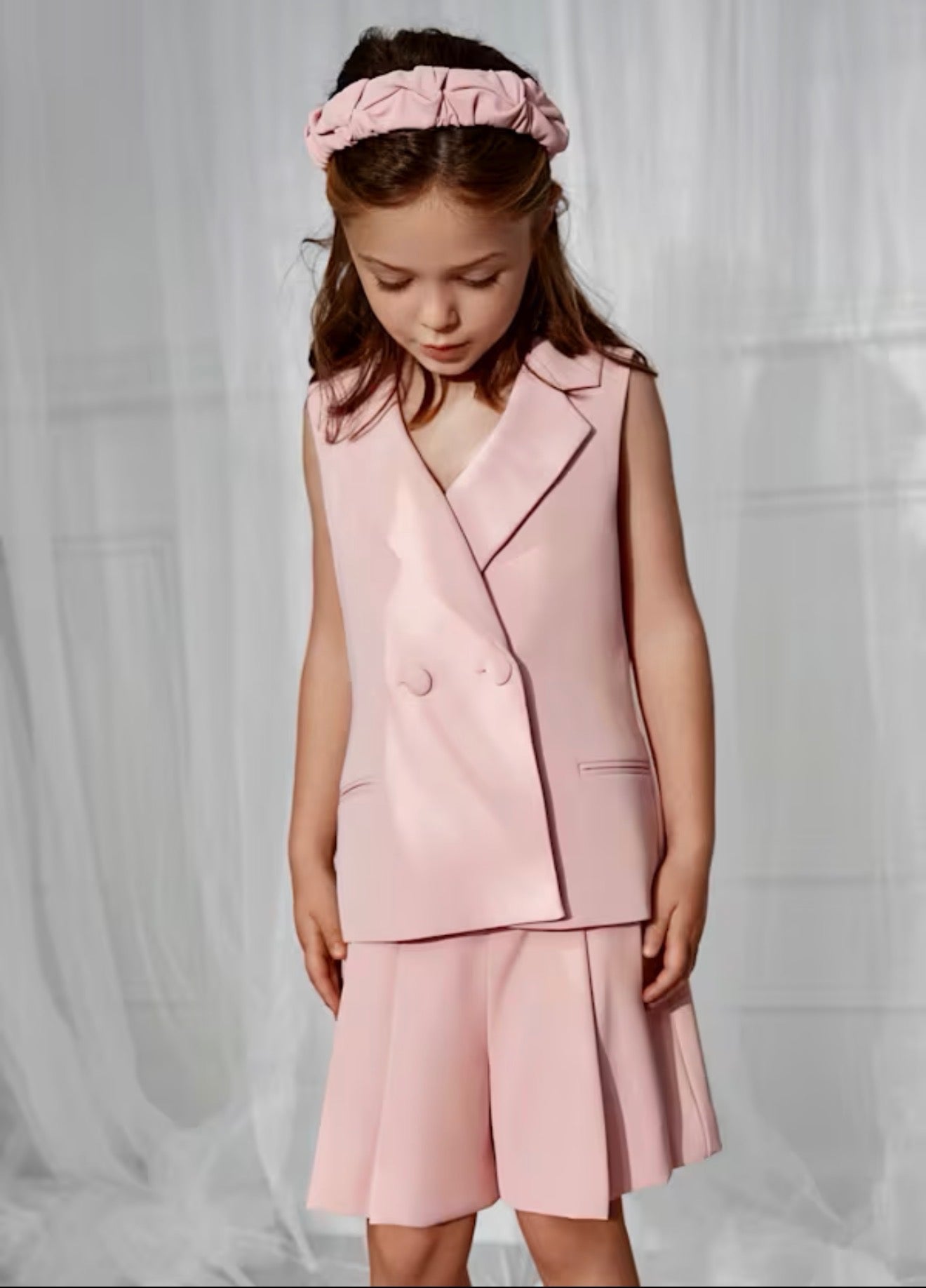 This chic blush crepe two piece vest and short set makes the perfect outfit for spring or summer!  Double breasted sleeveless blazer for a sophisticated look!  Set comes with matching box pleated shorts.  Wear with sandals for a dressy look, with sneakers for a fun look and with flip flops for a beach look!