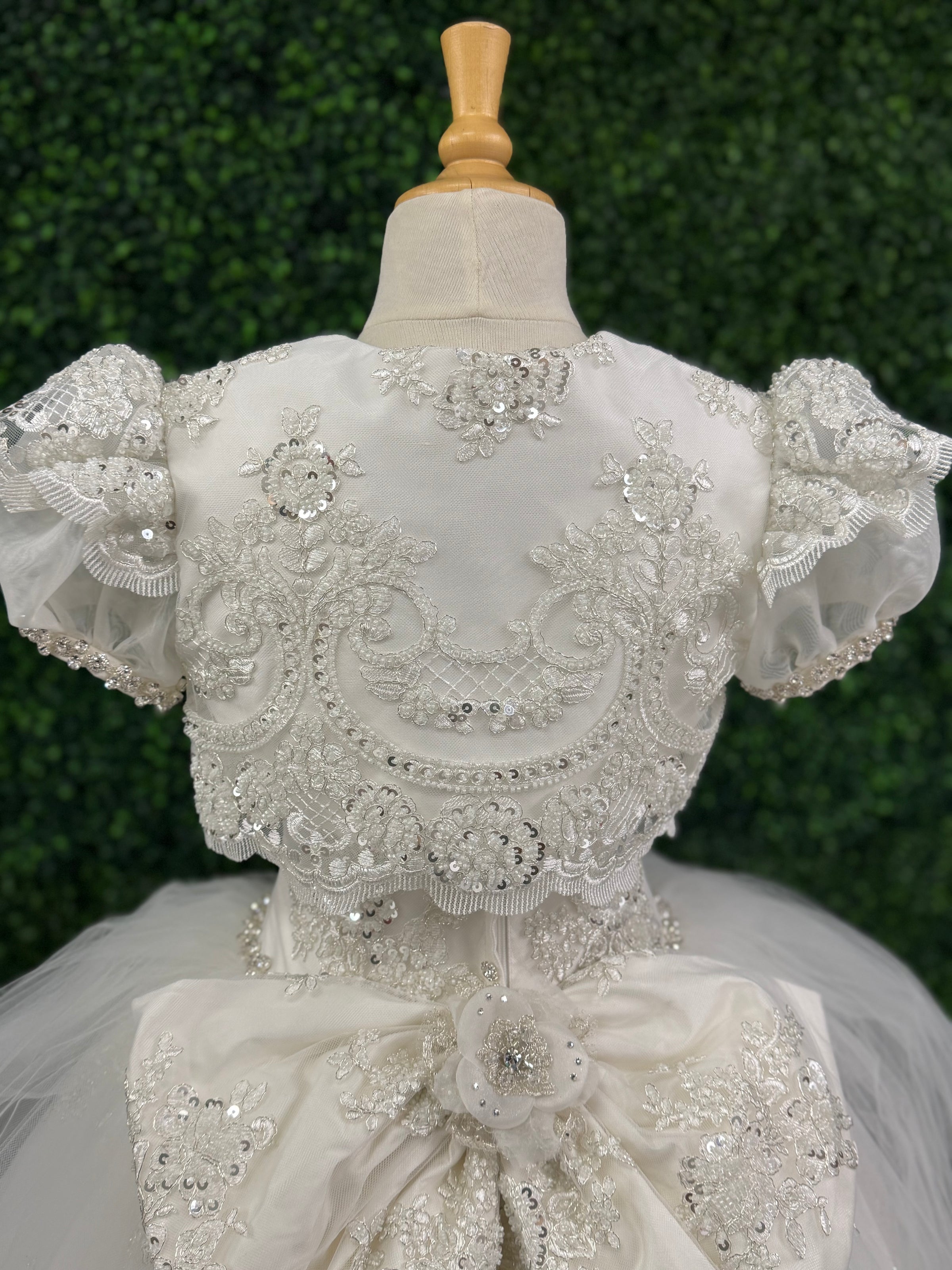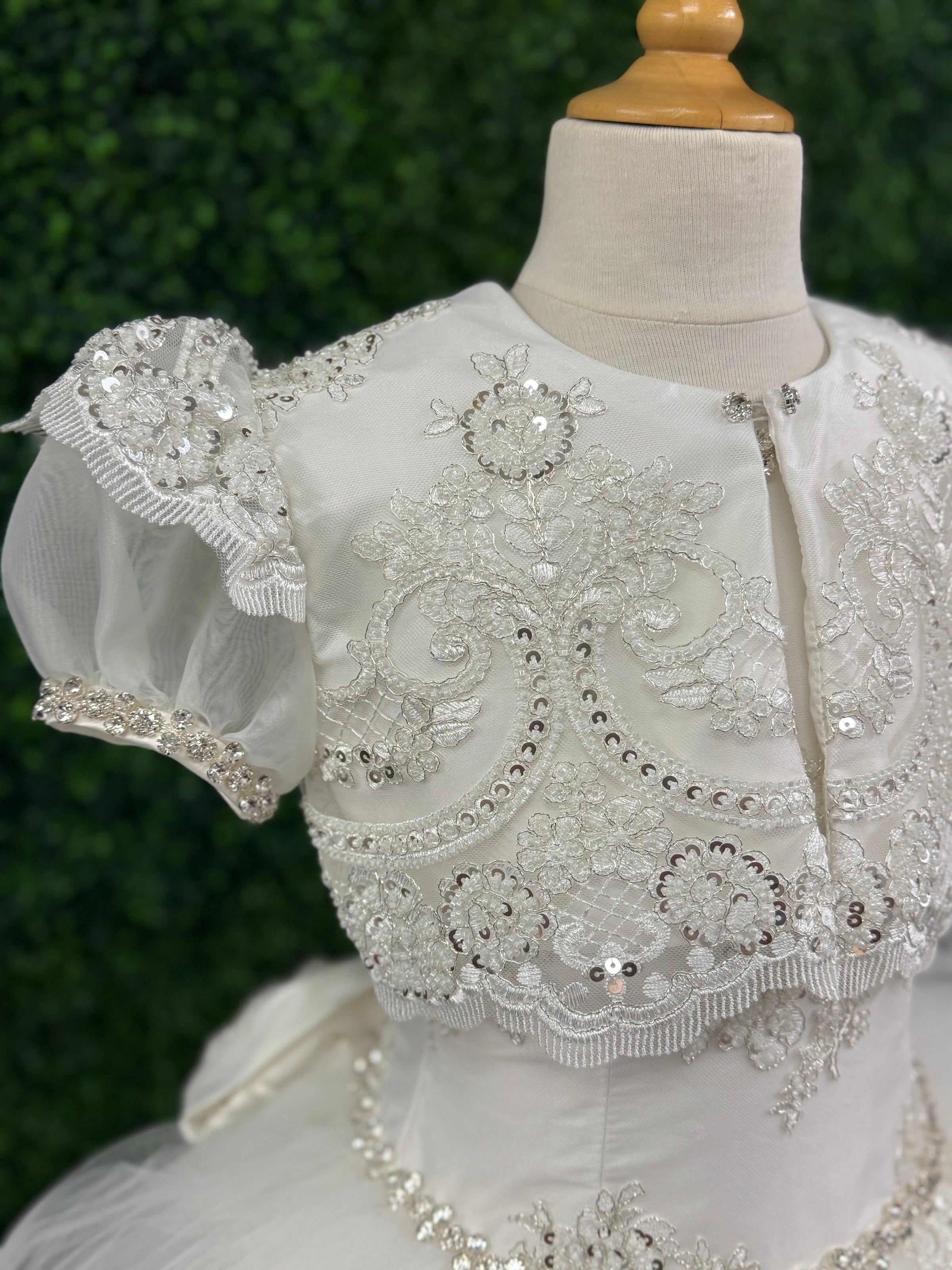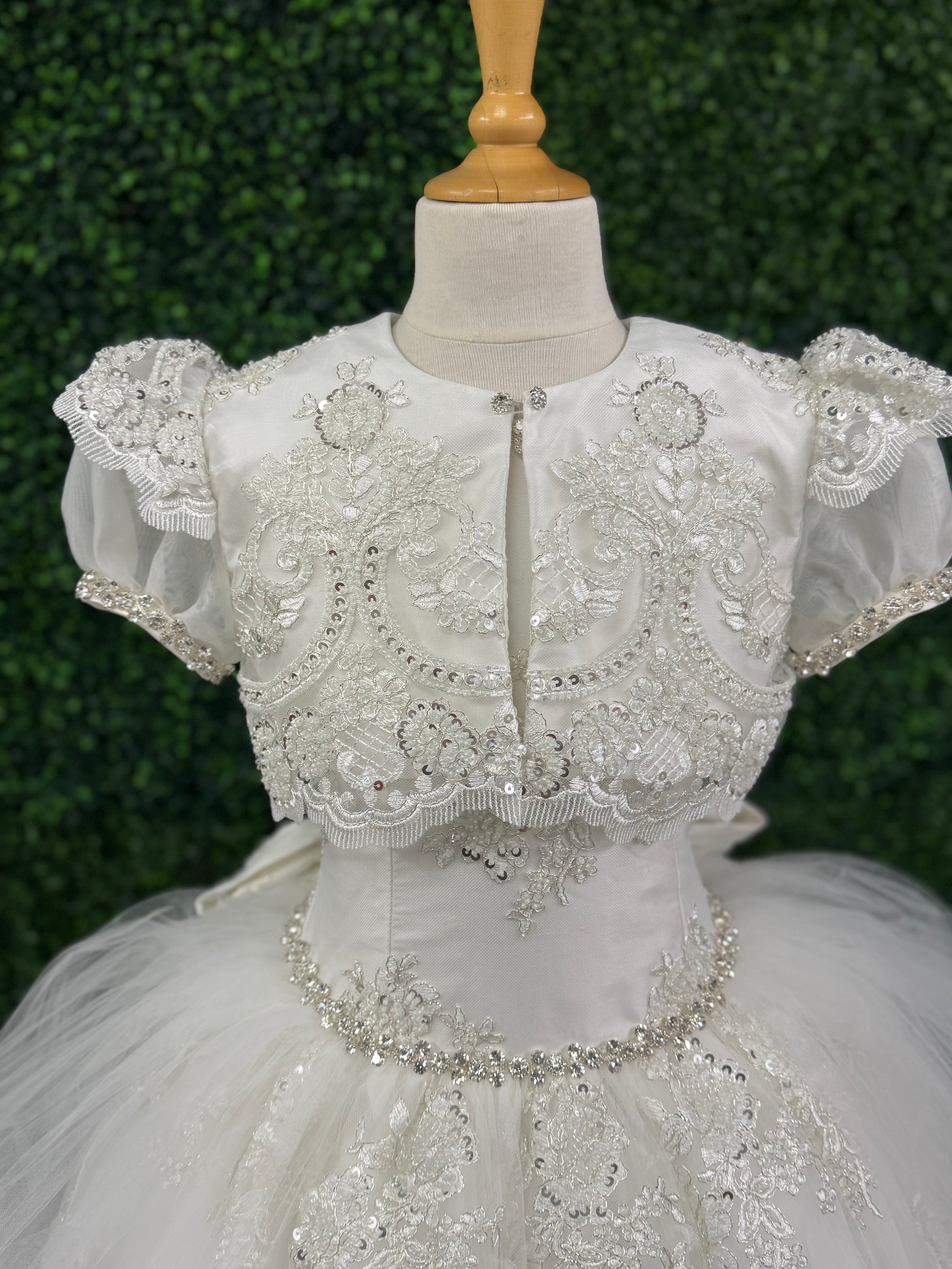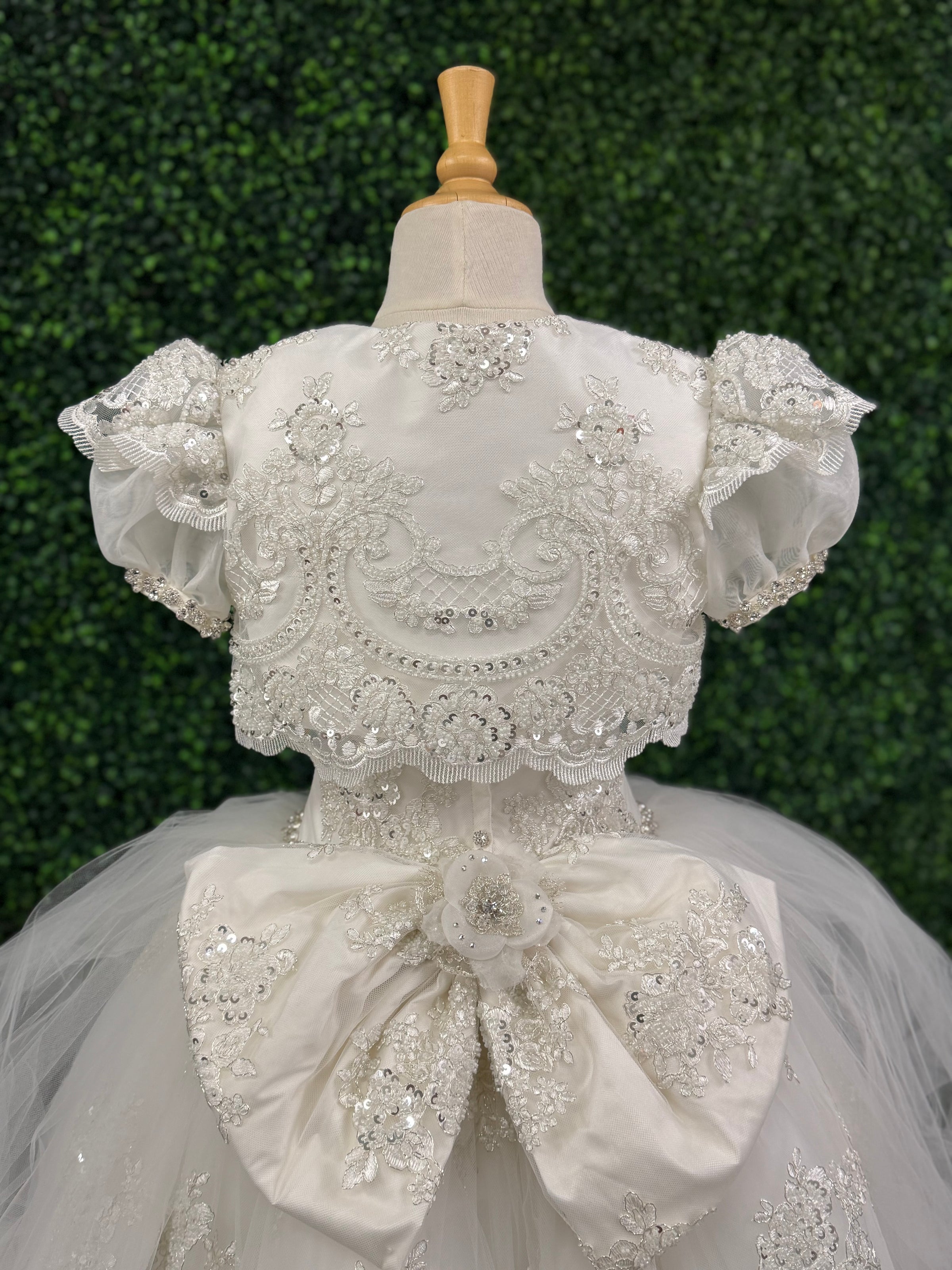 Christie Helene Grand Lorena Dress includes two looks in one.  Dress is made with a delicate beaded, embroidered french lace, rhinestone and pearl trim.  Tulle pickups for added drama!  Beautiful bow adorned with Loren rose.   Grand Lorena is perfectly paired with a matching removable bolero.