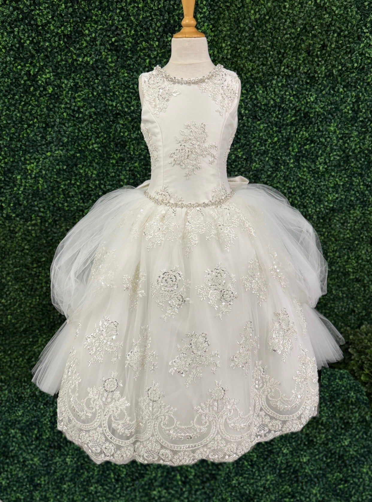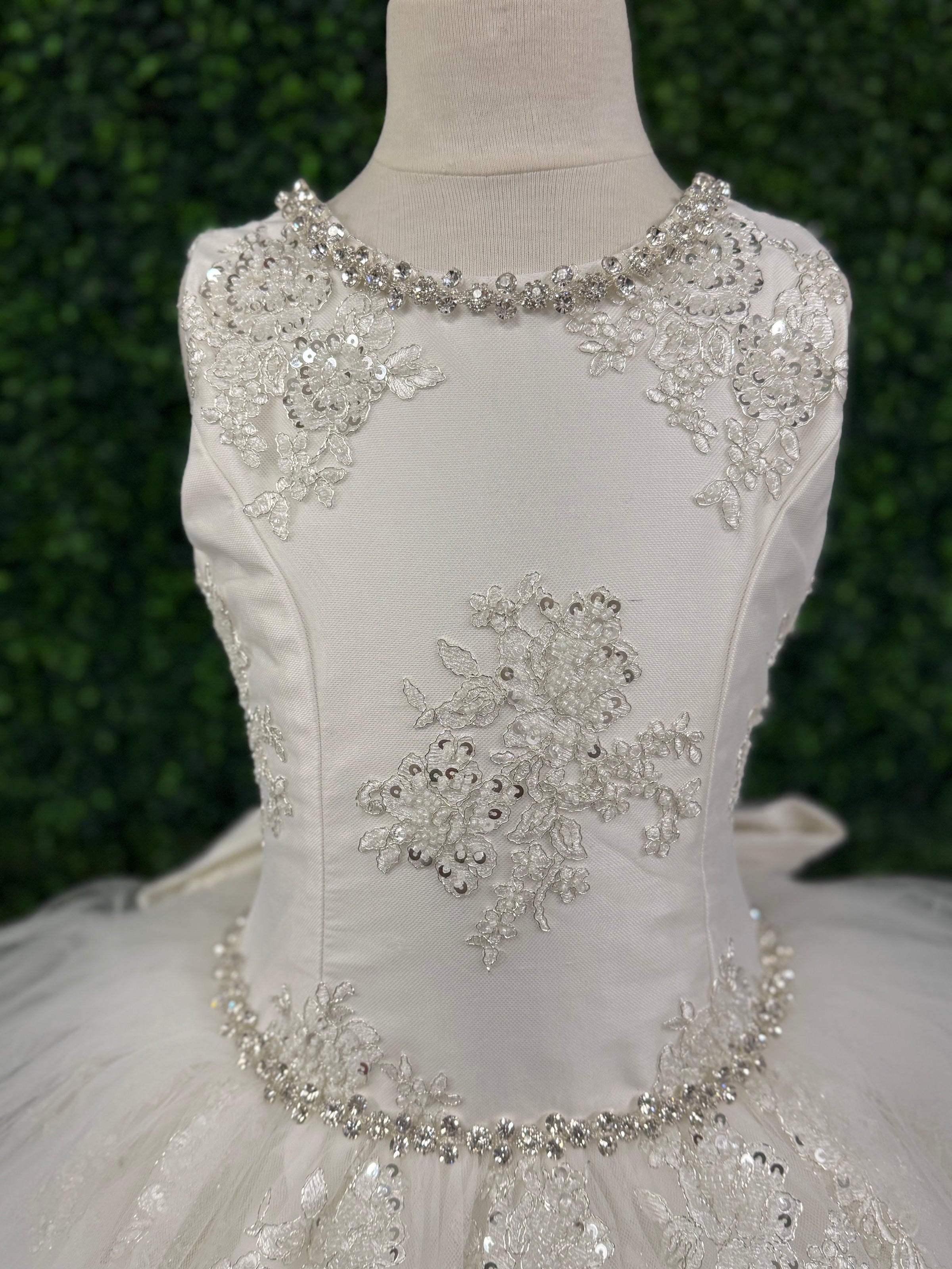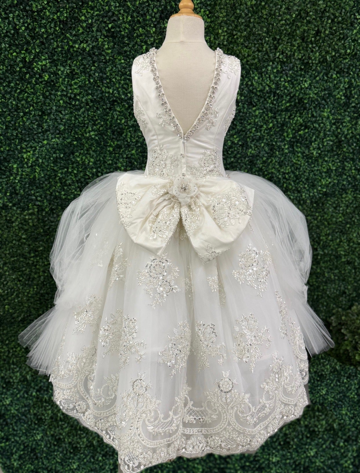 Christie Helene Grand Lorena Dress includes two looks in one.  Dress is made with a delicate beaded, embroidered french lace, rhinestone and pearl trim.  Tulle pickups for added drama!  Beautiful bow adorned with Loren rose.   Grand Lorena is perfectly paired with a matching removable bolero.