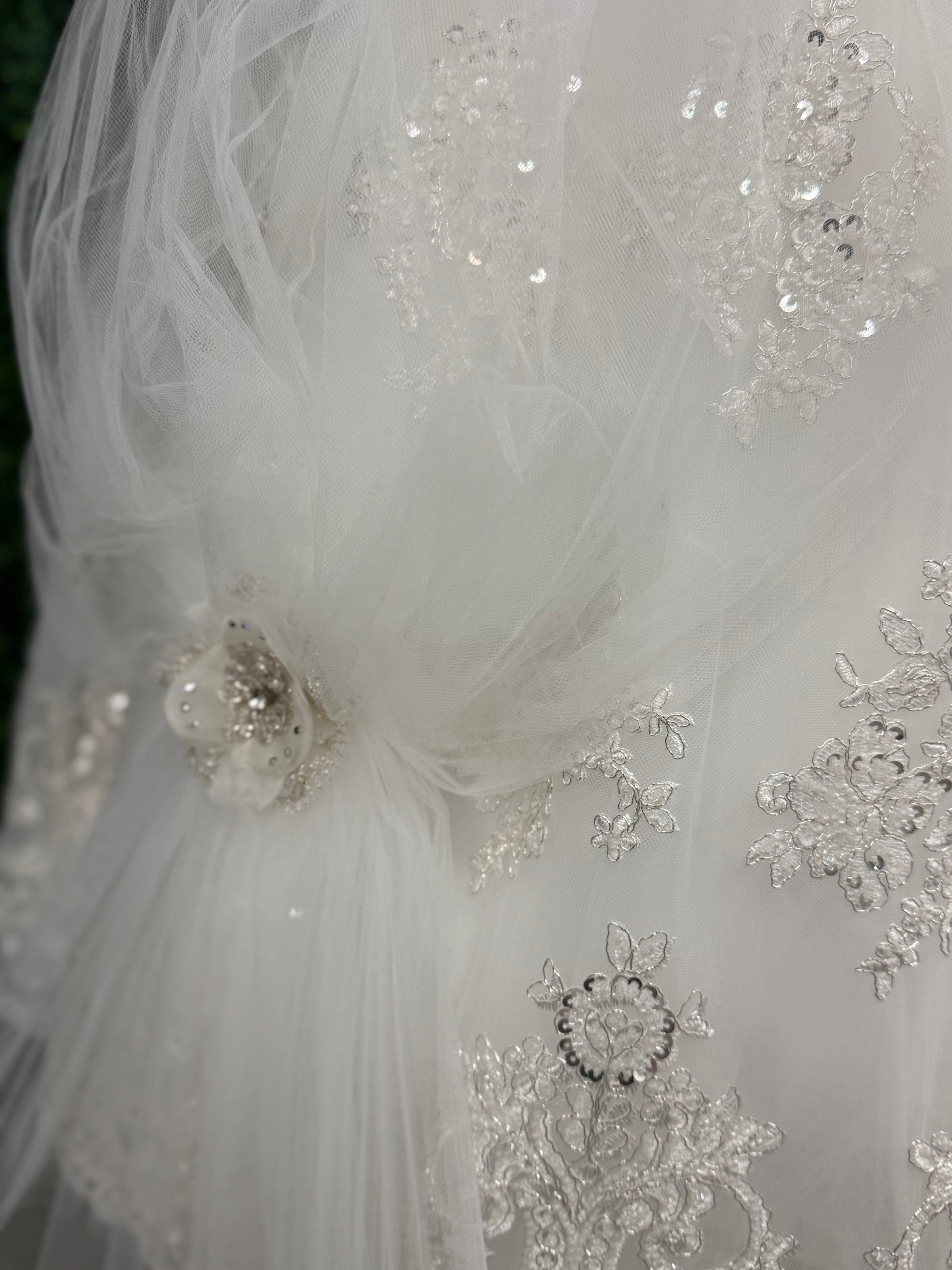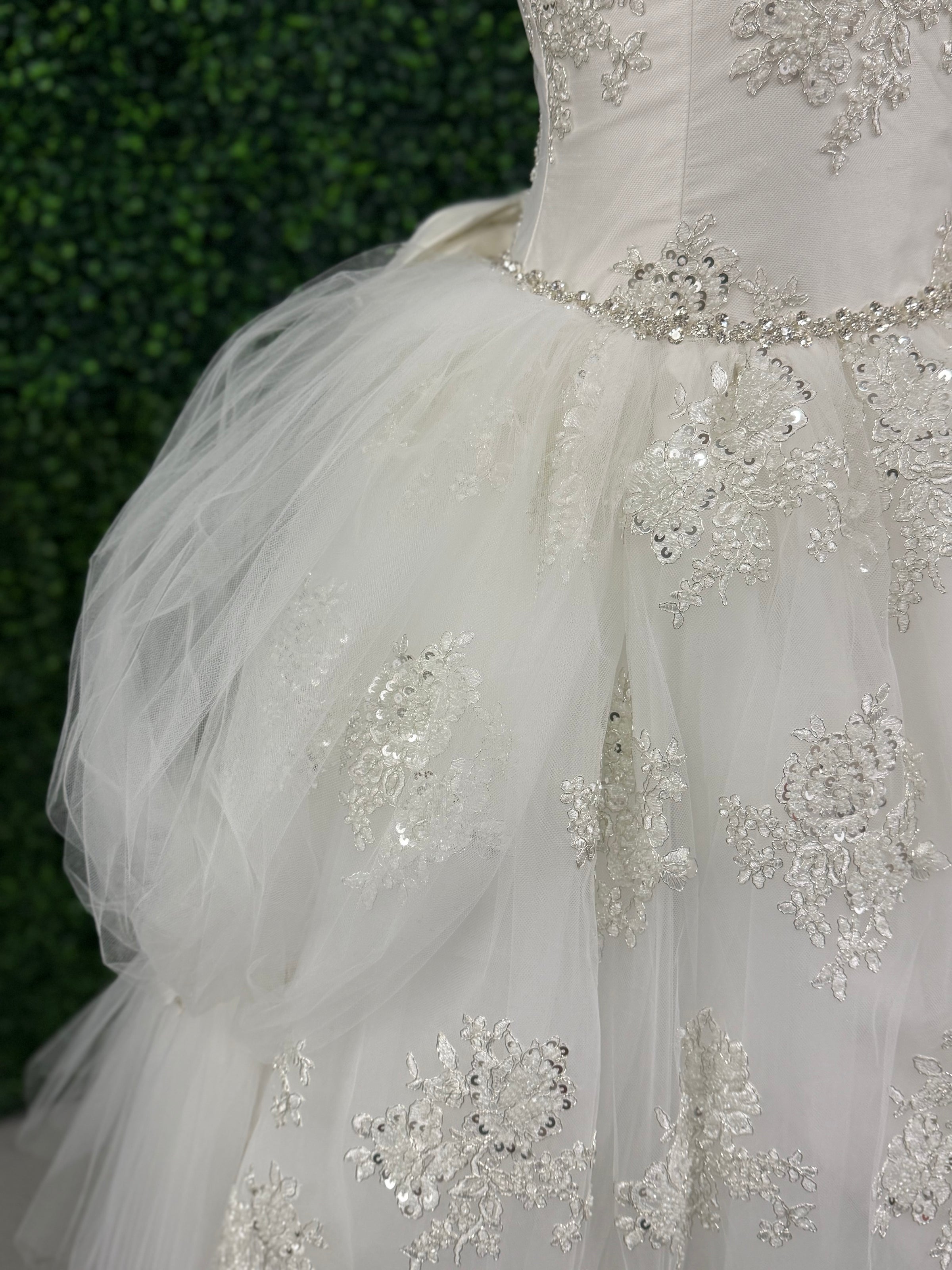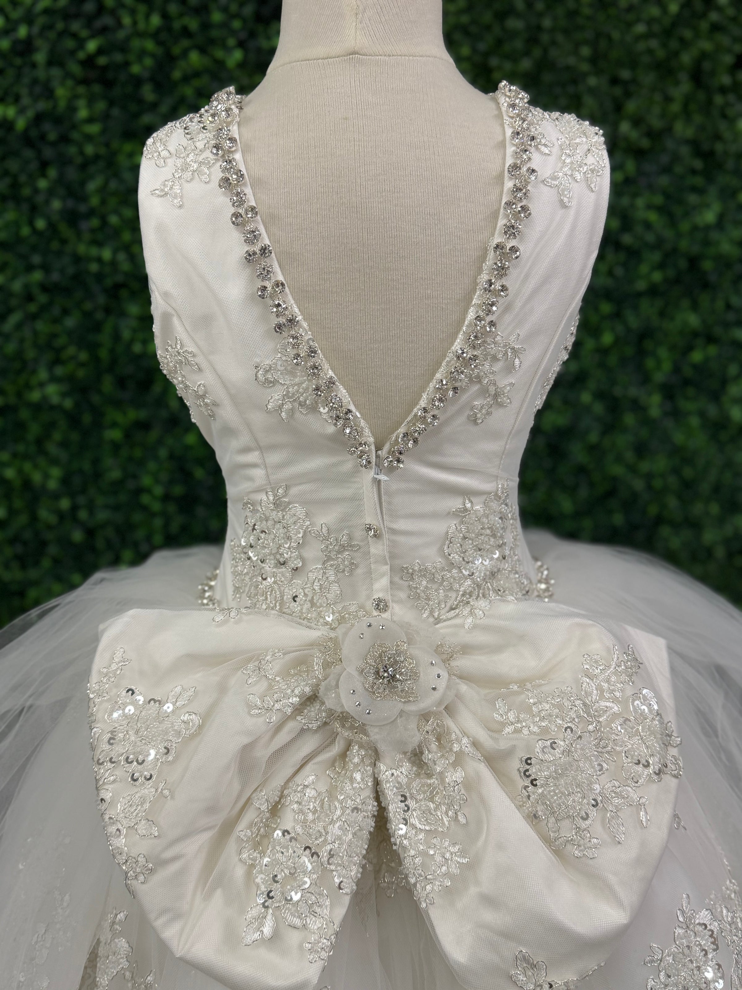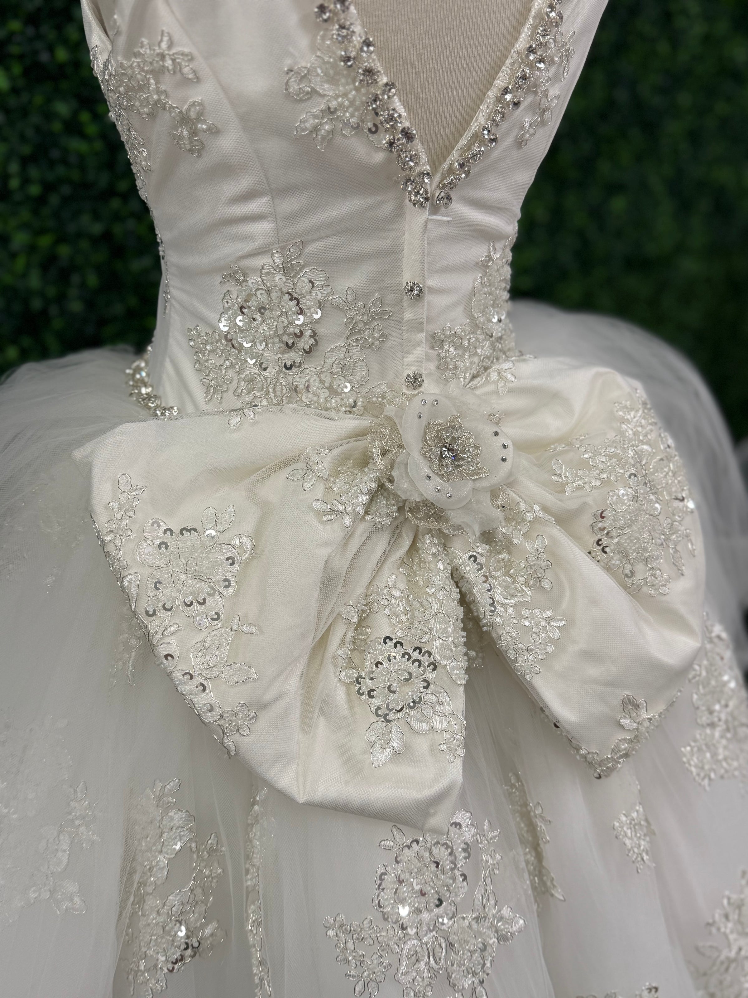 Christie Helene Grand Lorena Dress includes two looks in one.  Dress is made with a delicate beaded, embroidered french lace, rhinestone and pearl trim.  Tulle pickups for added drama!  Beautiful bow adorned with Loren rose.   Grand Lorena is perfectly paired with a matching removable bolero.