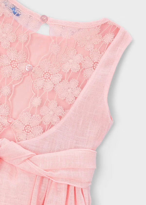 A charming sleeveless dress in a soft blush-pink hue, made from a light, textured fabric that gives it an airy feel. The bodice is simple and elegant, while the waist is highlighted with a sheer band and a delicate fabric flower accent on one side. The skirt falls into gentle gathers, ending in a scalloped lace hem with floral detailing that adds a touch of romance. Overall, it’s a sweet and dressy piece, perfect for special occasions or warm-weather celebrations.