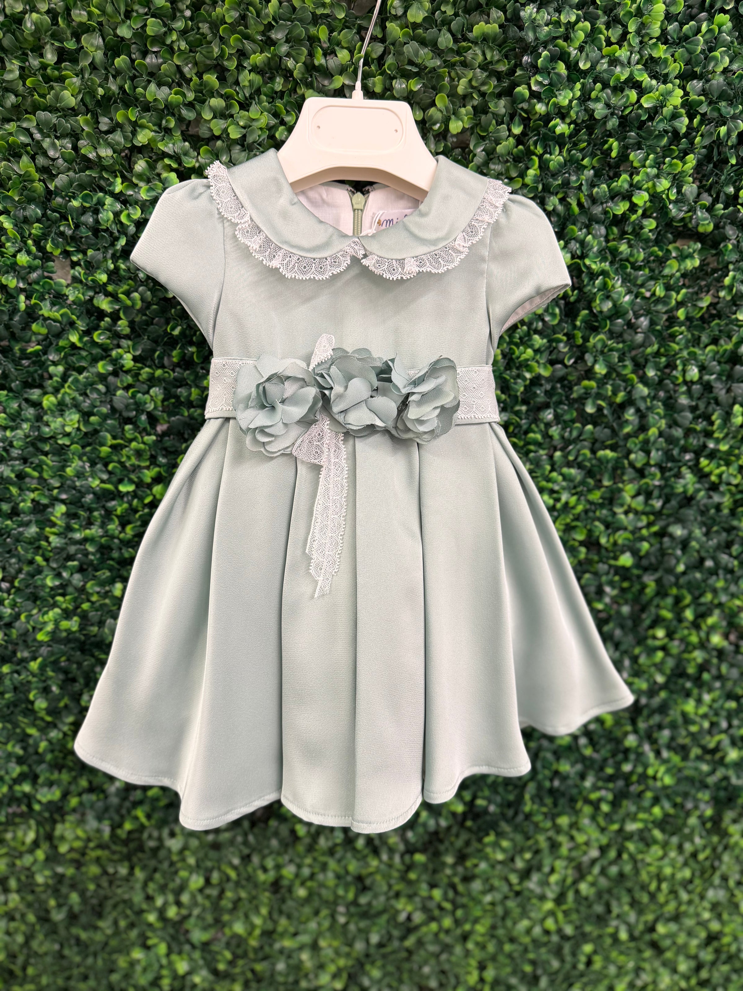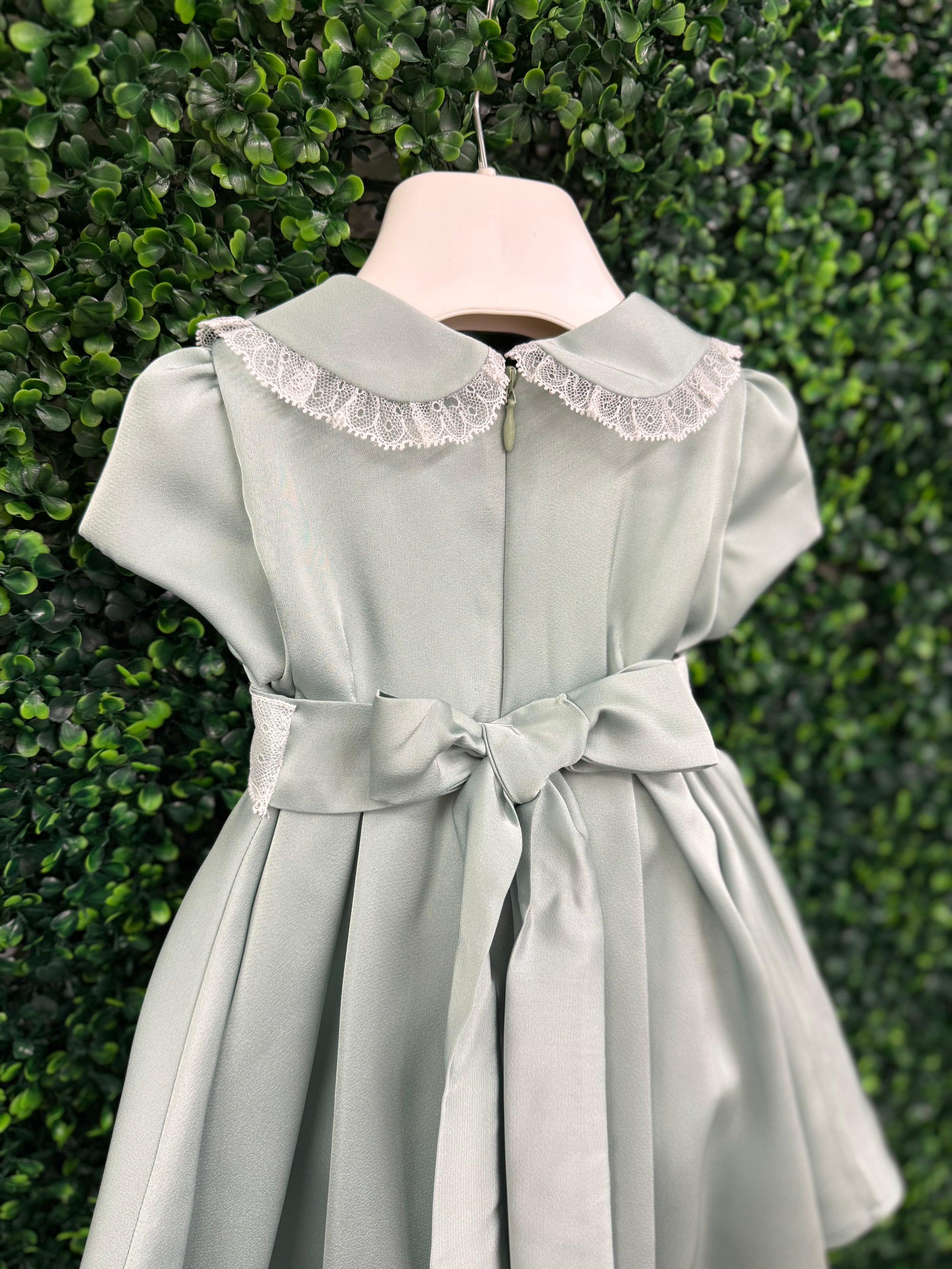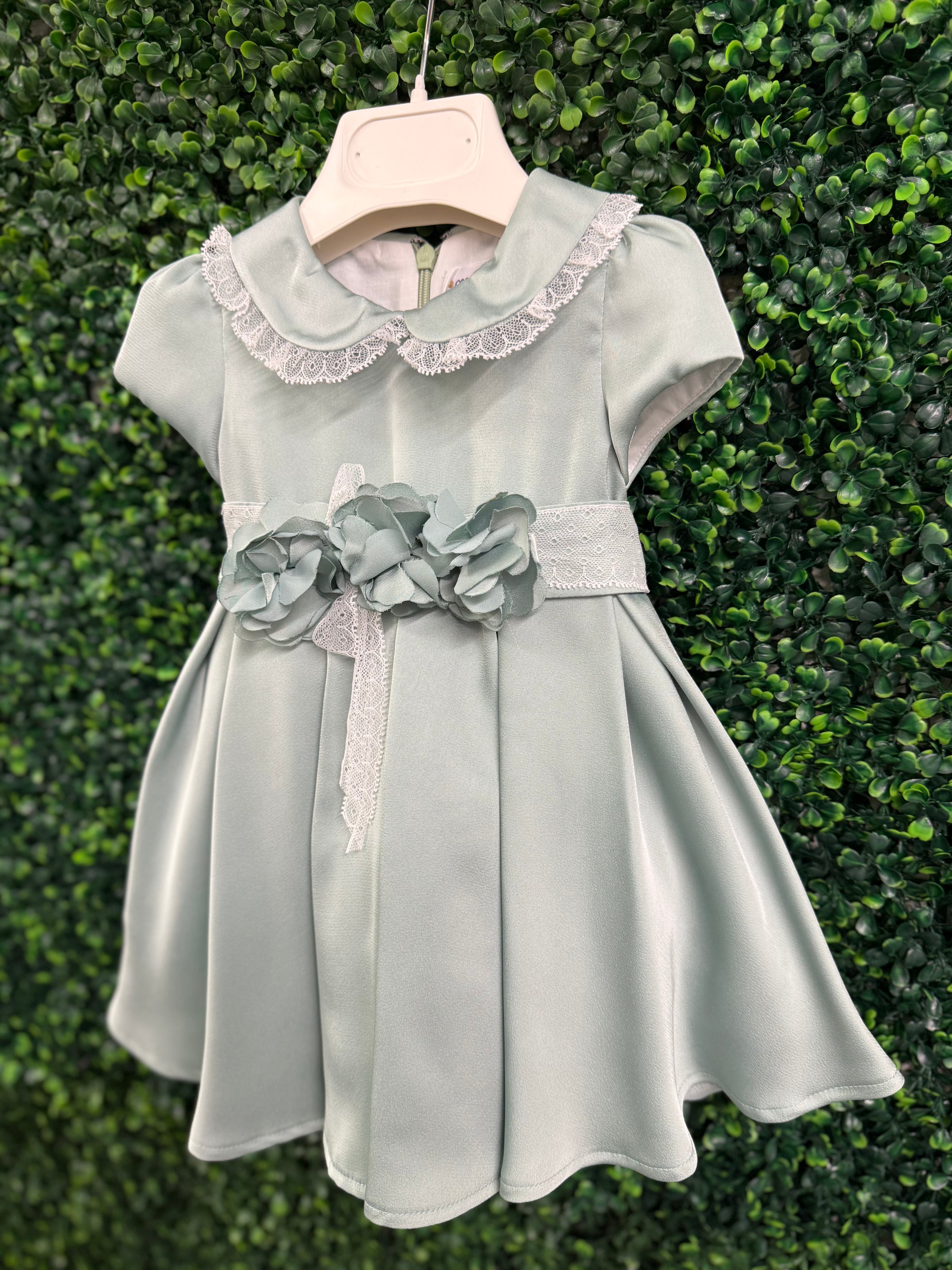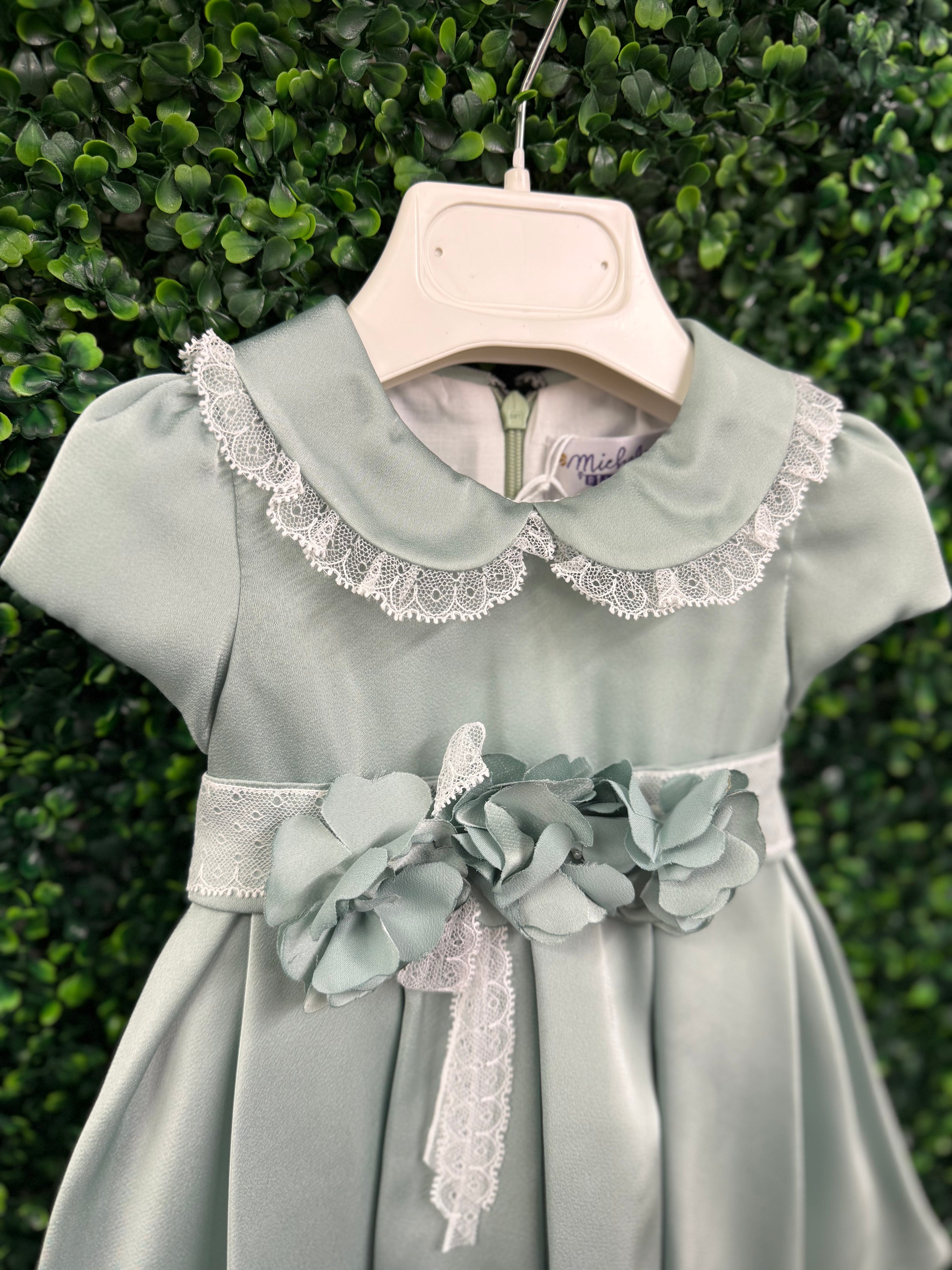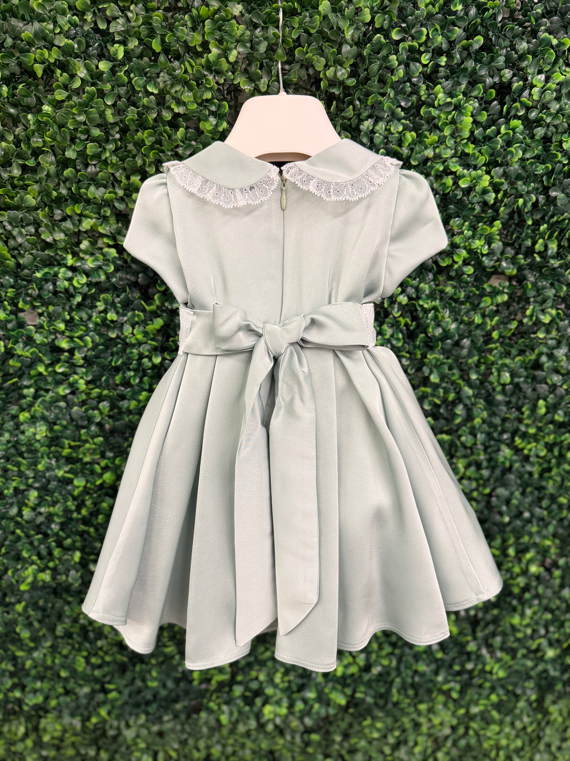 Timeless elegance meets delicate craftsmanship in this exquisite dress by Michelina Bimbi. Designed in a luxurious satin crepe fabric, this piece features a soft sage hue that feels both refined and effortlessly graceful.  The classic Peter Pan collar is adorned with intricate lace trim, adding a touch of vintage charm, while the beautifully structured silhouette creates a full, flowing skirt.  At the waist, a lace band is accented with handcrafted floral appliqués and a soft sash detail, offering a romantic, couture-inspired finish.  The back is completed with a statement bow, ensuring a picture-perfect look from every angle.