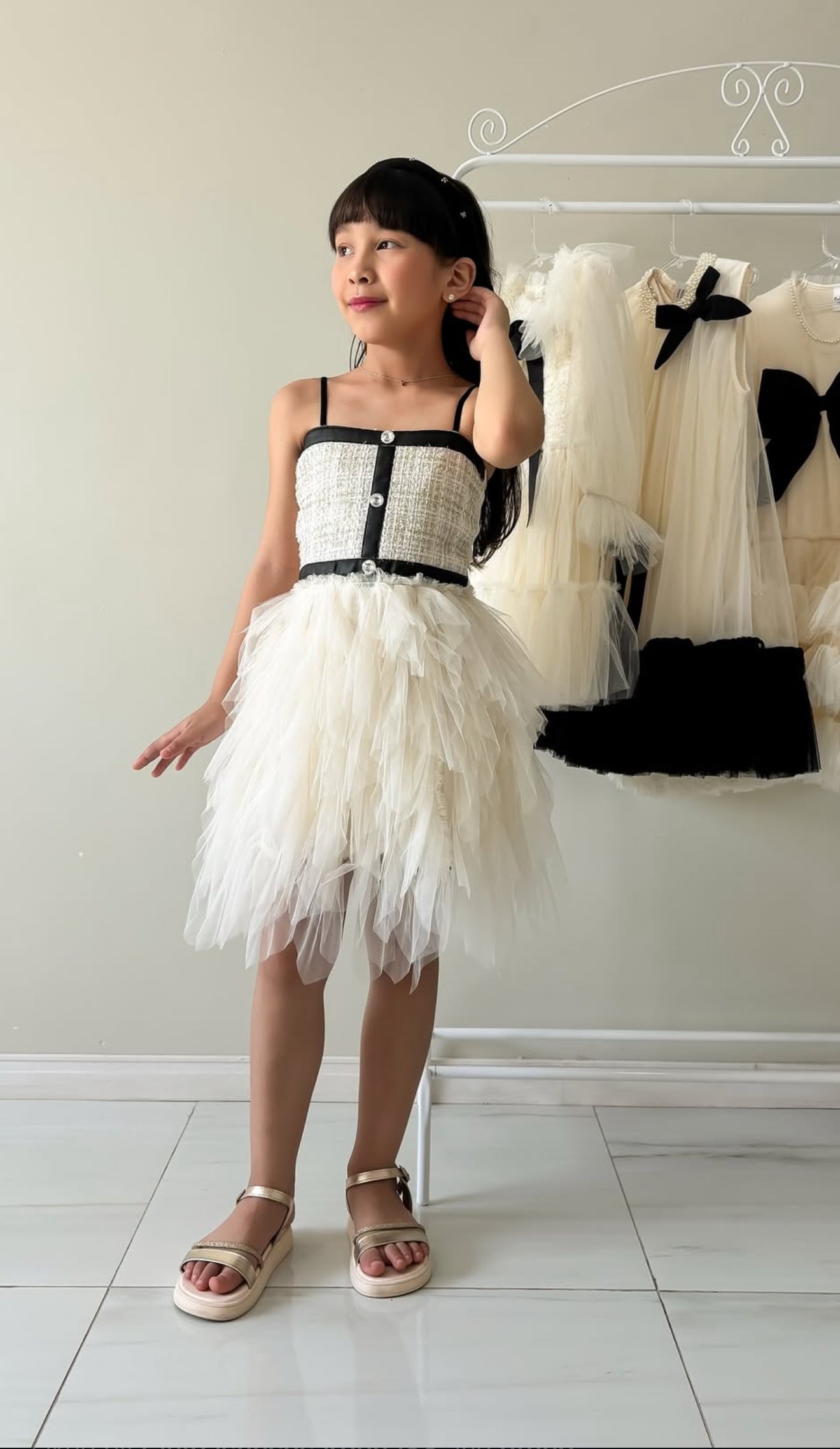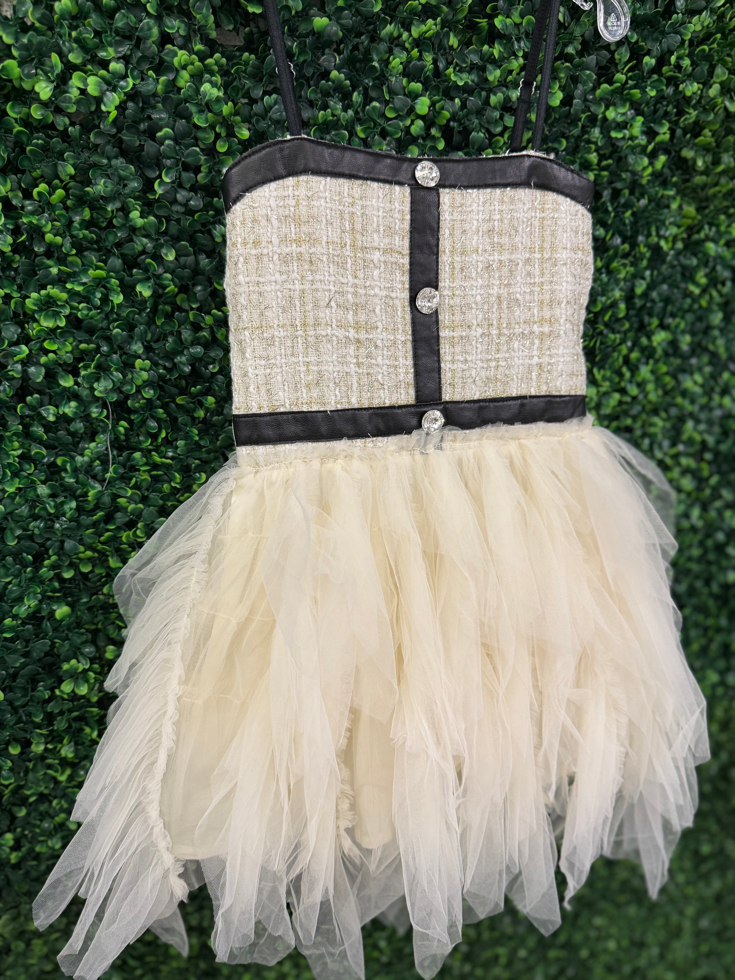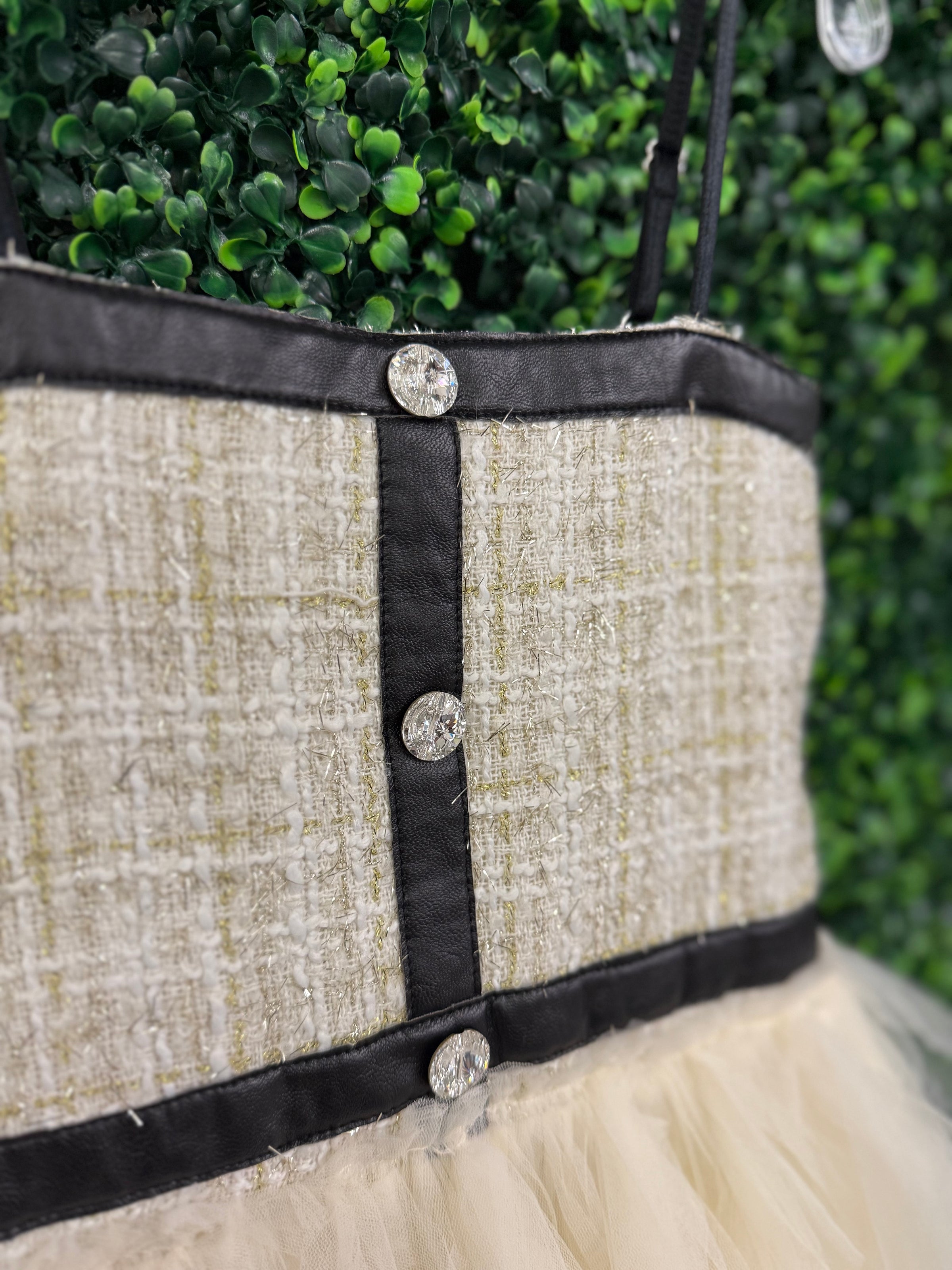 Elevate your little one’s wardrobe with this gorgeous two piece set. The lux ivory and gold tweed color makes it perfect for any event. The dress features a modern relaxed fit with adjustable straps and faux leather detailin. Swavorski crystal buttons adorn the dress and the lady jacket. Dress is soft and comfortable. Elastic waistband with a beautiful asymmetrical tulle skirt perfect for twirling!