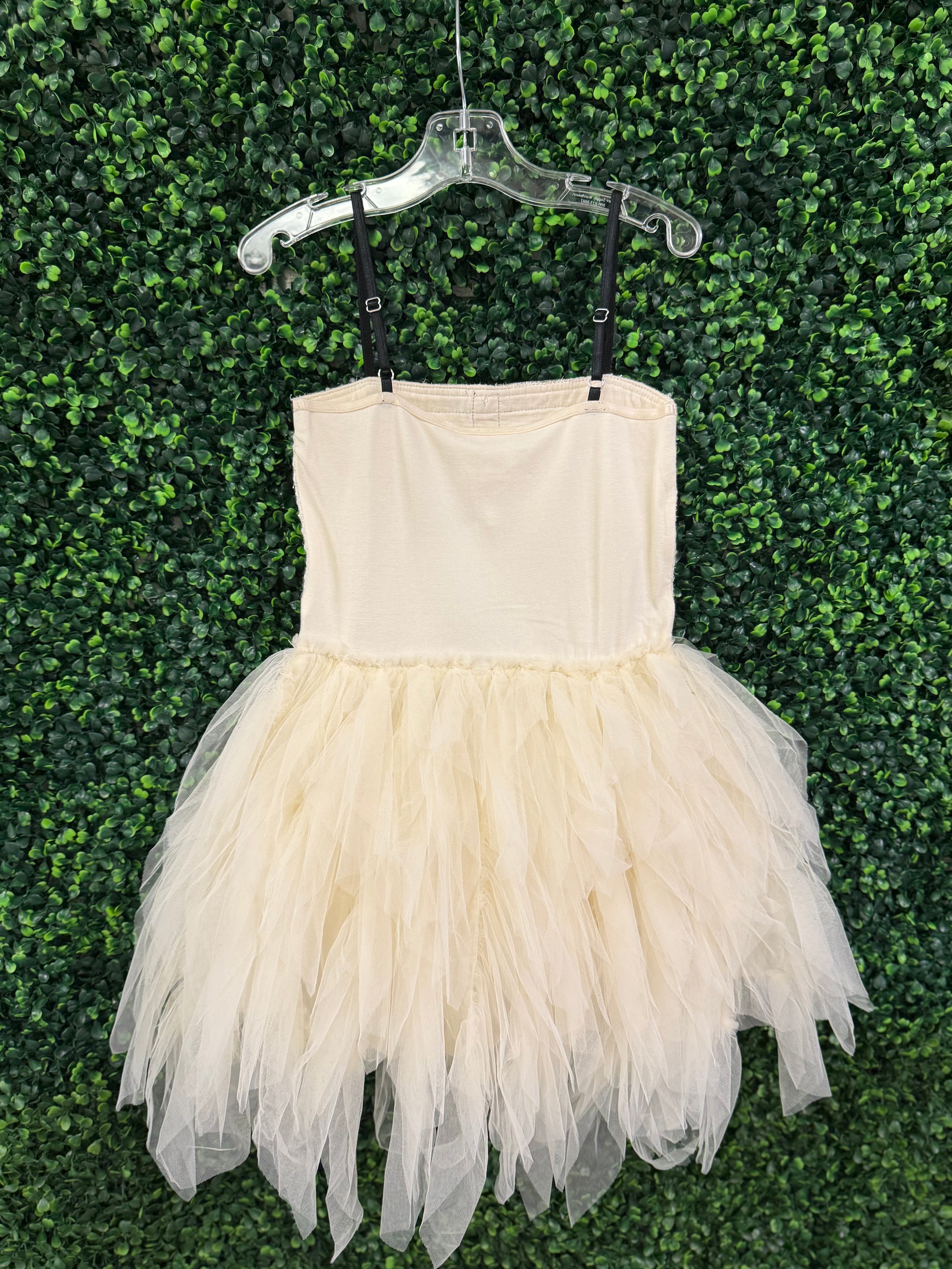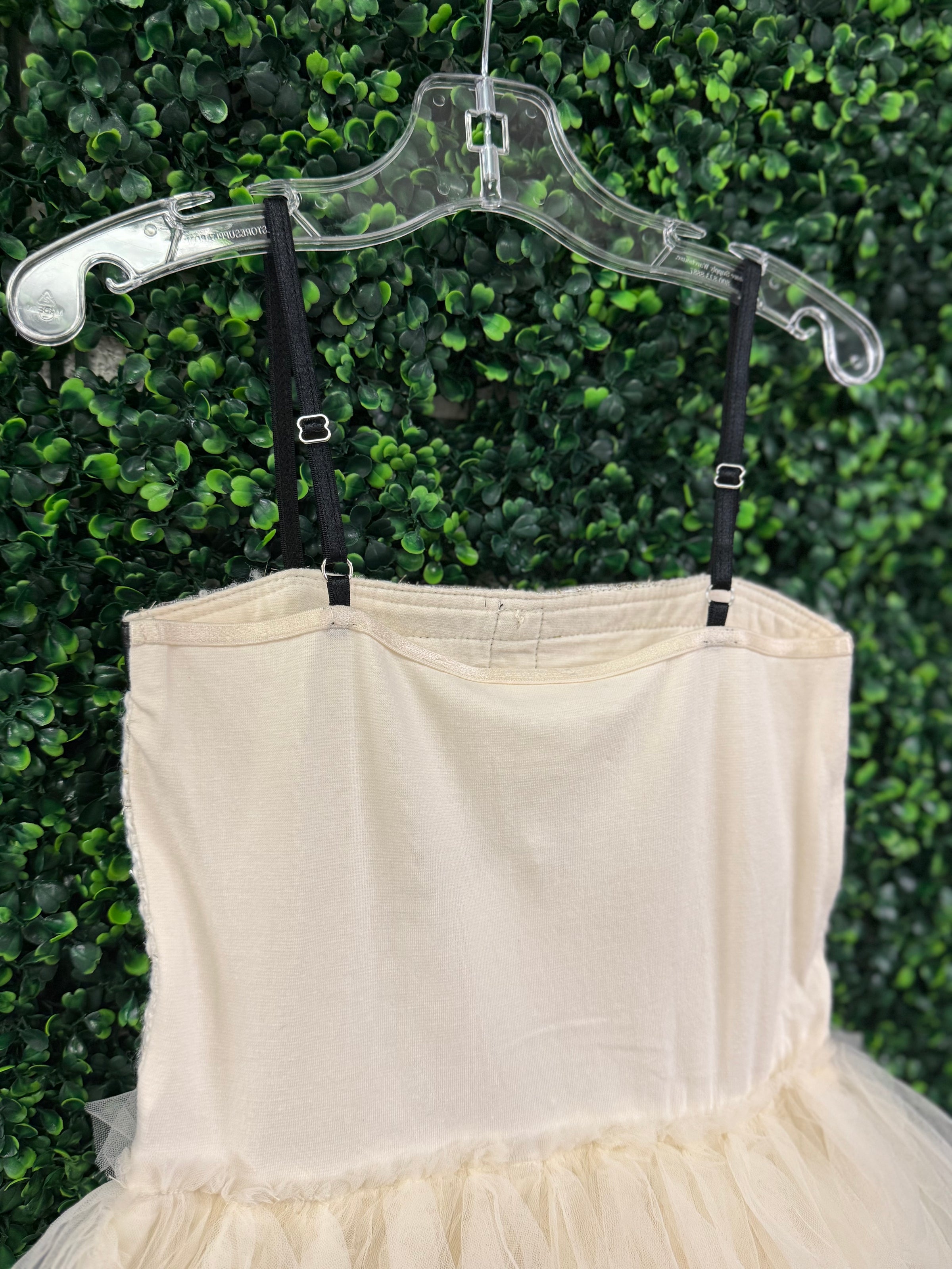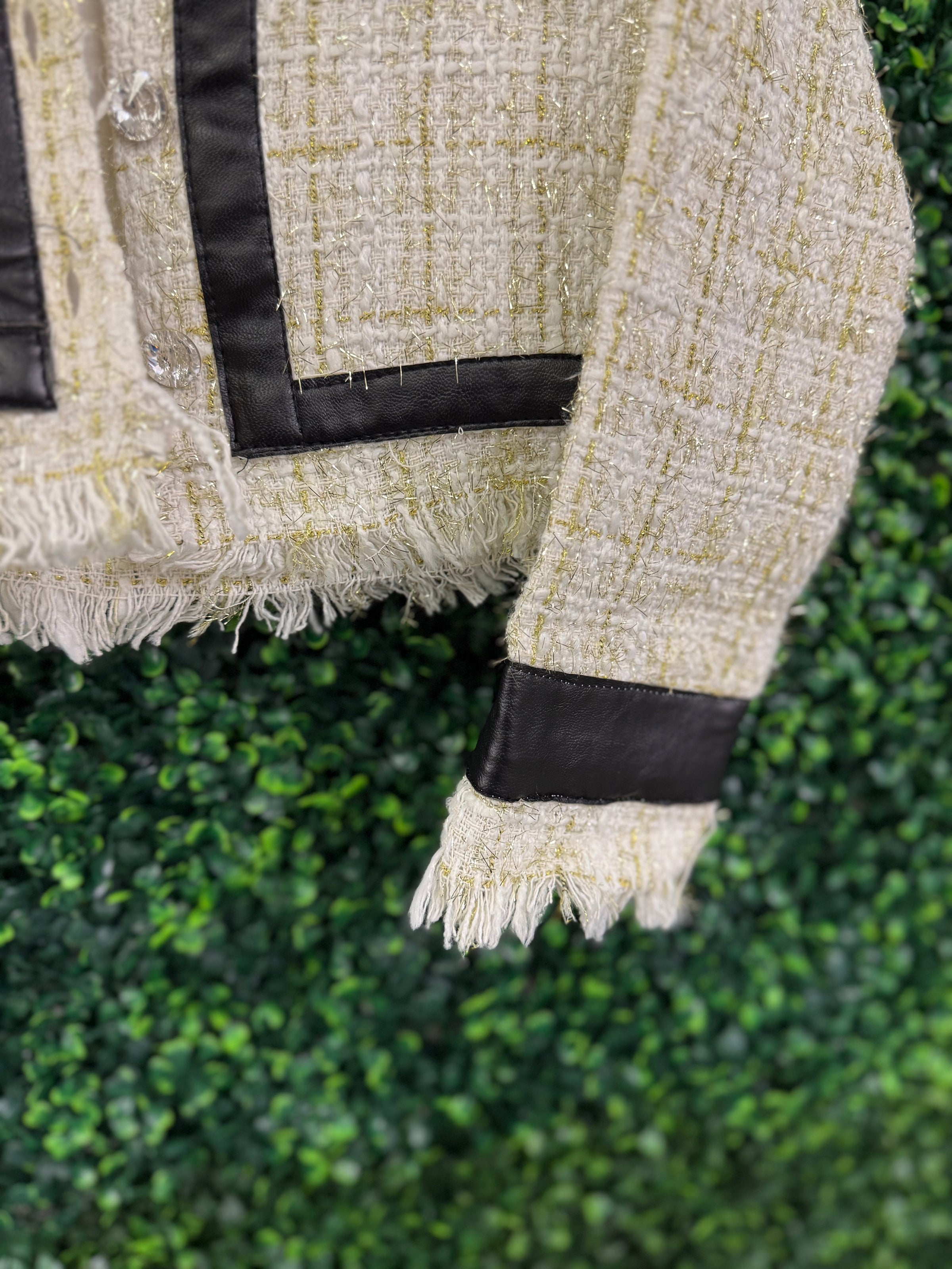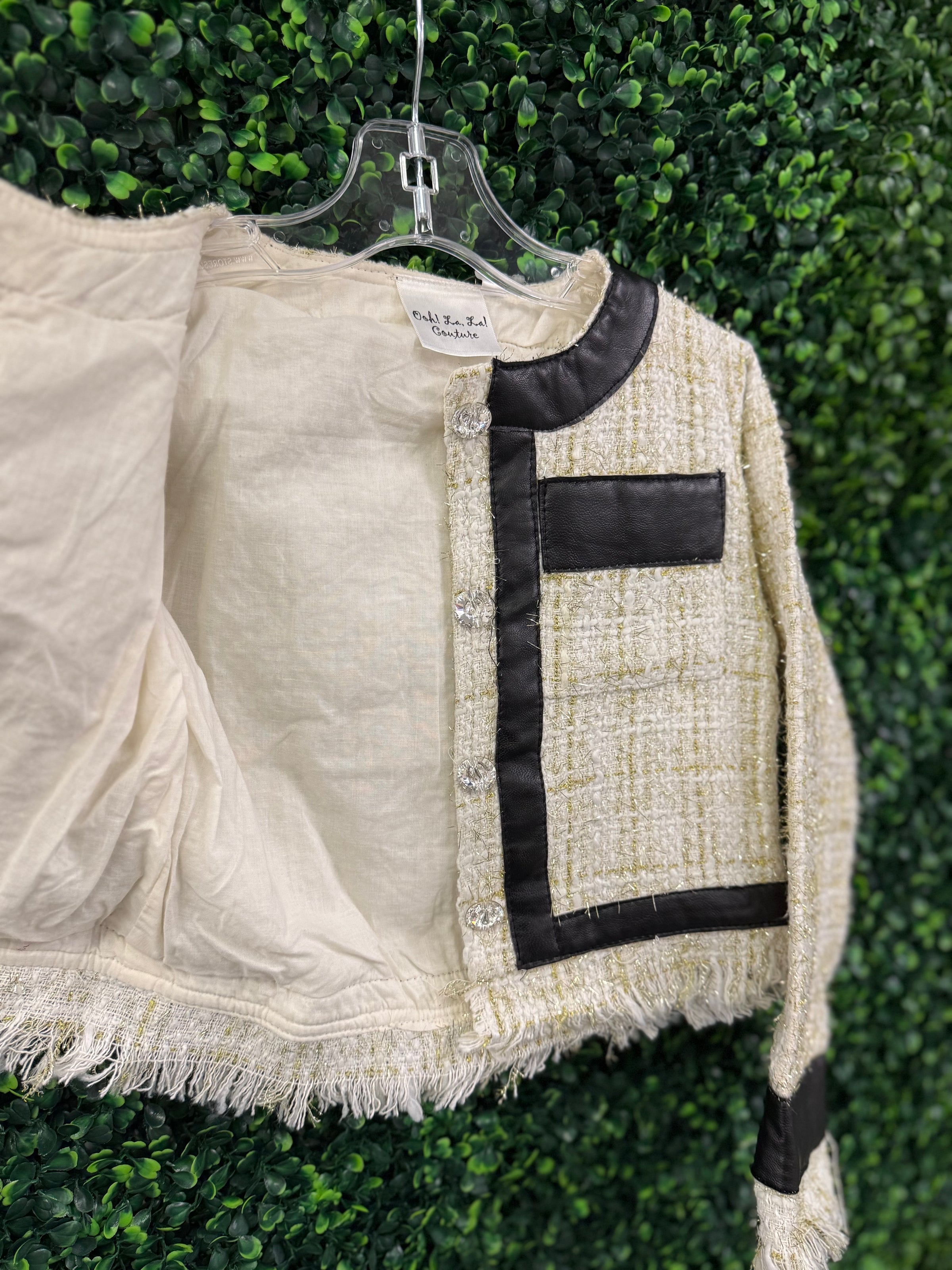 Elevate your little one’s wardrobe with this gorgeous two piece set. The lux ivory and gold tweed color makes it perfect for any event. The dress features a modern relaxed fit with adjustable straps and faux leather detailin. Swavorski crystal buttons adorn the dress and the lady jacket. Dress is soft and comfortable. Elastic waistband with a beautiful asymmetrical tulle skirt perfect for twirling!