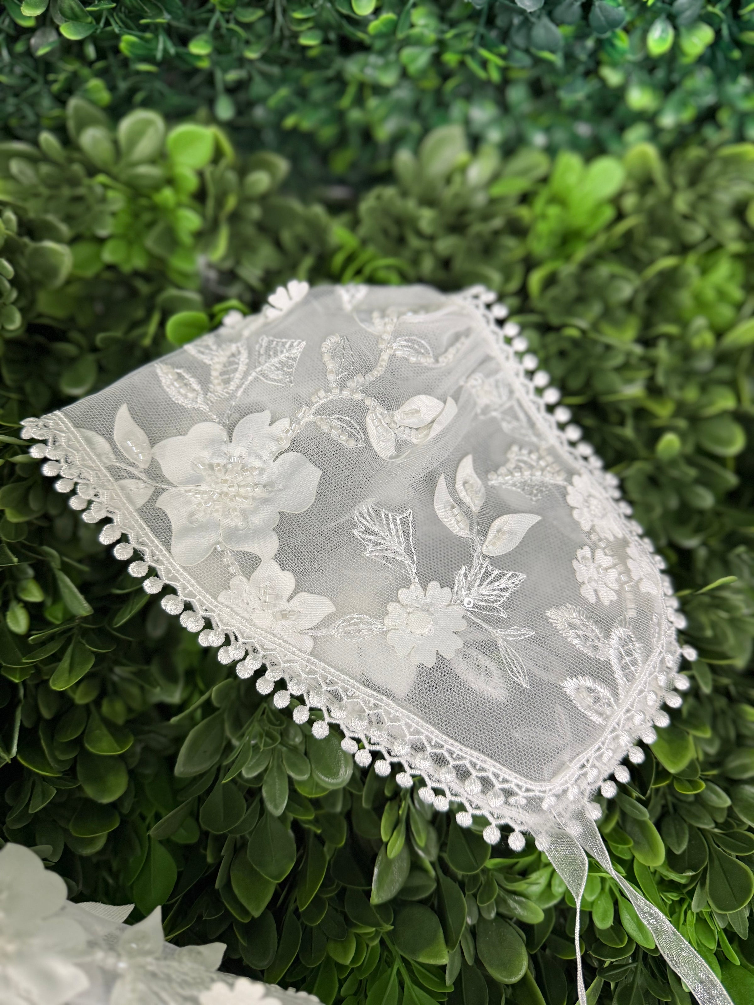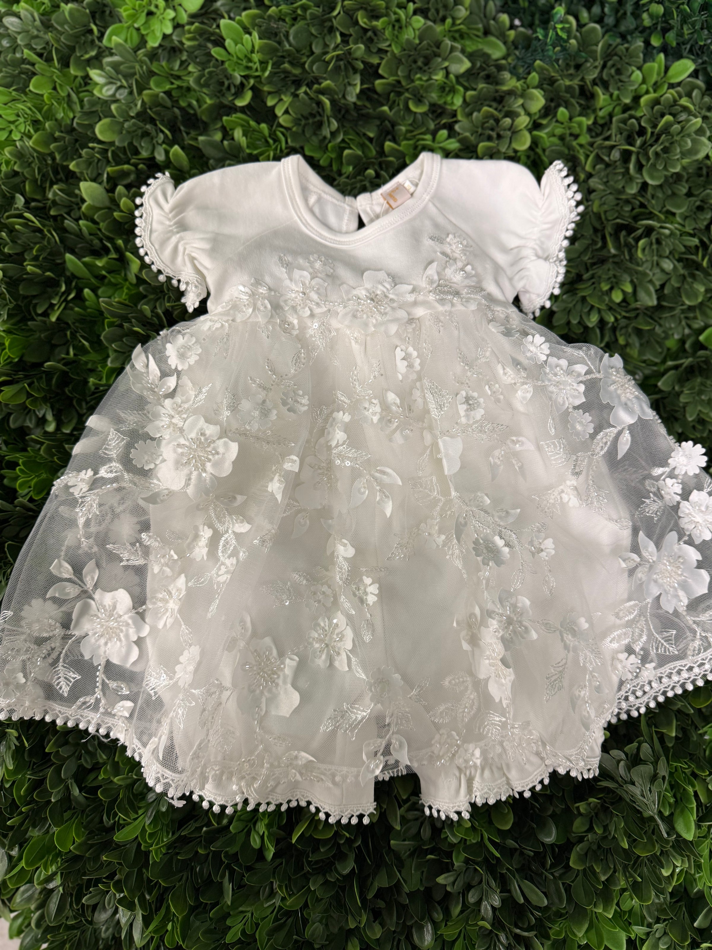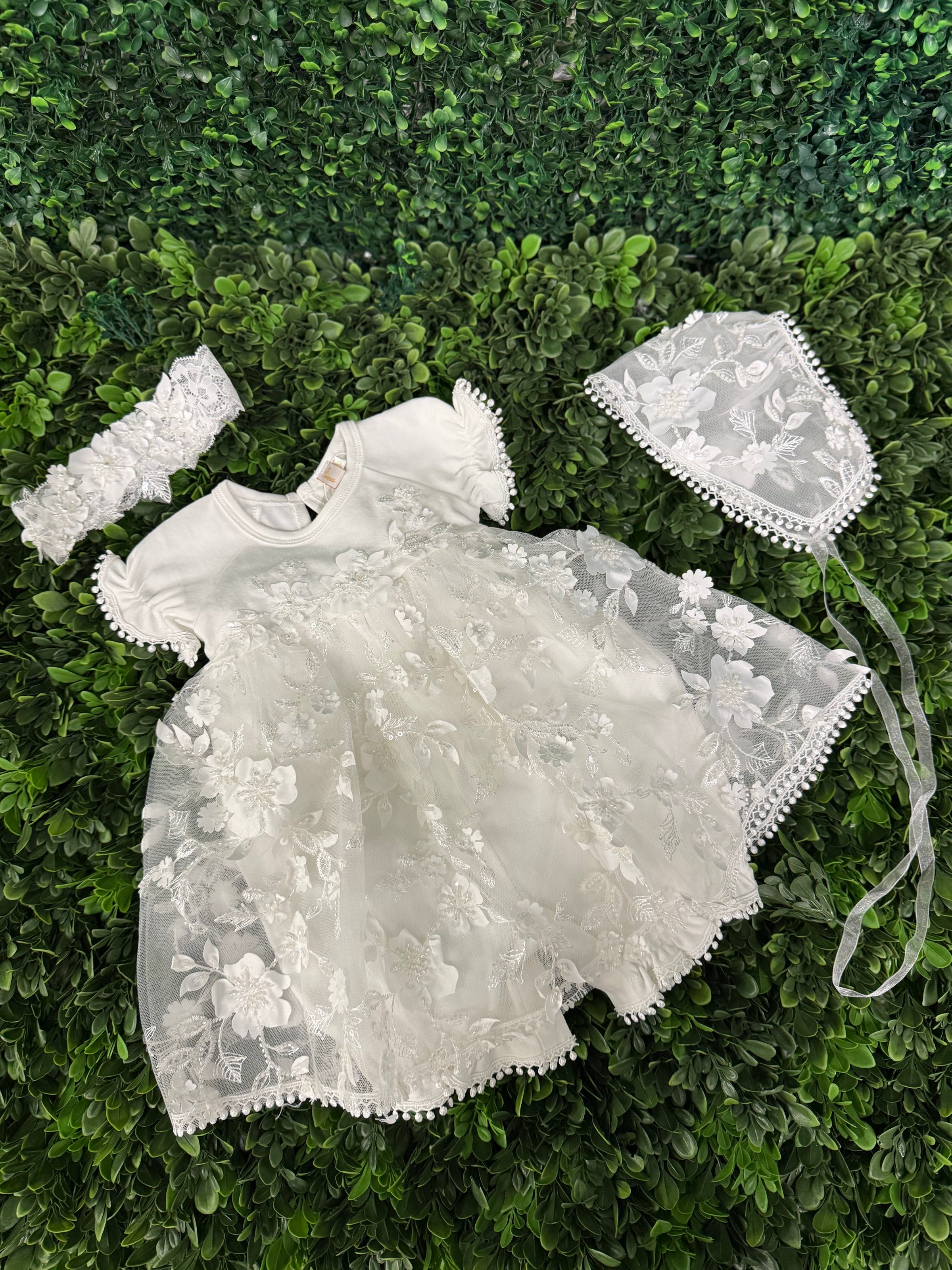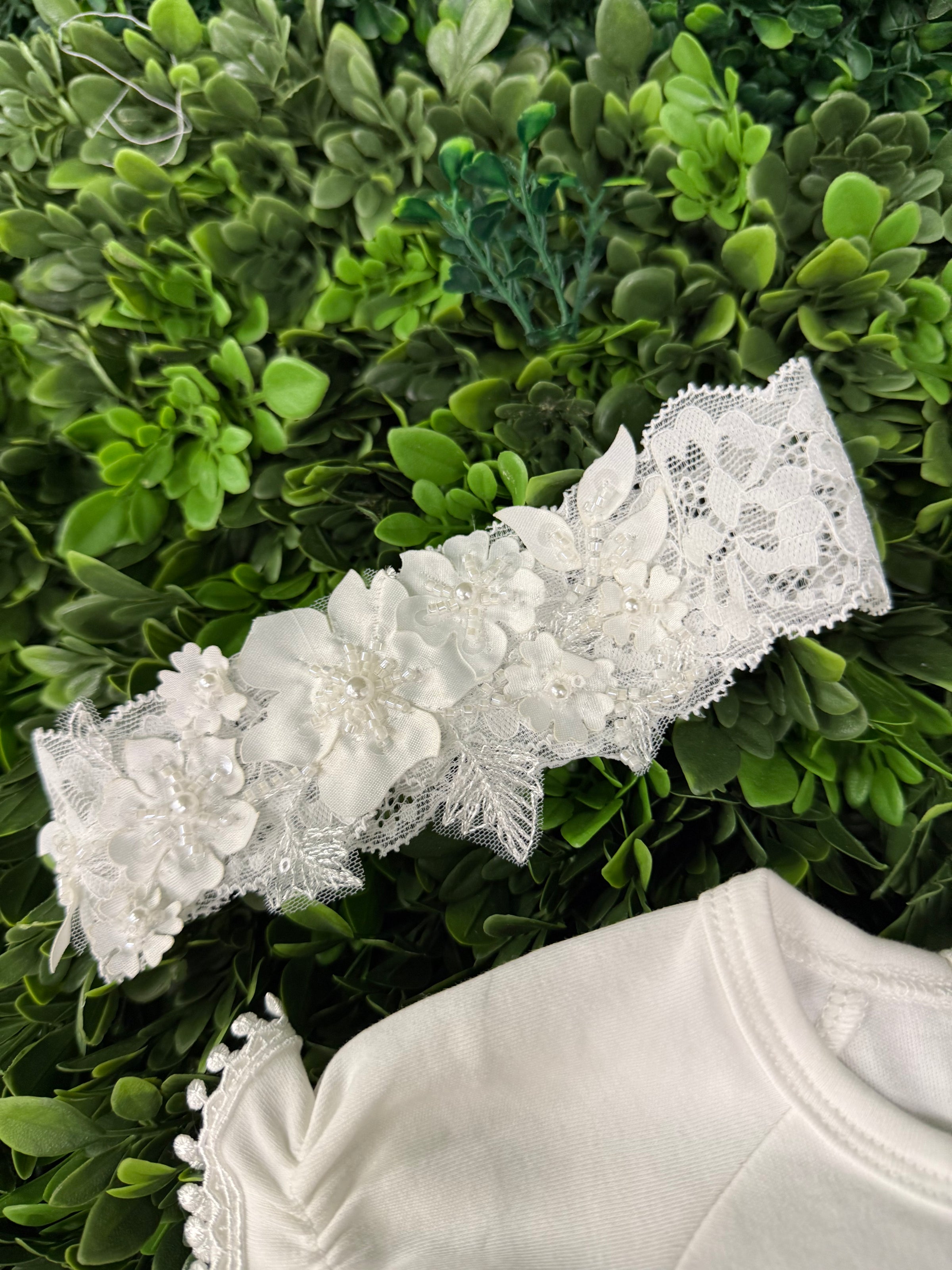 Perfect changing outfit for your little girl for her Baptism. This romper dress is perfectly comfortable and provides an illusion of a dress with the comfort of cotton pants. This set includes the outfit, bonnet, booties, and headband.